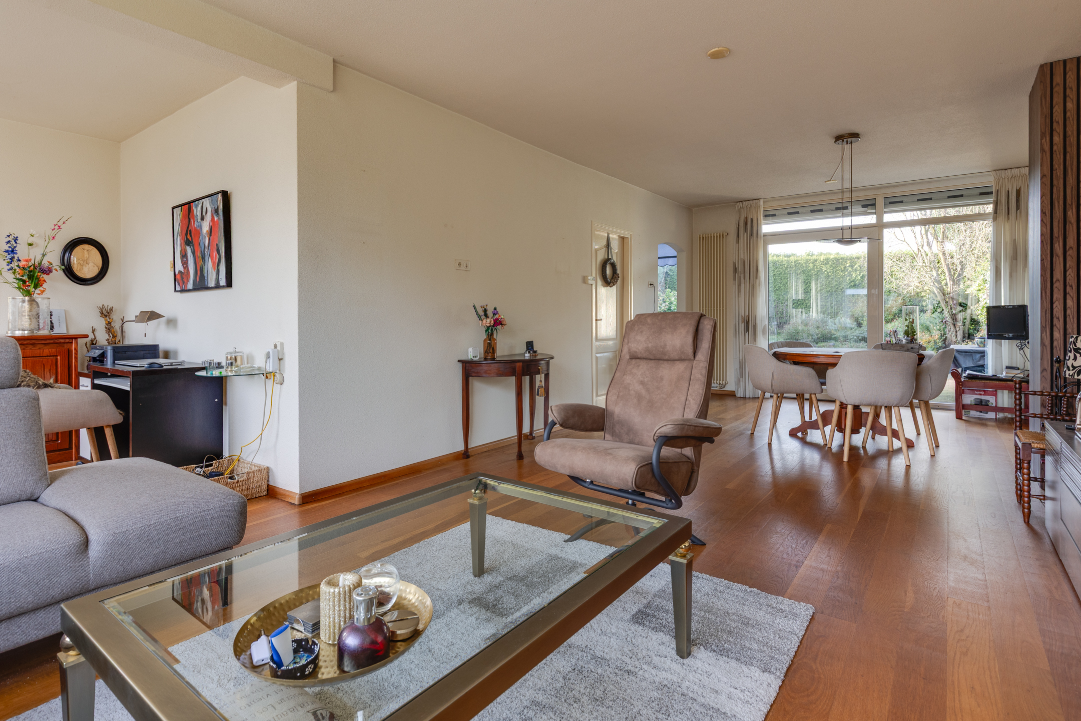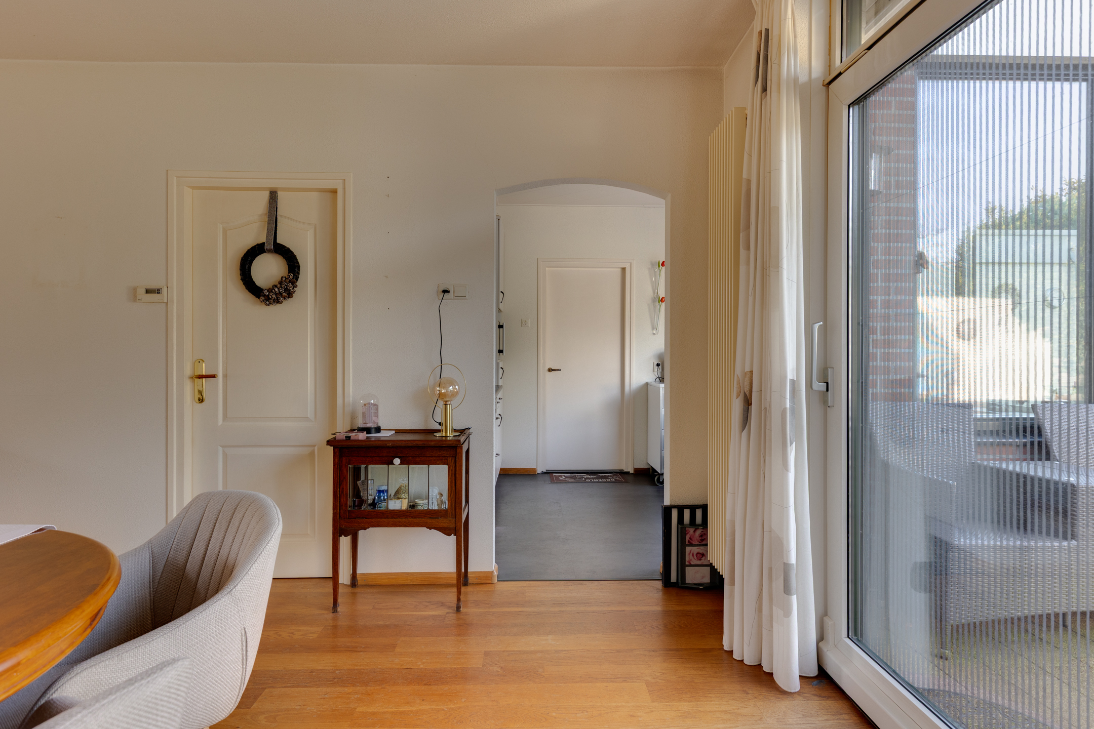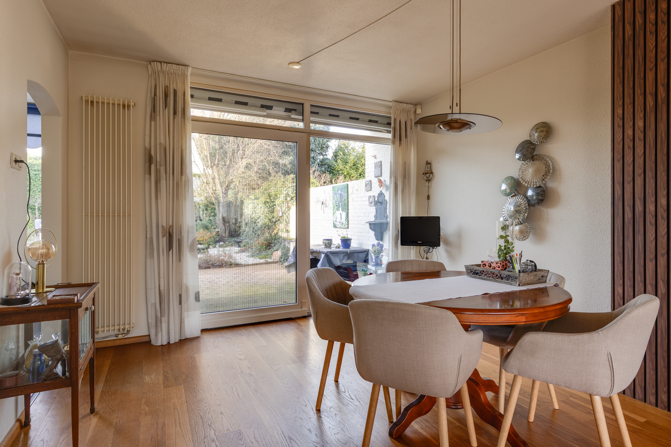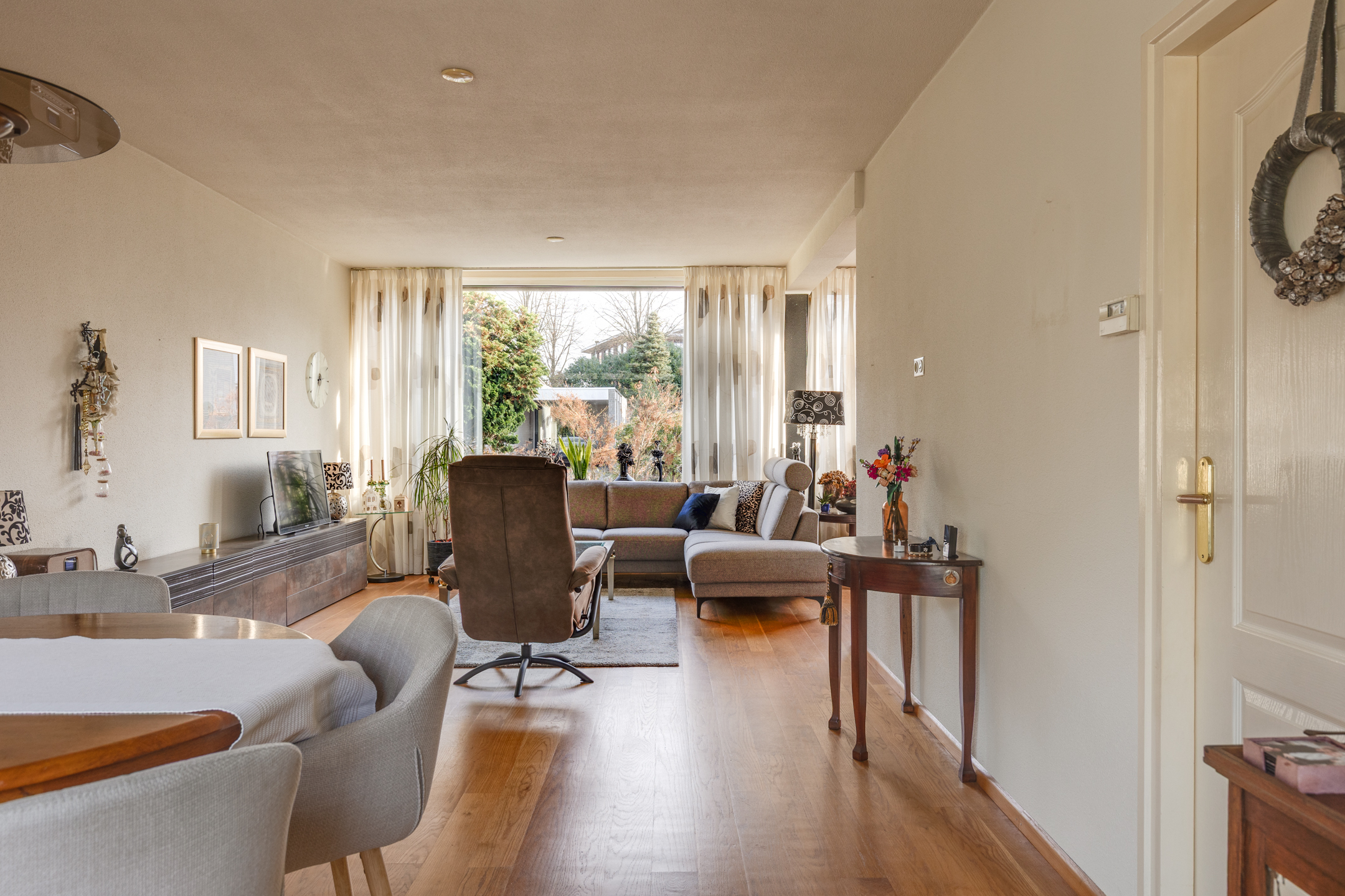 Bij binnenkomst in de woonkamer verrast je direct de lichtinval op, dankzij de grote raampartijen aan zowel de voor- als de achterzijde, geniet je de hele dag van een natuurlijke lichtinval. Bij het eetgedeelte biedt een grote schuifpui toegang en fraai uitzicht naar de verzorgde, volledig groen omheinde achtertuin.