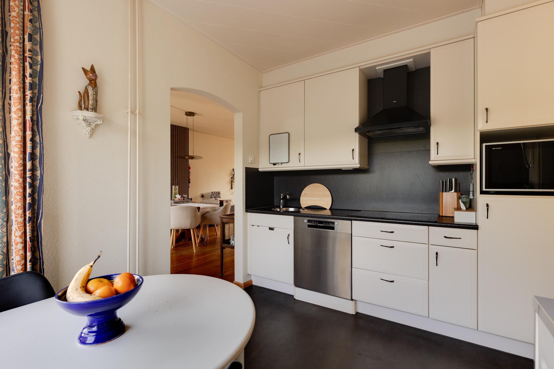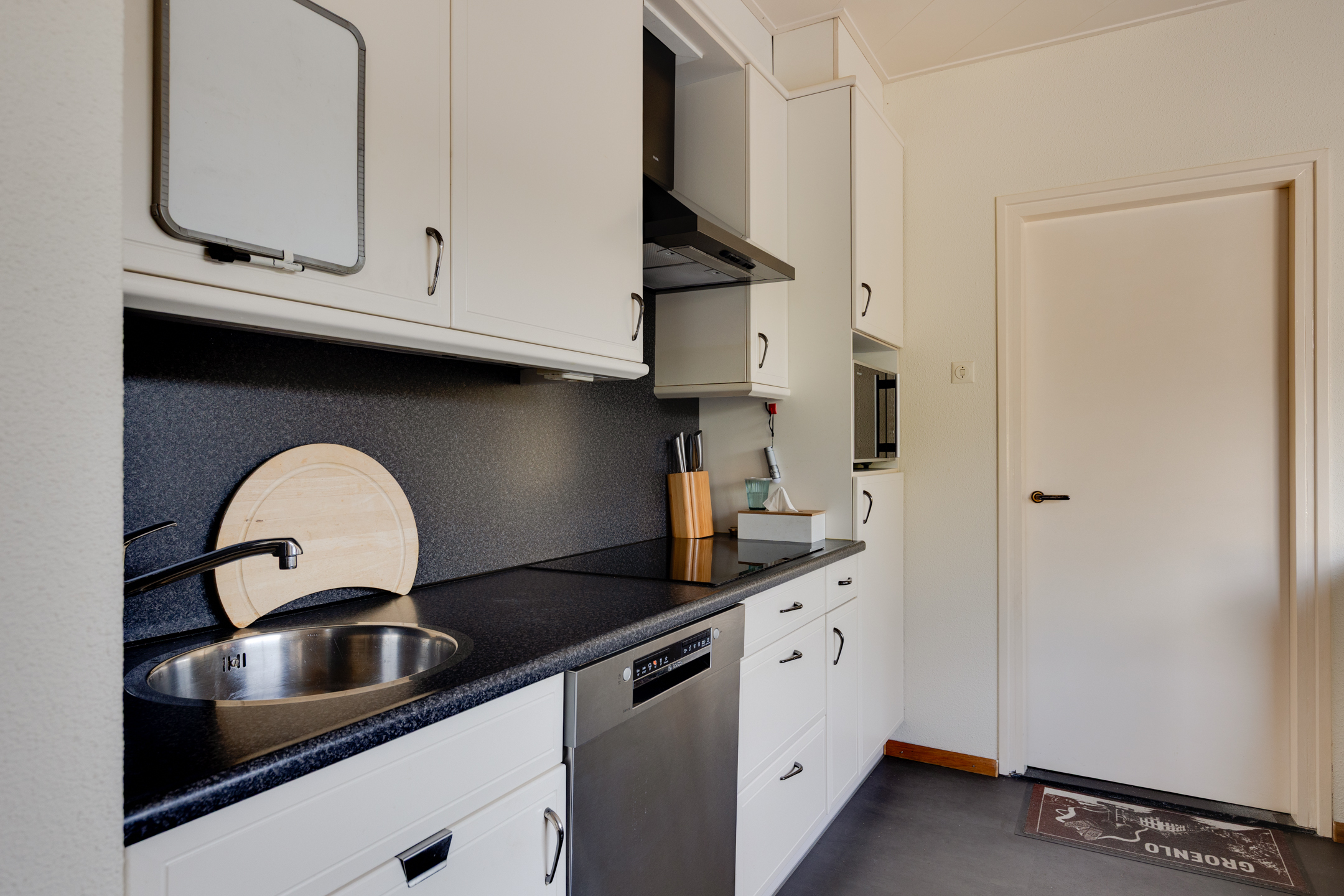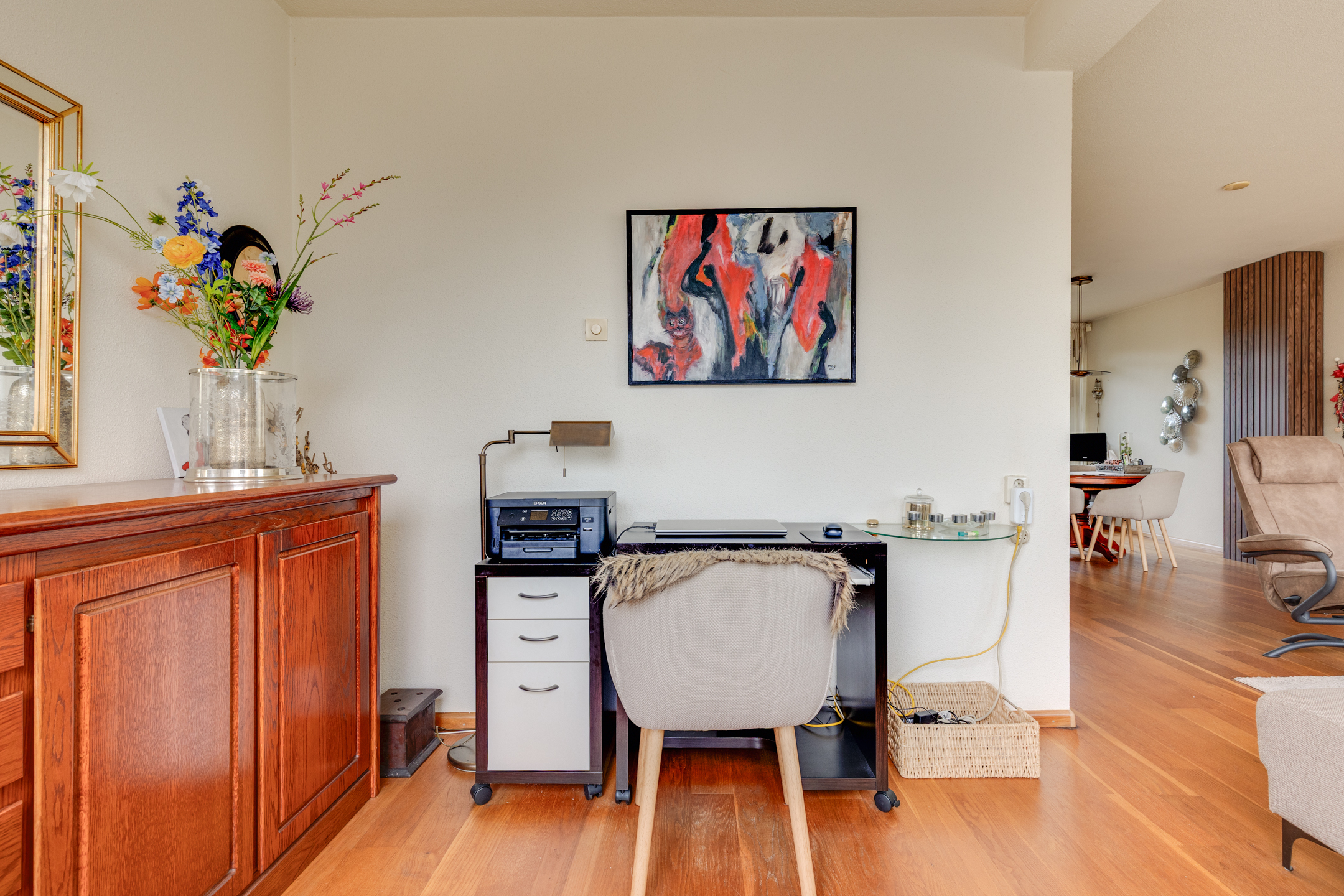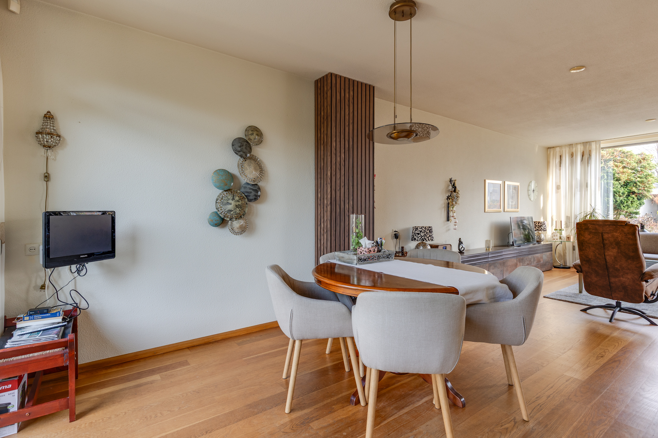 Bij binnenkomst in de woonkamer verrast je direct de lichtinval op, dankzij de grote raampartijen aan zowel de voor- als de achterzijde, geniet je de hele dag van een natuurlijke lichtinval. Bij het eetgedeelte biedt een grote schuifpui toegang en fraai uitzicht naar de verzorgde, volledig groen omheinde achtertuin.