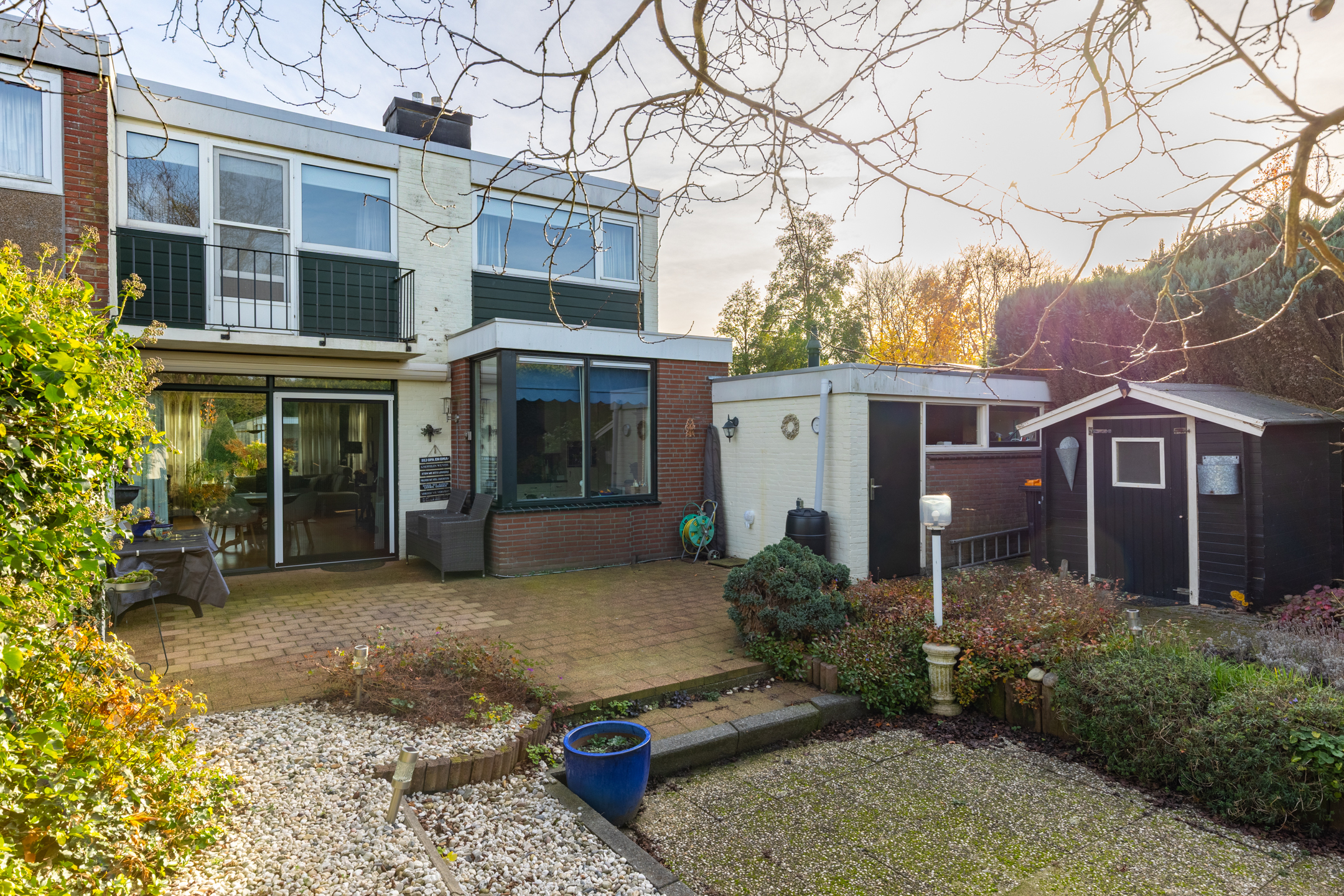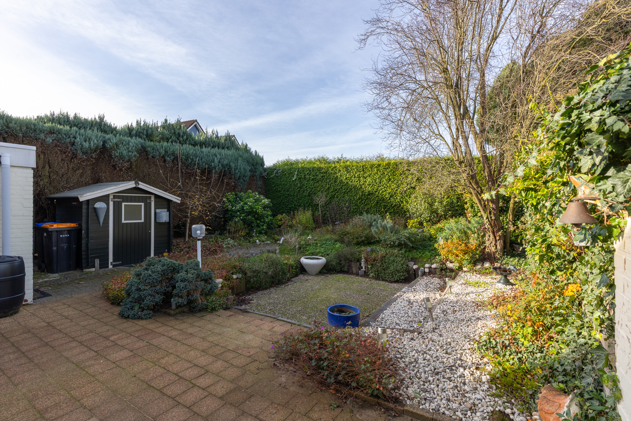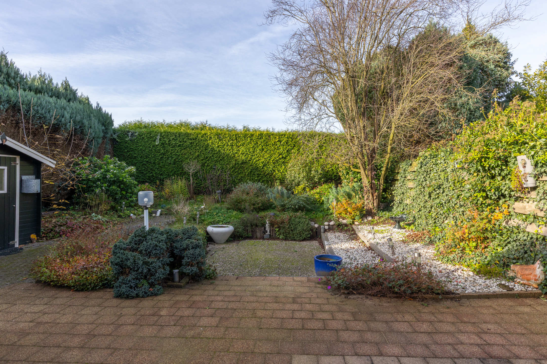 In de veel privacy biedende achtertuin met houten berging vind je altijd een plekje in de zon of schaduw en kun je genieten van al het groen.