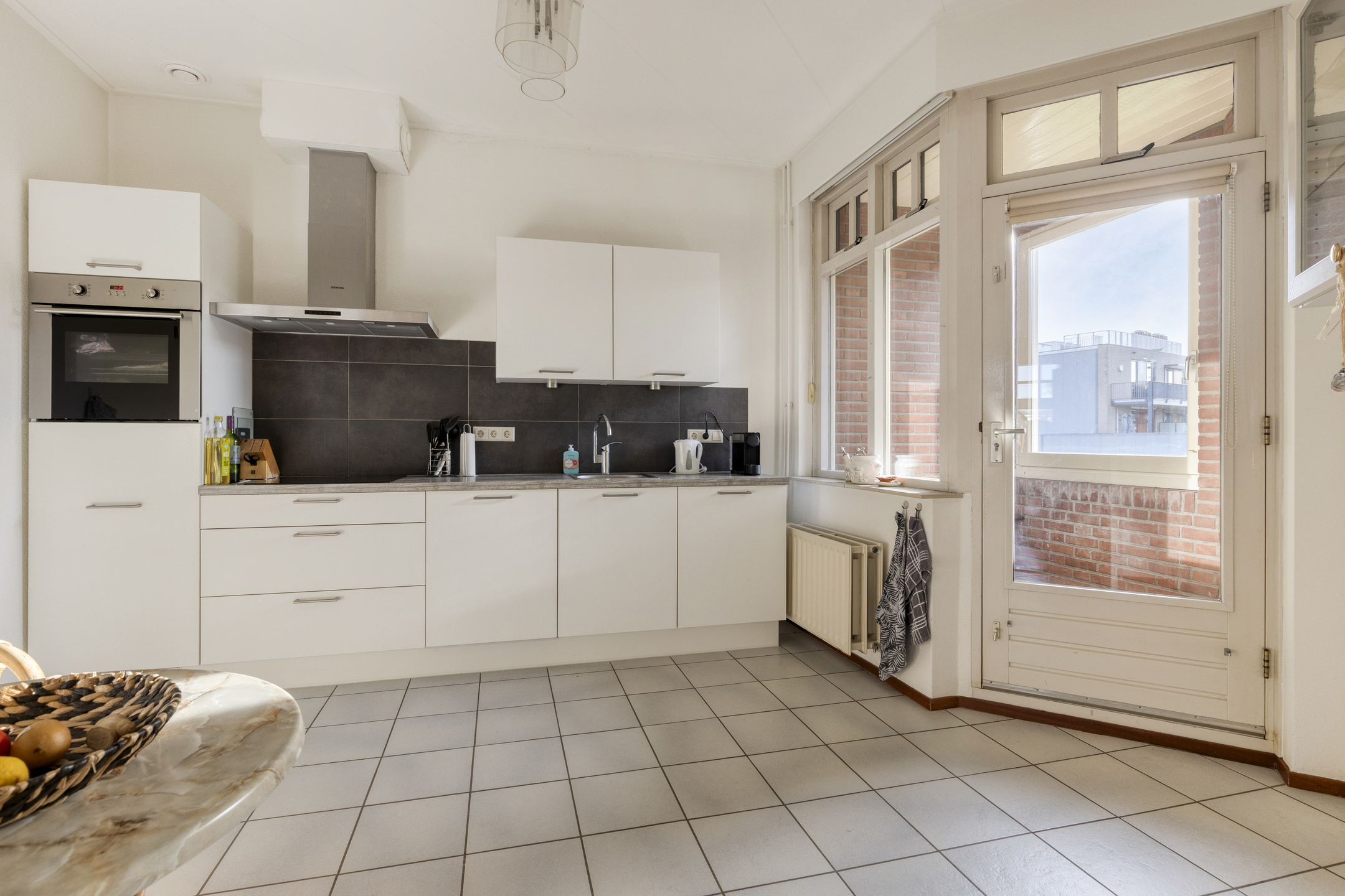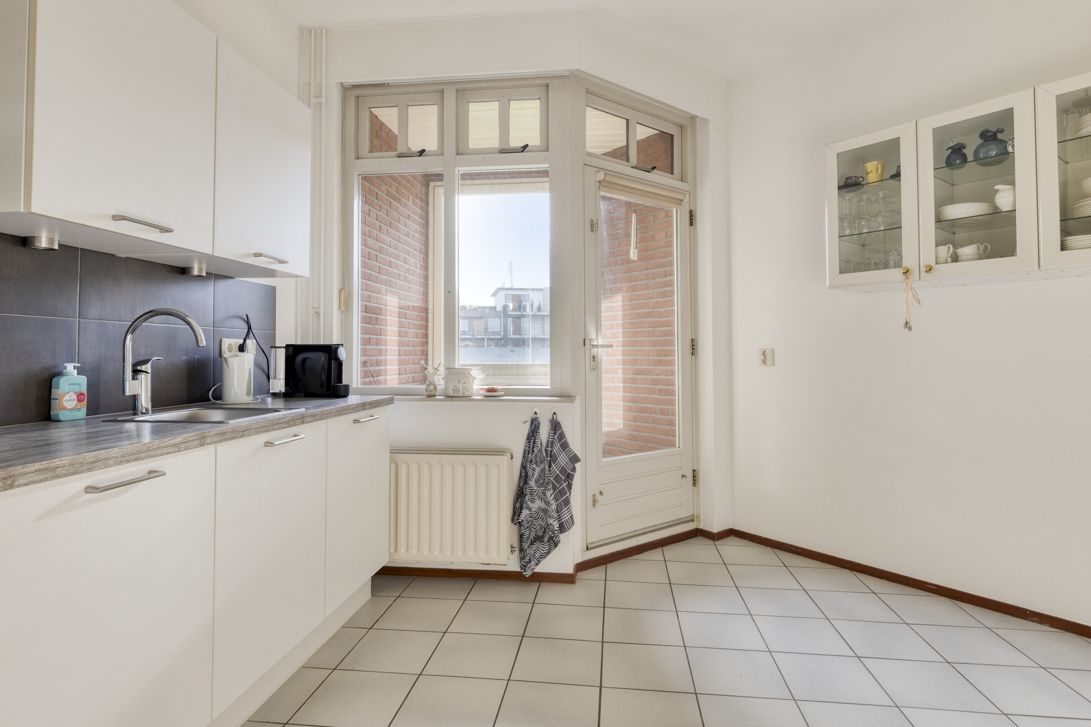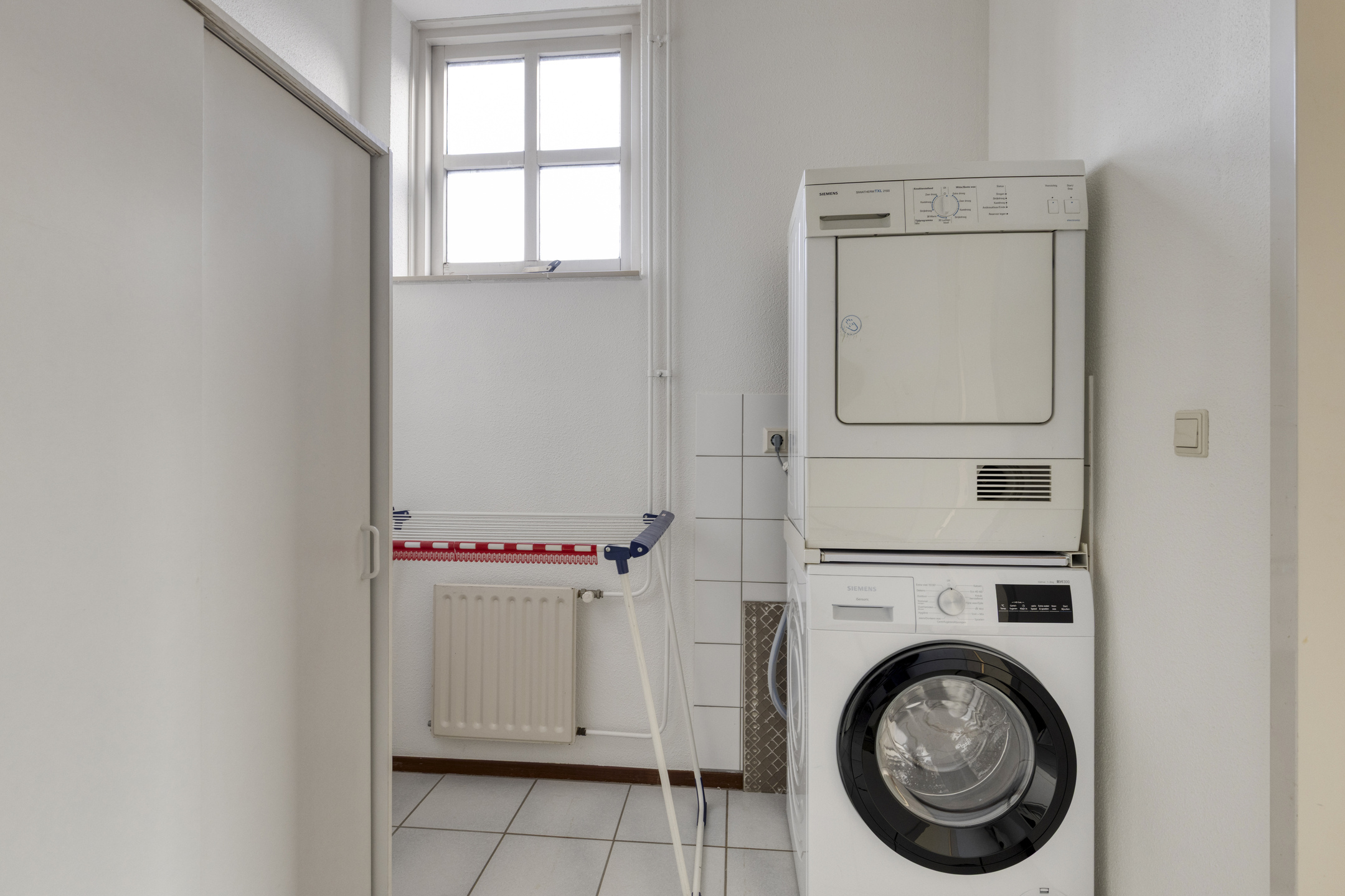 De ruime dichte keuken is voorzien van moderne inbouwapparatuur en biedt toegang tot een patio met uitzicht op de Nieuwmarkt. Naast de keuken bevindt zich een praktische bergruimte met aansluitingen voor de wasmachine en droger.