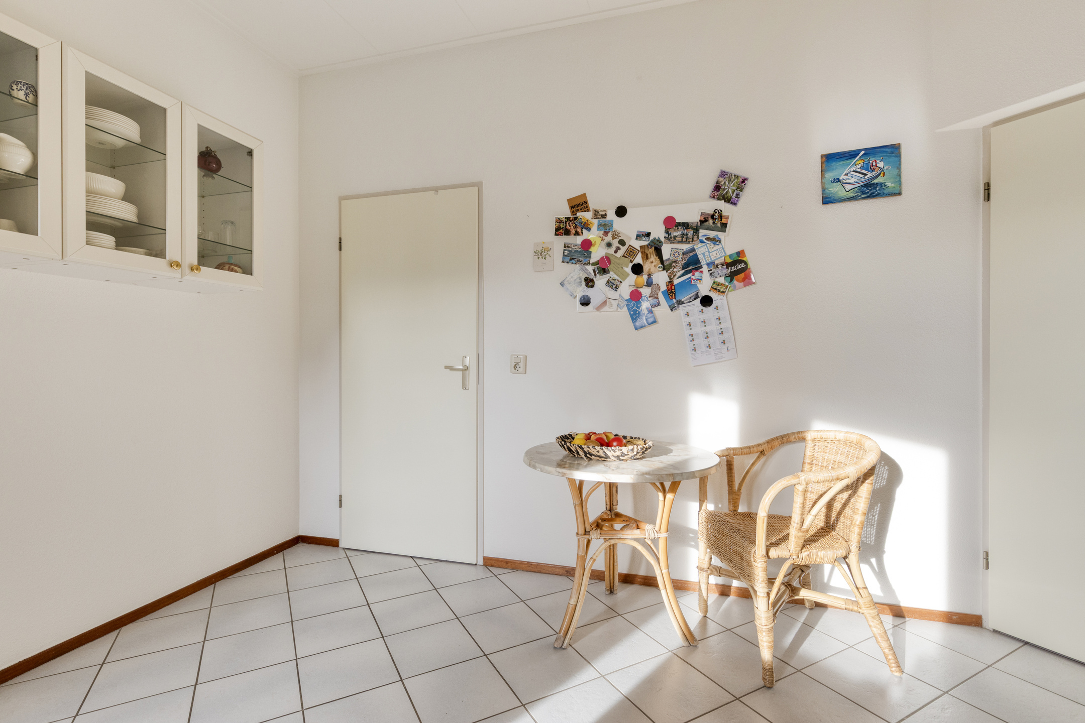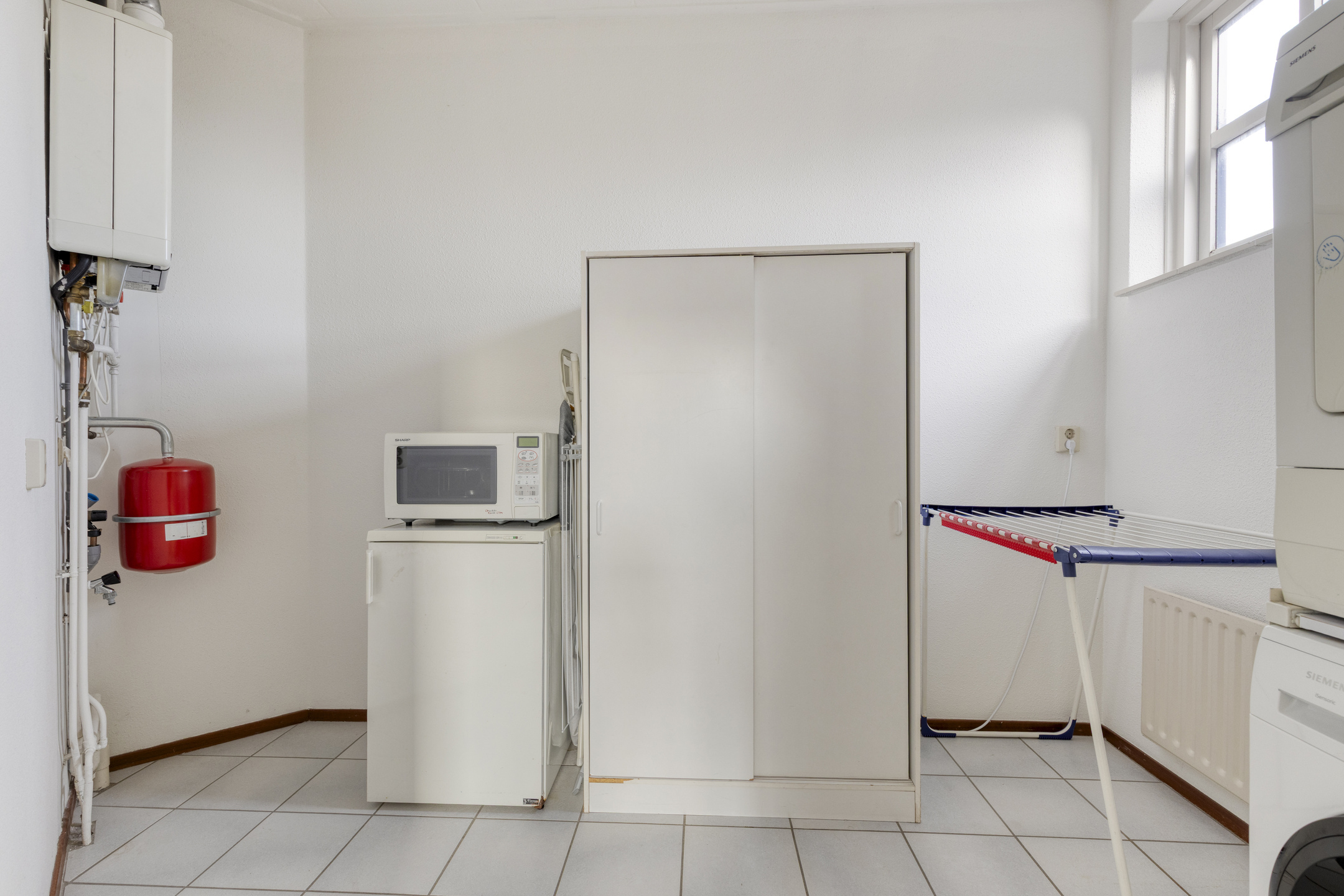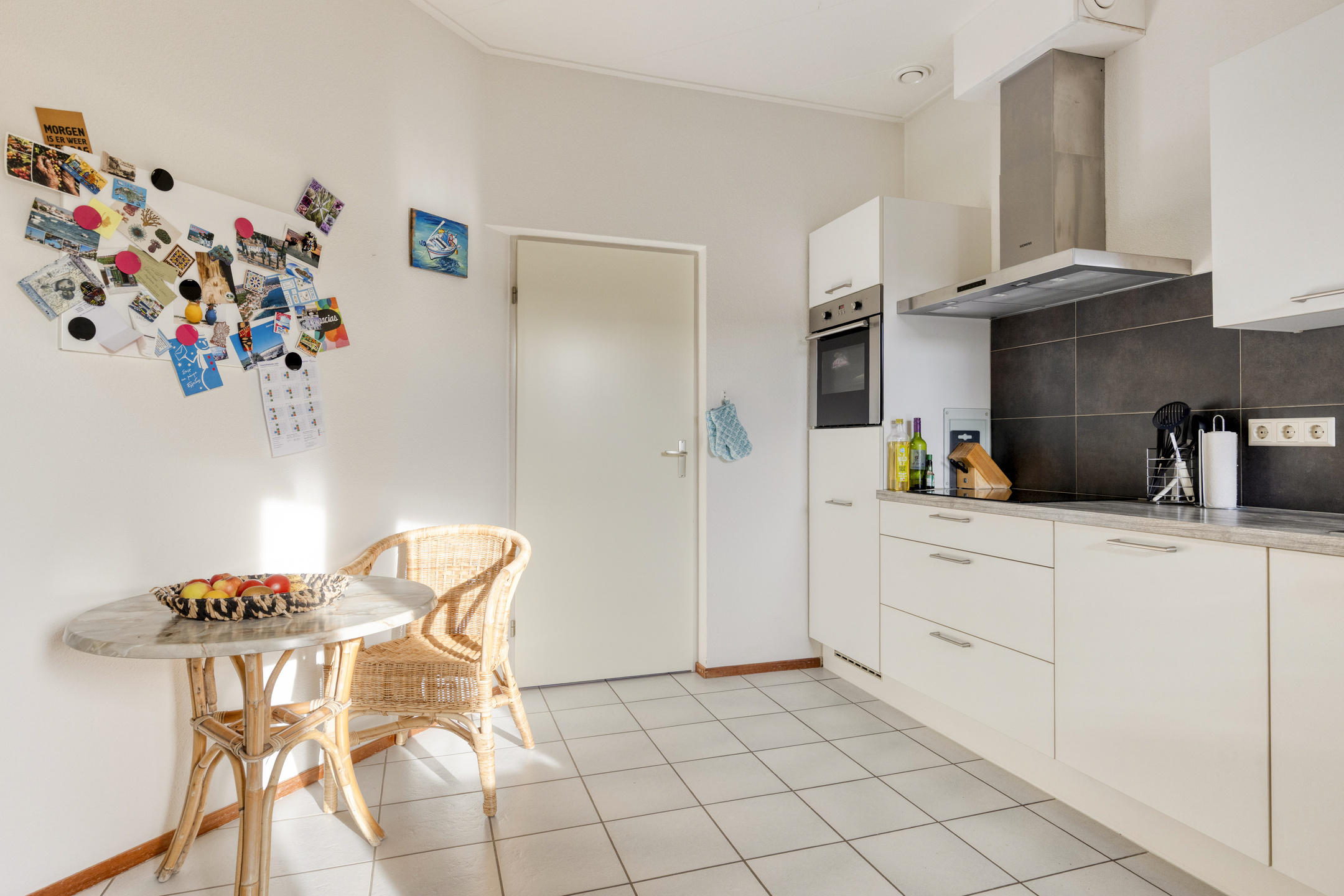 De ruime dichte keuken is voorzien van moderne inbouwapparatuur en biedt toegang tot een patio met uitzicht op de Nieuwmarkt. Naast de keuken bevindt zich een praktische bergruimte met aansluitingen voor de wasmachine en droger.