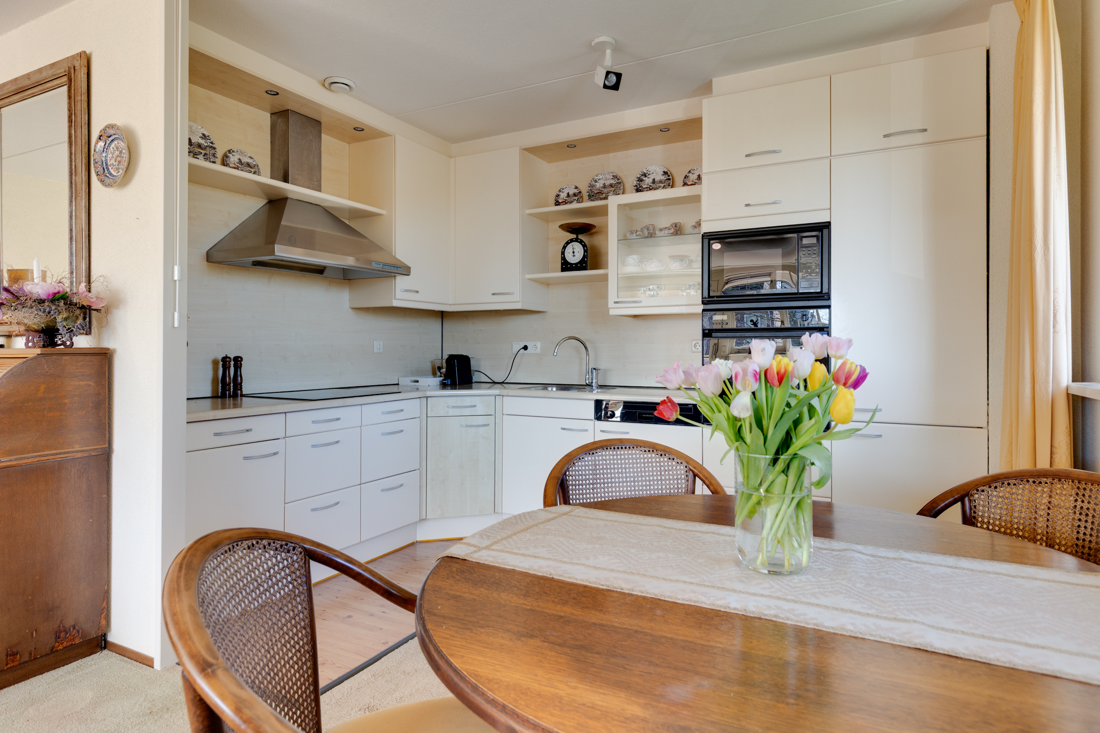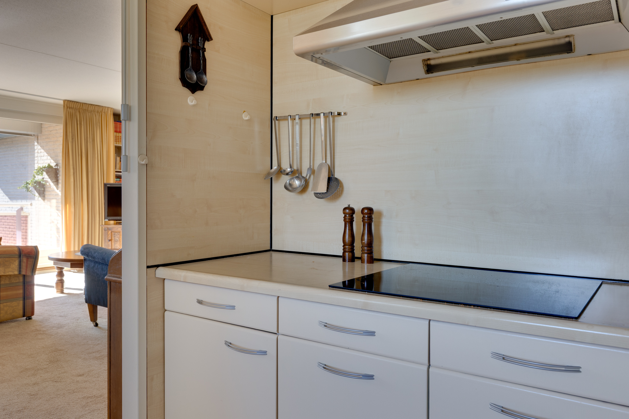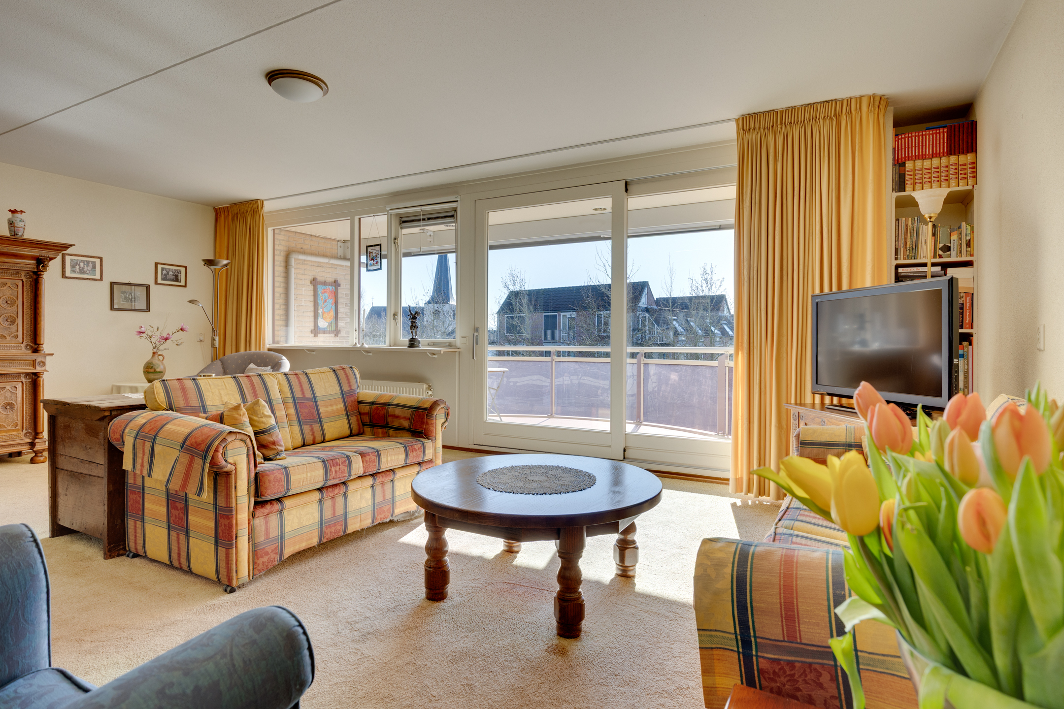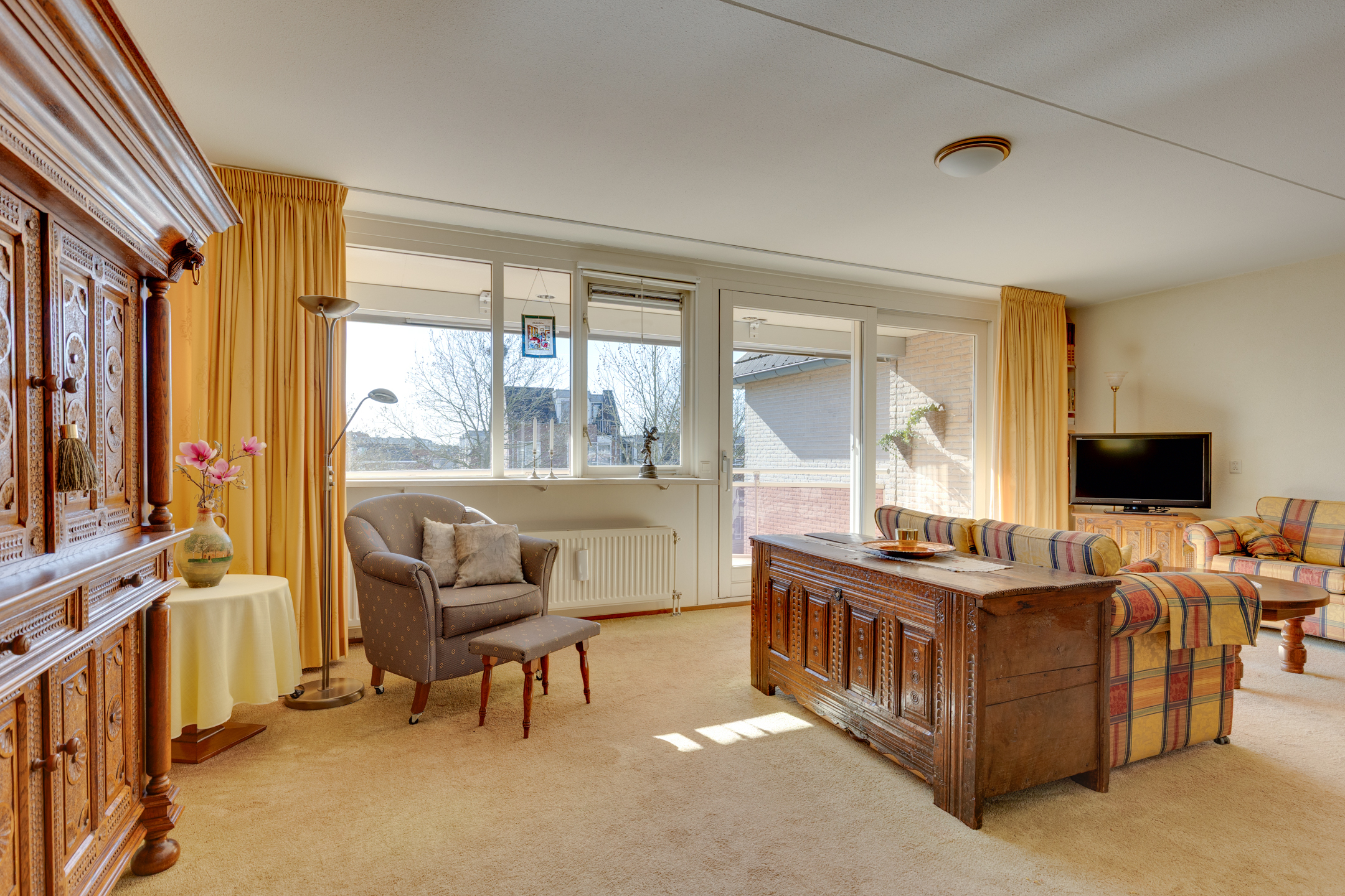 Een royale woonkamer heeft door de grote ramen veel lichtinval en biedt een fraai uitzicht. De schuifpui geeft toegang naar het riante balkon, dat op het zonnige zuidwesten ligt. De open keuken is uitgerust met inbouwapparaten met aangrenzend het eetgedeelte. Aan de achterzijde bevinden zich twee slaapkamers, waarvan de hoofdslaapkamer royaal te noemen is. Tussen de slaapkamers ligt de ruime, geheel betegelde badkamer.