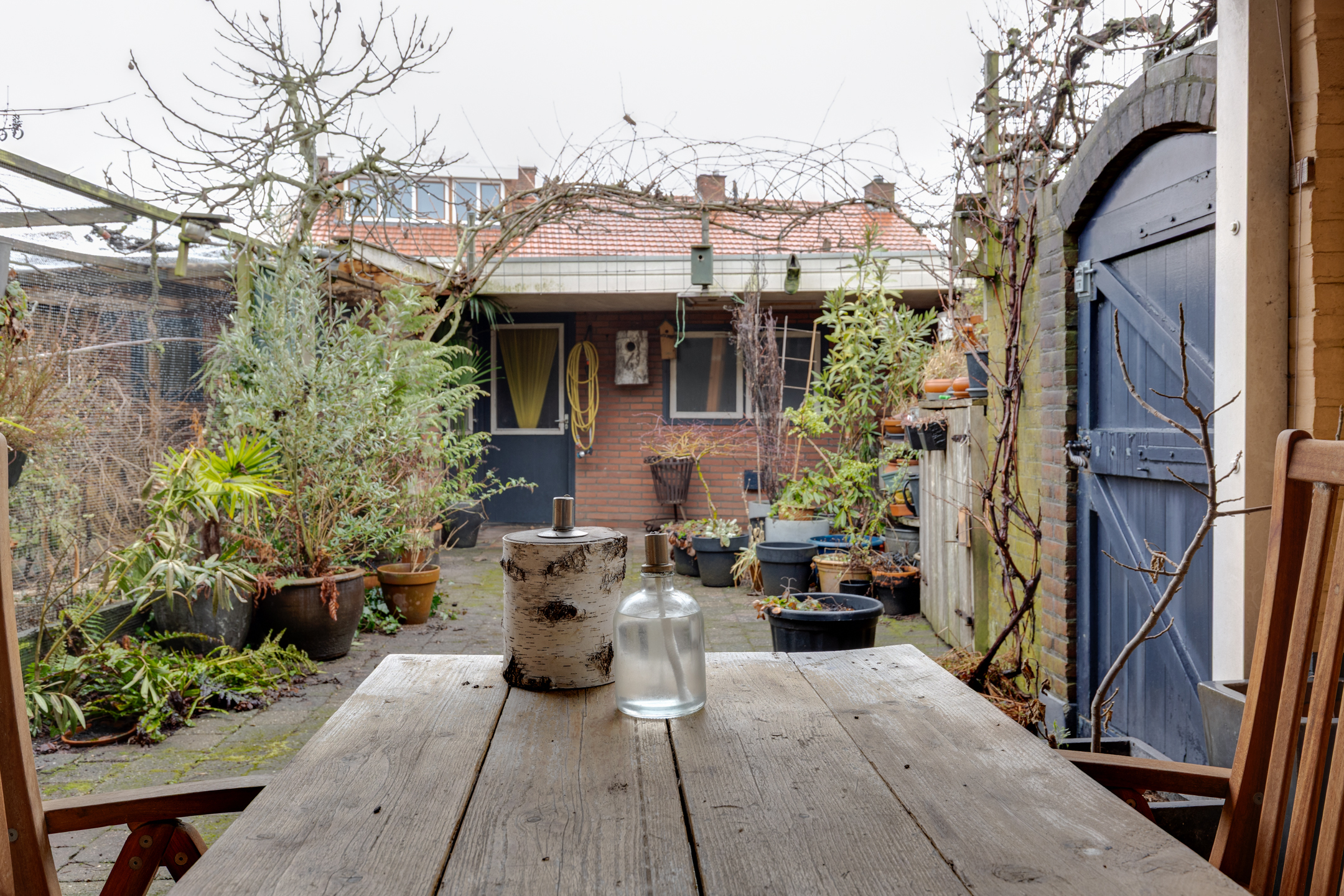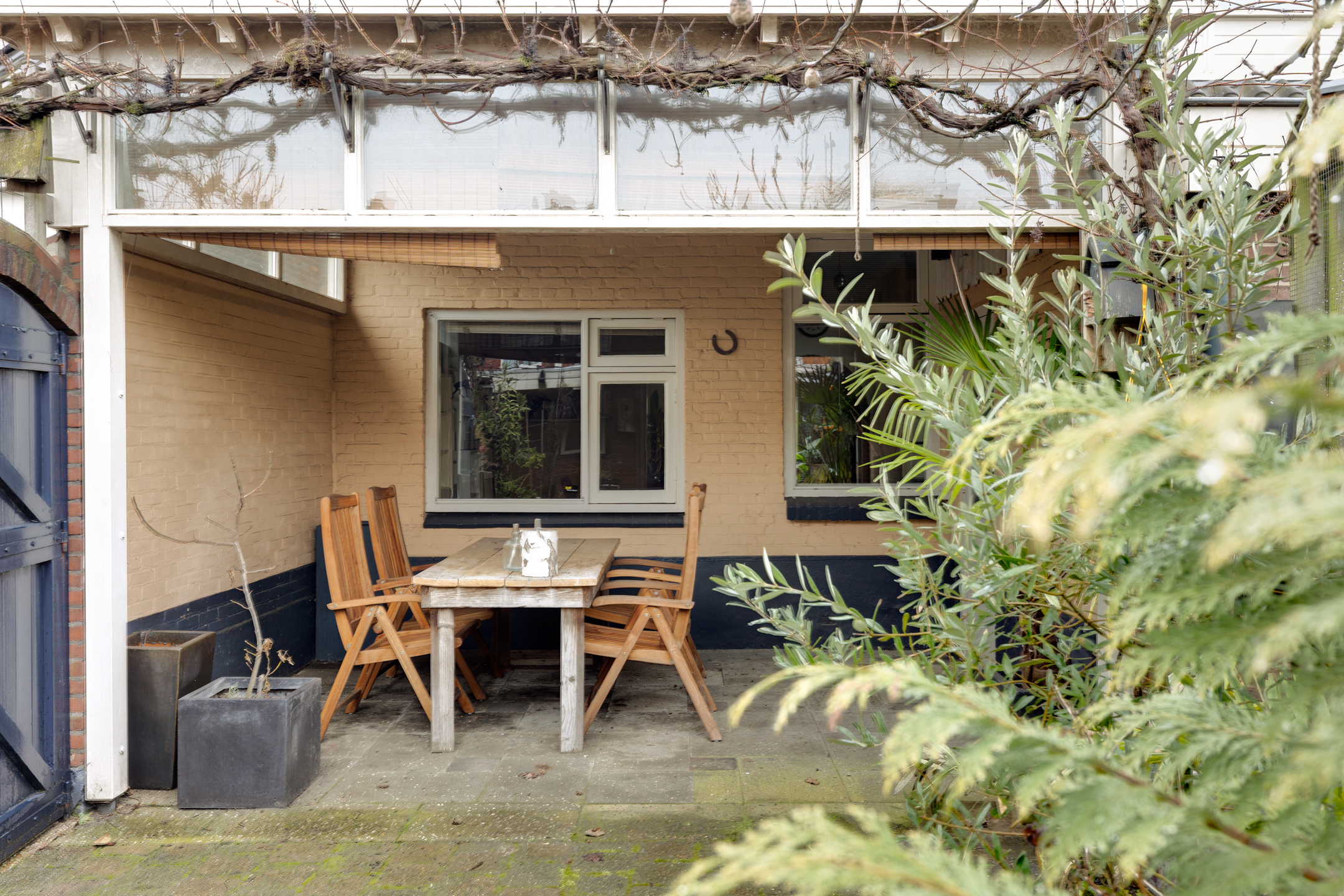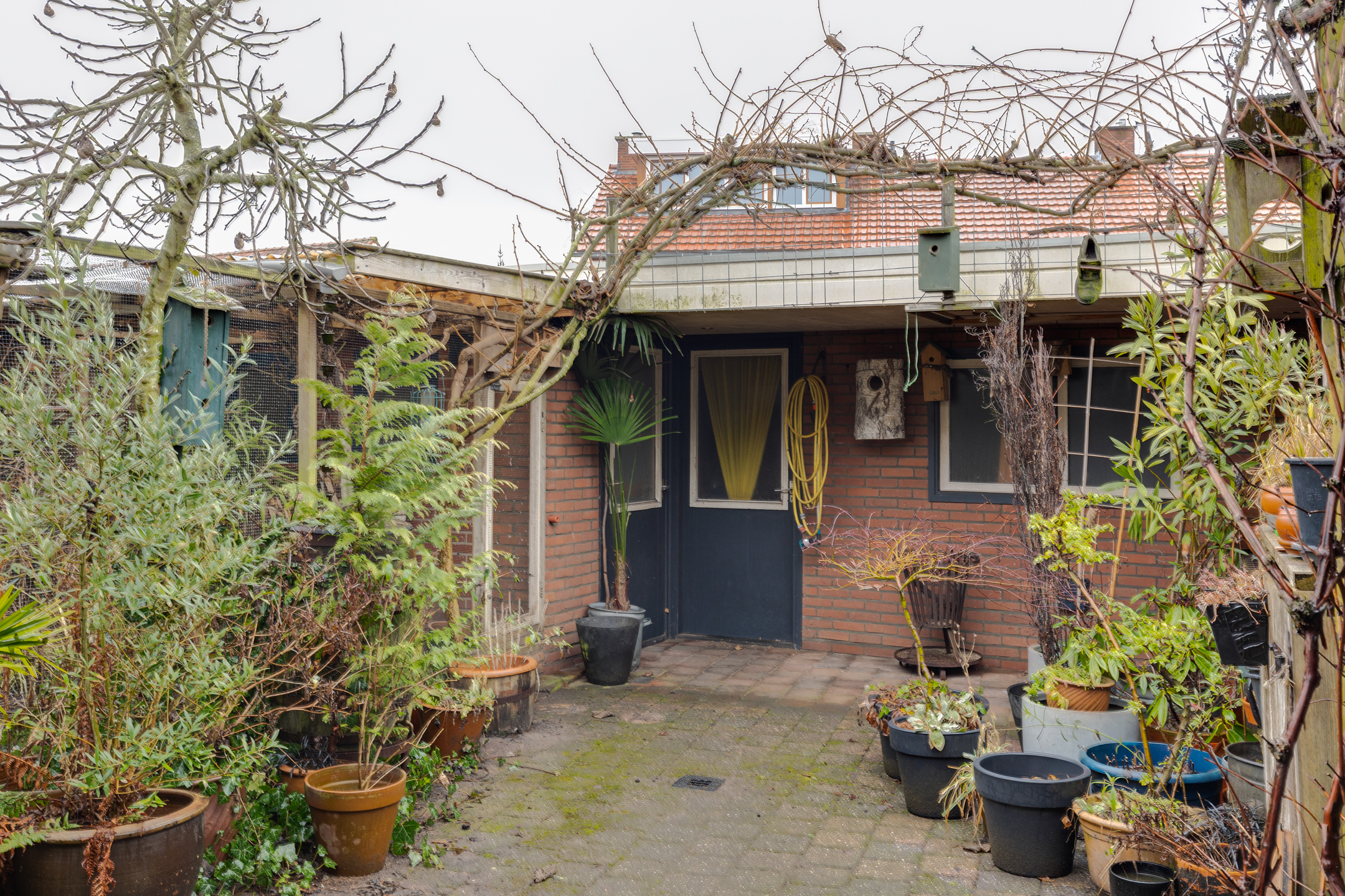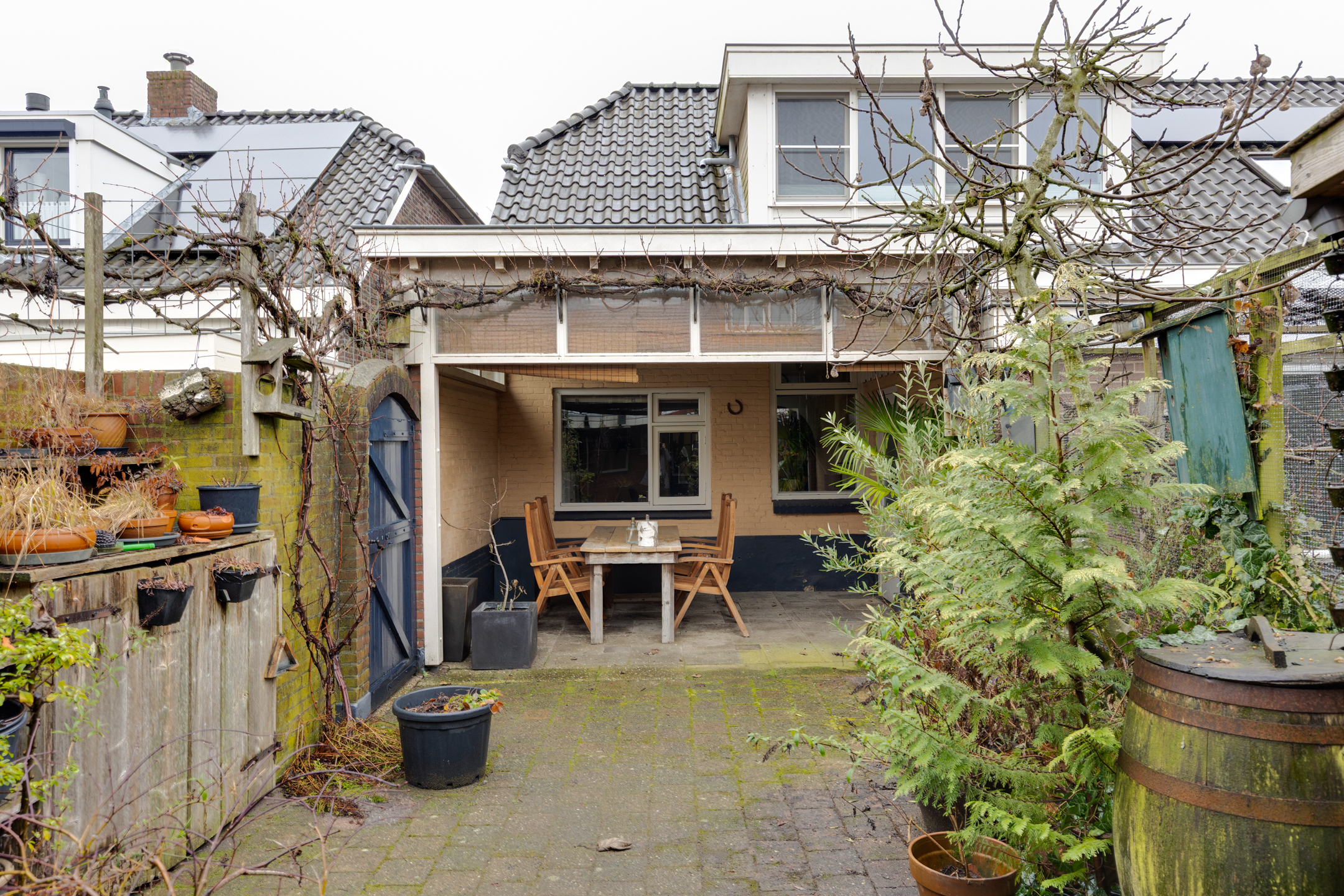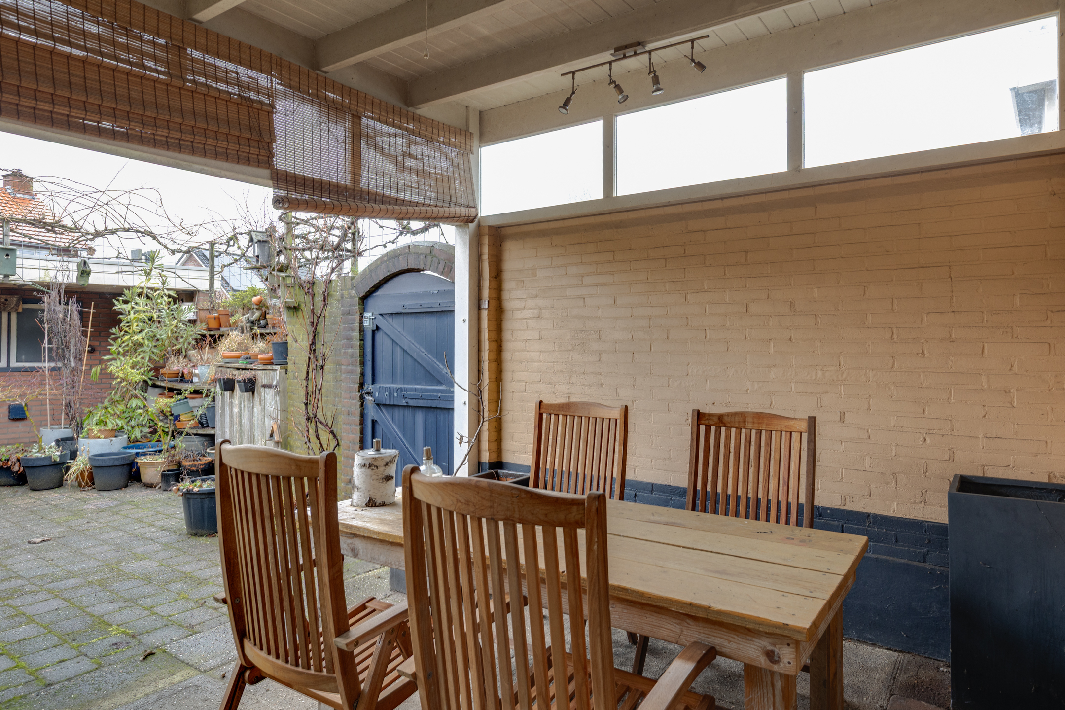De achtertuin is op het westen gelegen en is voorzien van nog een overkapping aan de schuur. De garage/schuur is via een achteringang te bereiken. De tuin heeft middels een poort ook een zij- ingang.
