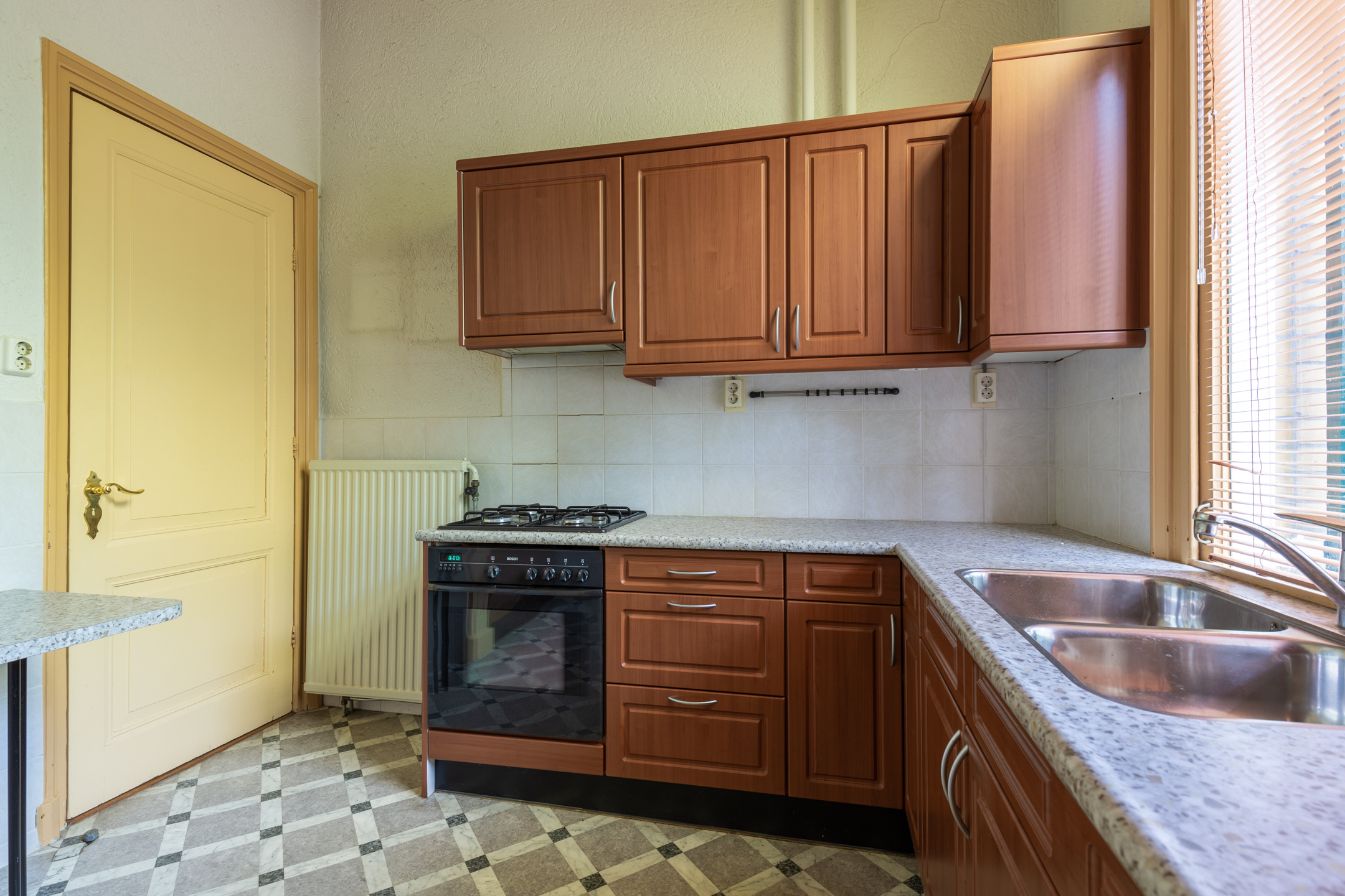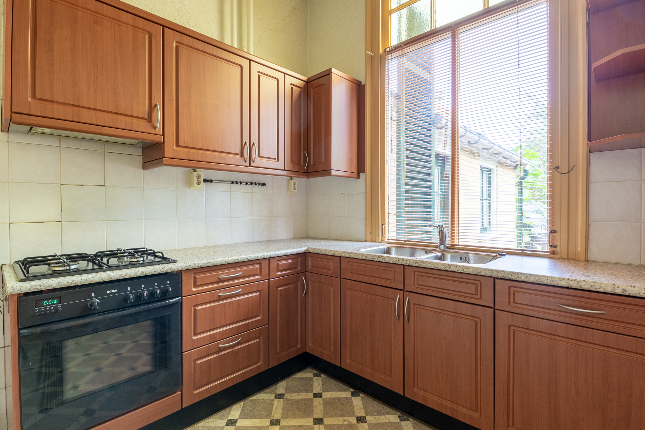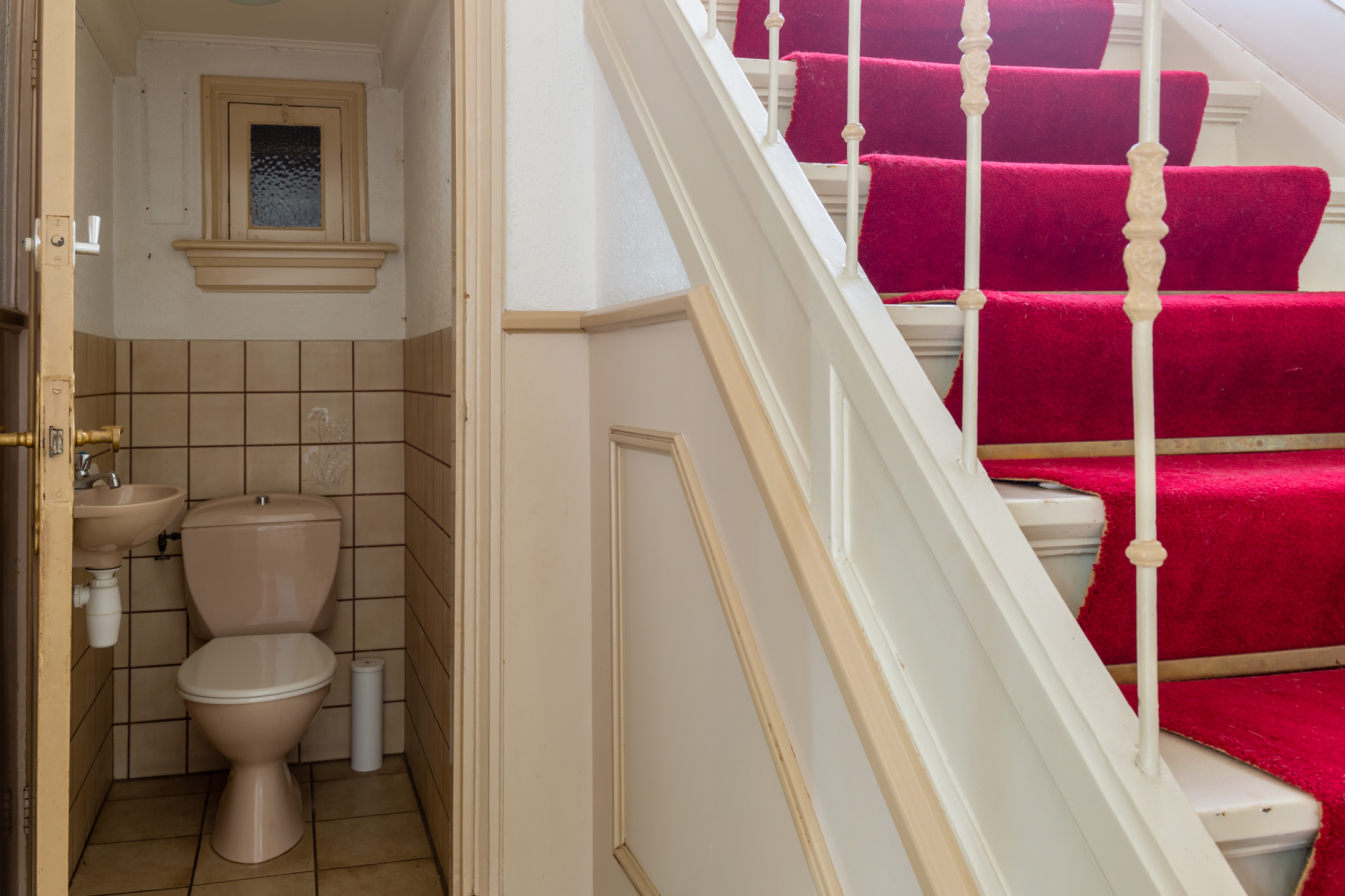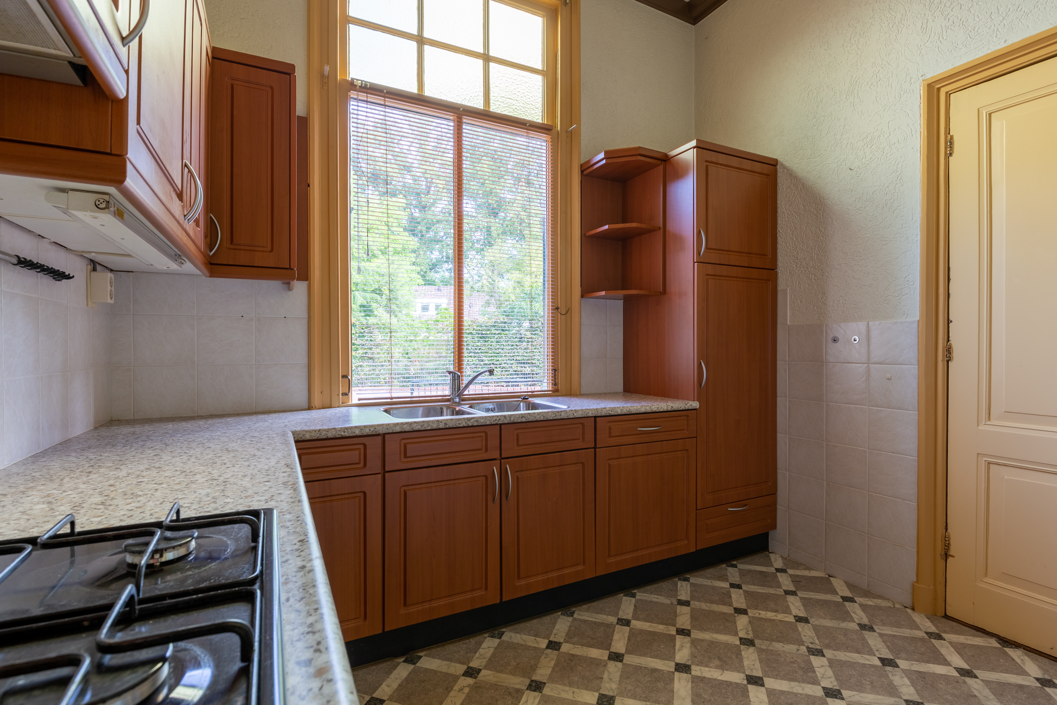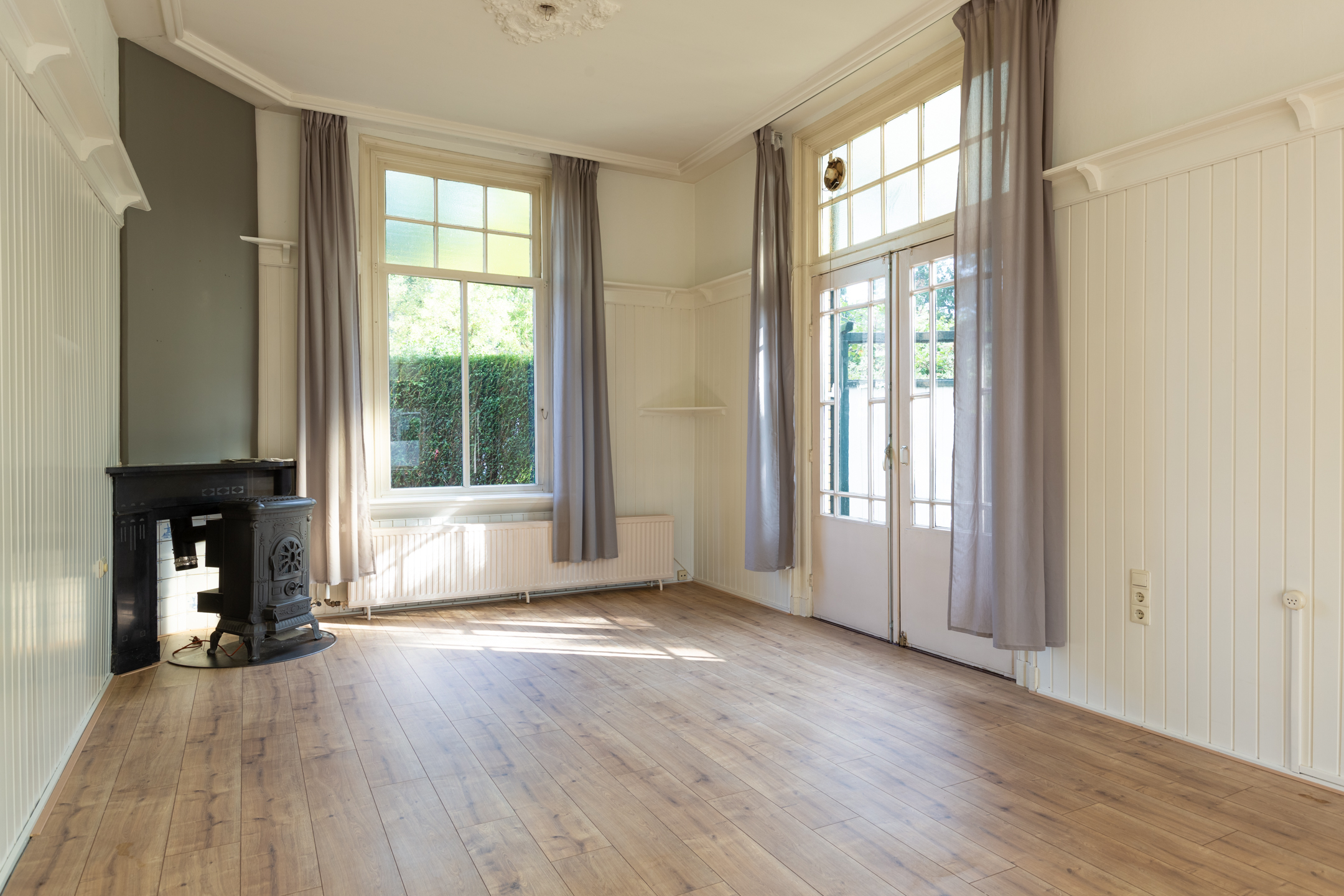 Entree met vestibule, hal met toegang naar slaap-/werkkamer, toiletruimte, fraaie trapopgang naar de 1e verdieping. Royale woonkamer met openslaande tuindeuren welke toegang bieden tot de voortuin. De woonkamer is voorzien van grote raampartijen en een plafond in klassieke stijl, voorzien van een ornament. Aan het einde van de hal bevindt zich een deur die toegang geeft tot de keuken. De keuken is van alle gemakken voorzien, waaronder een oven, 4-pits gaskookplaat, vaatwasser en koelkast. Via de keuken is tevens de kelder bereikbaar, die toegang biedt tot een kelder van circa 8 m².