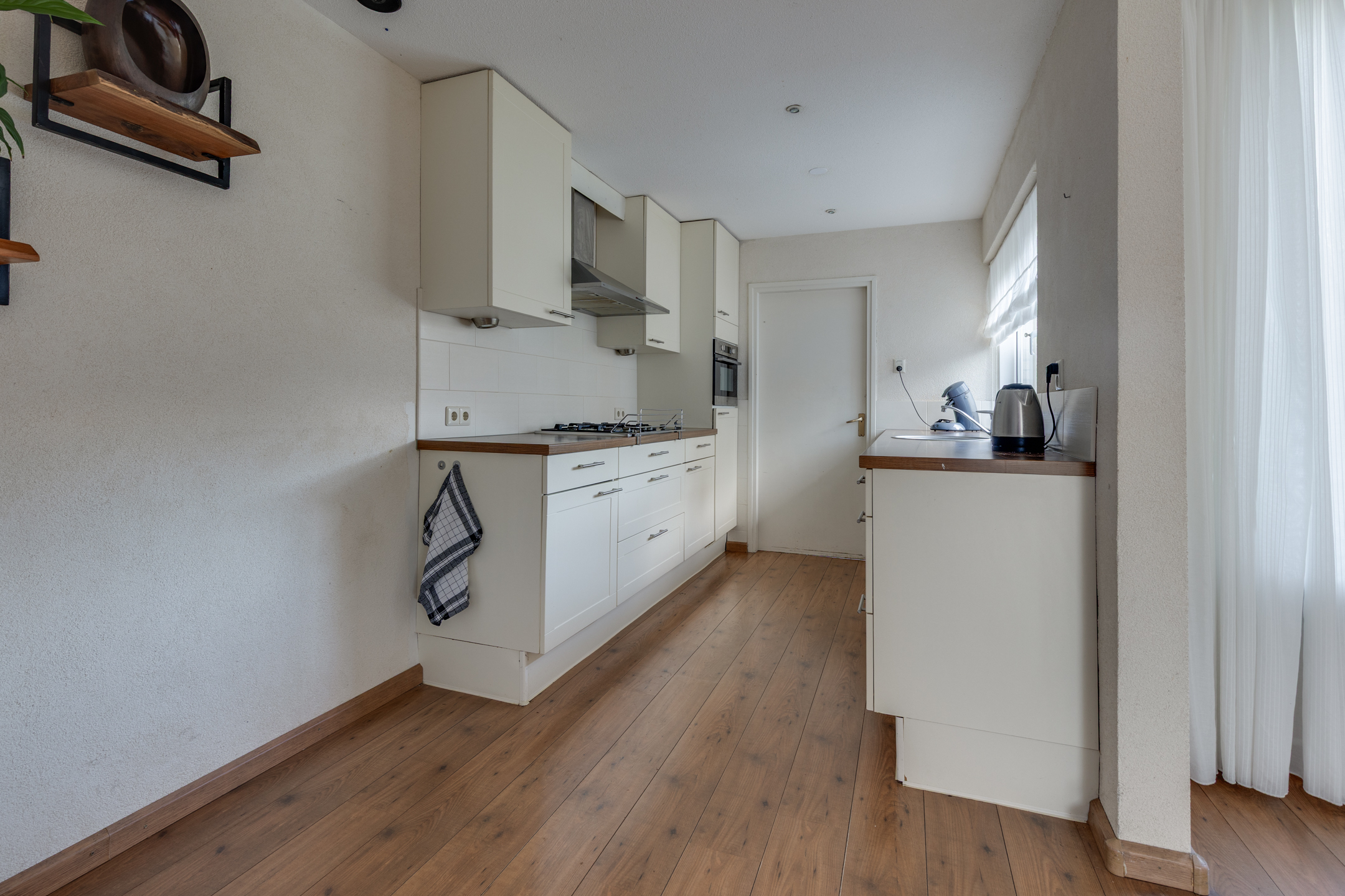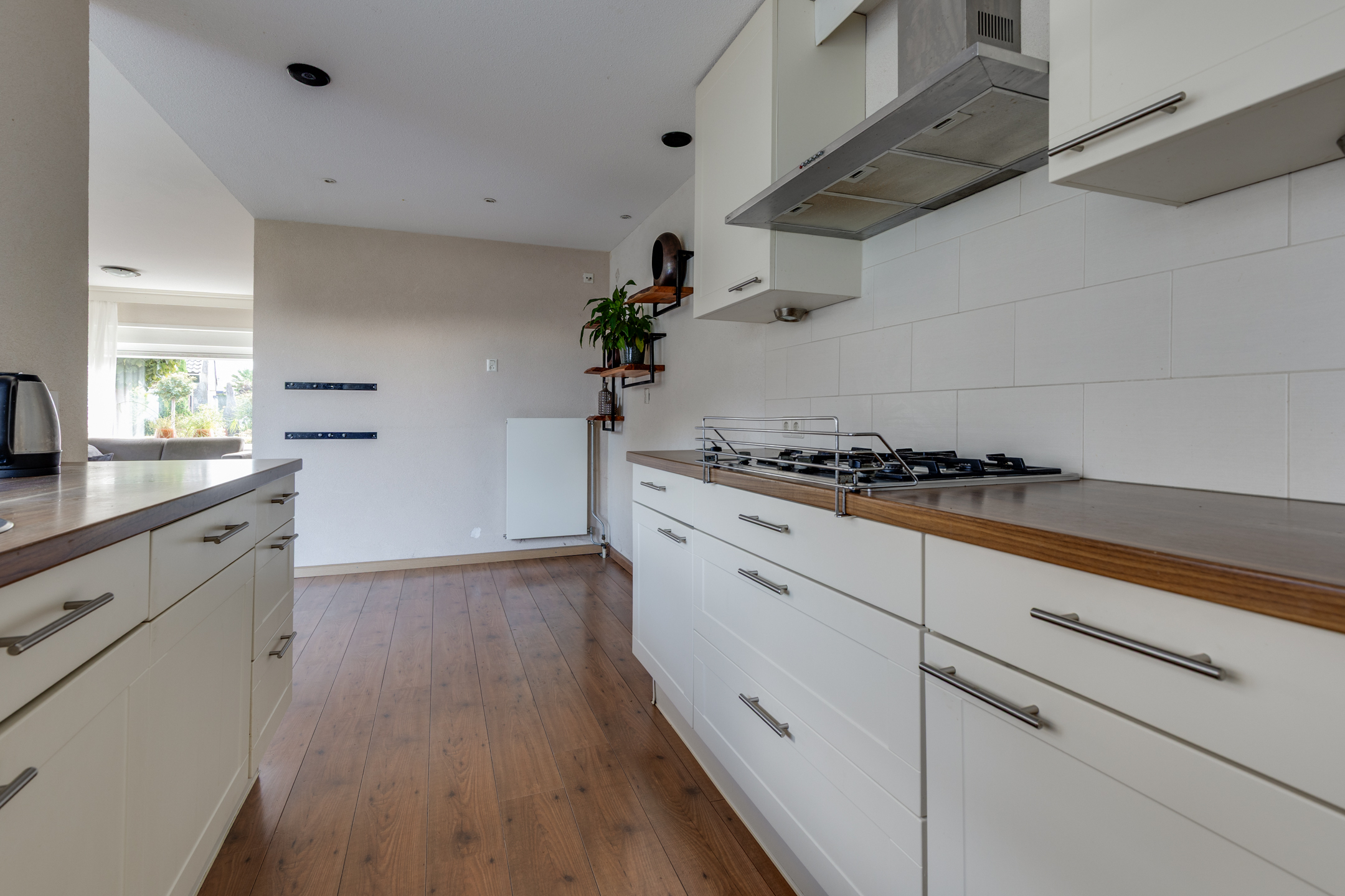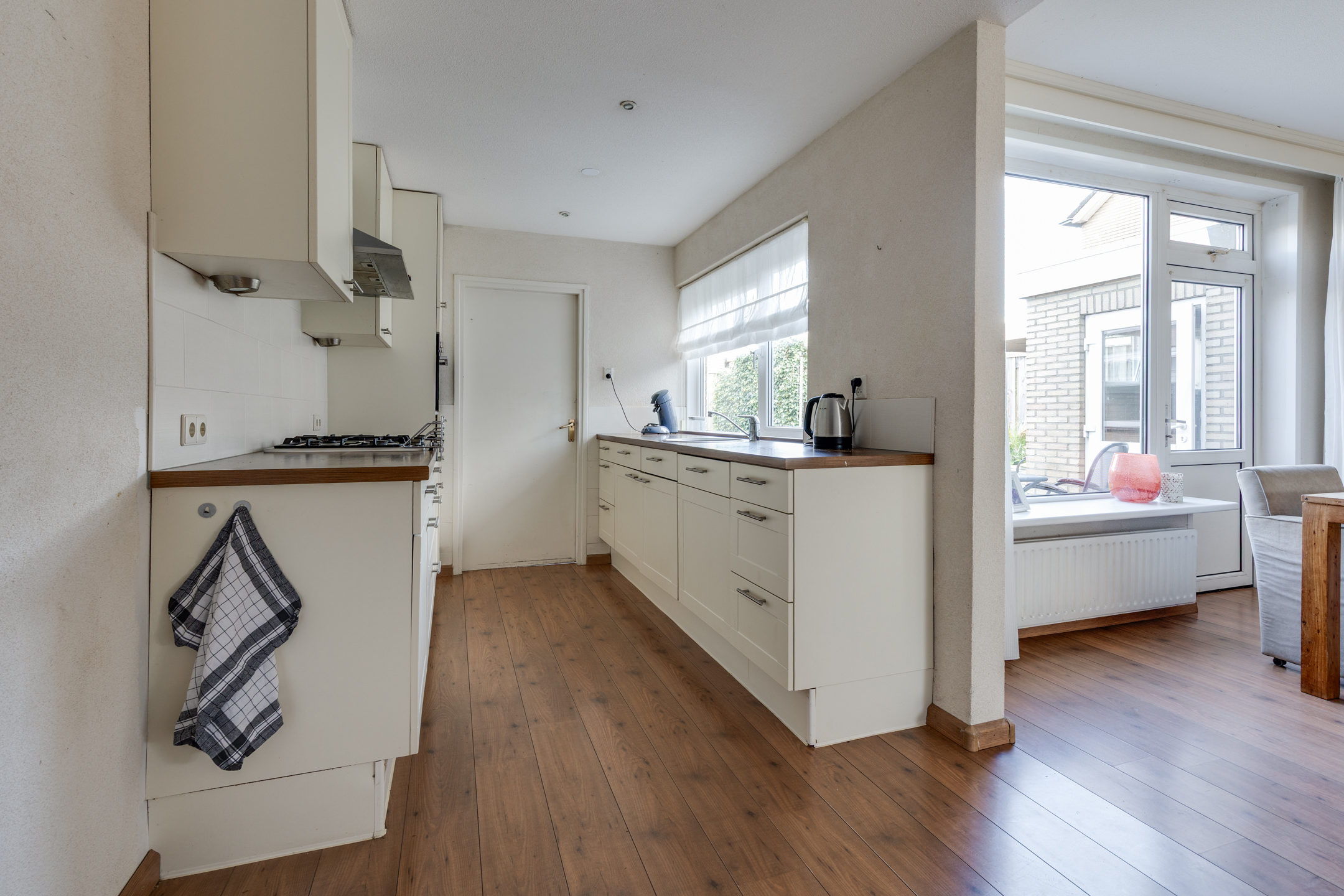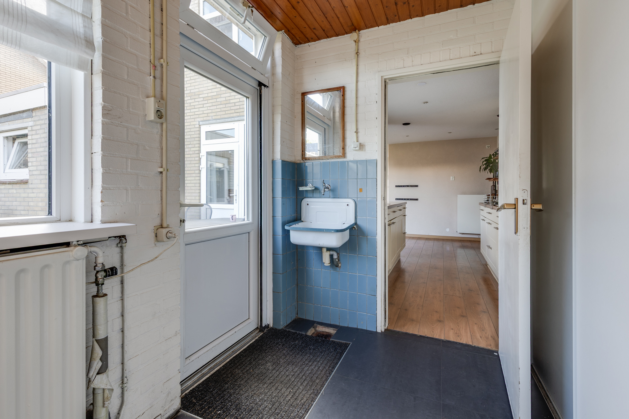 BEGANE GROND: Entree/ hal, meterkast, trapkast, toilet met fonteintje; doorzon woonkamer; open keuken met inbouwapparatuur (o.a. koelkast, vaatwasser, 4- pits gaskookplaat, RVS afzuigkap); bijkeuken voorzien van vaste kastenwand; wasmachine- en drogeraansluiting, wasbak en toegang tot de achtertuin.