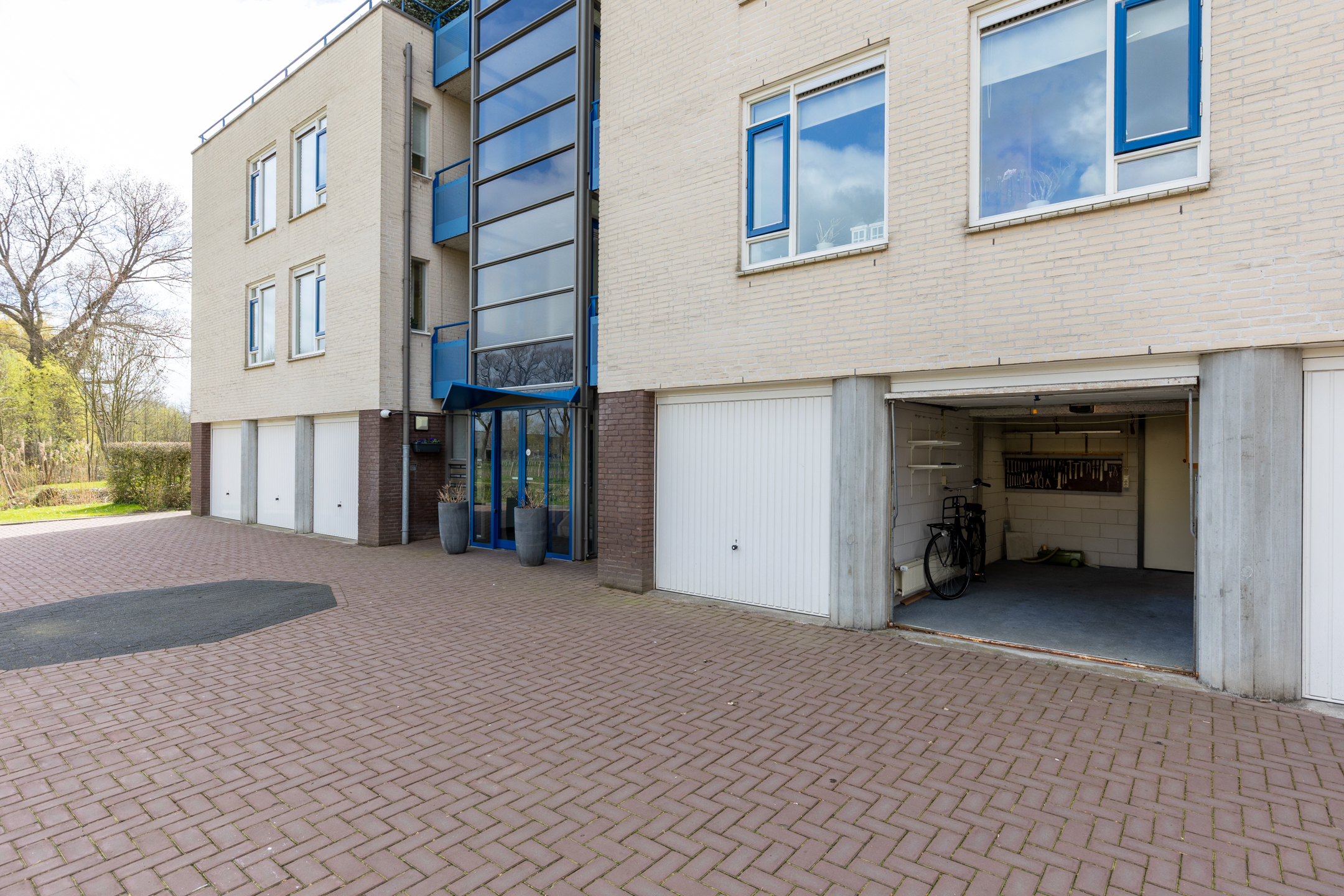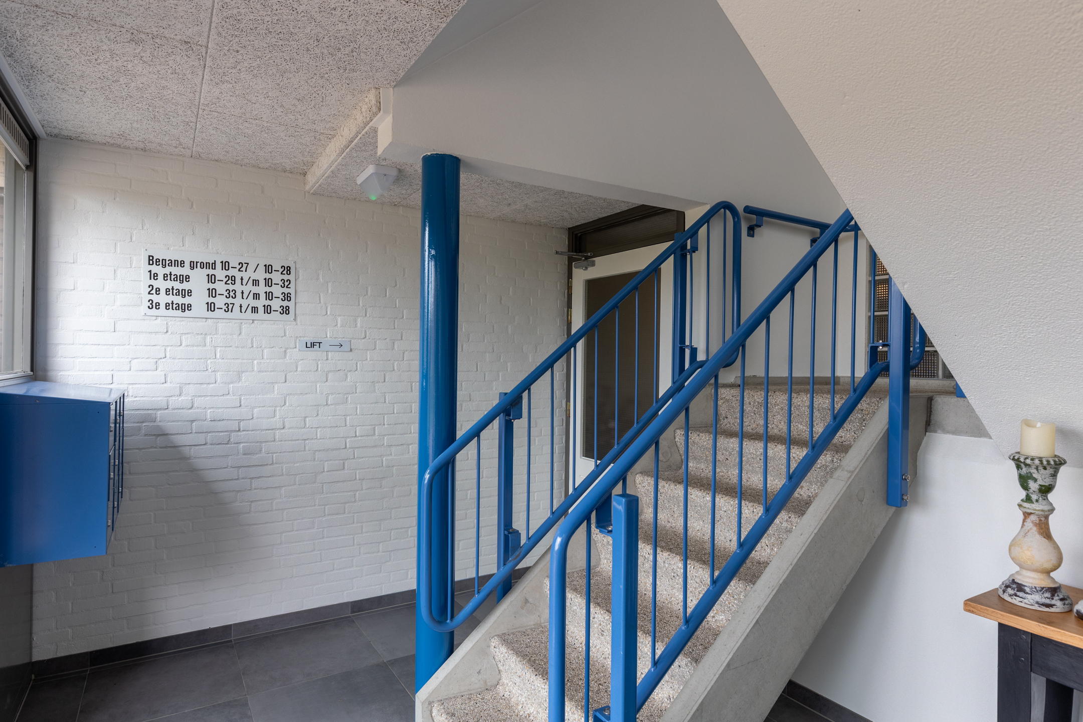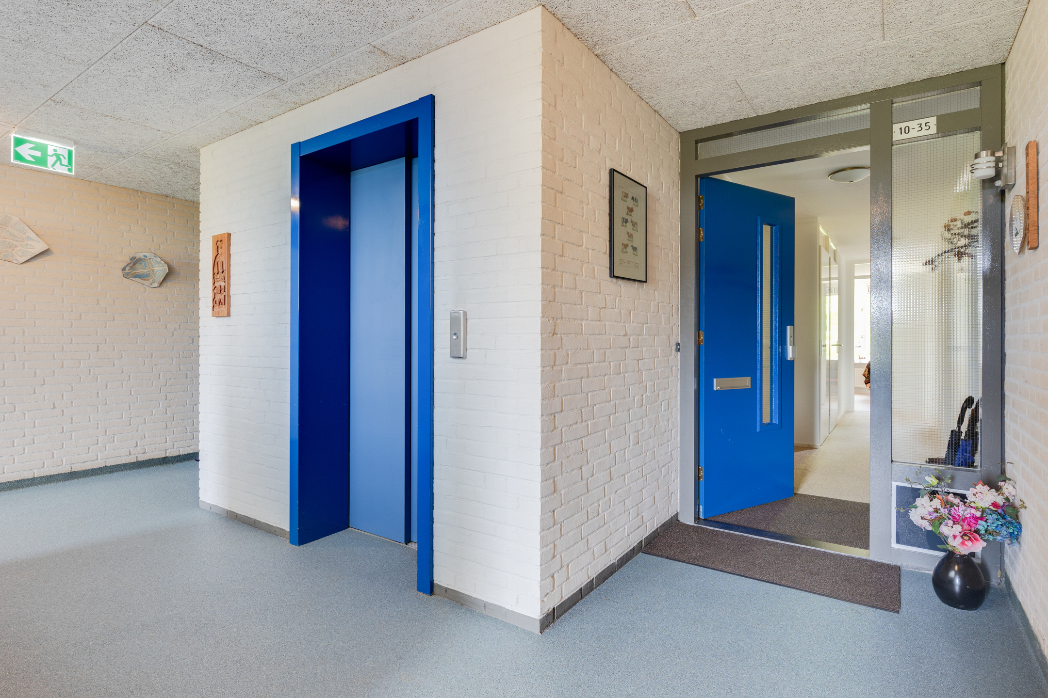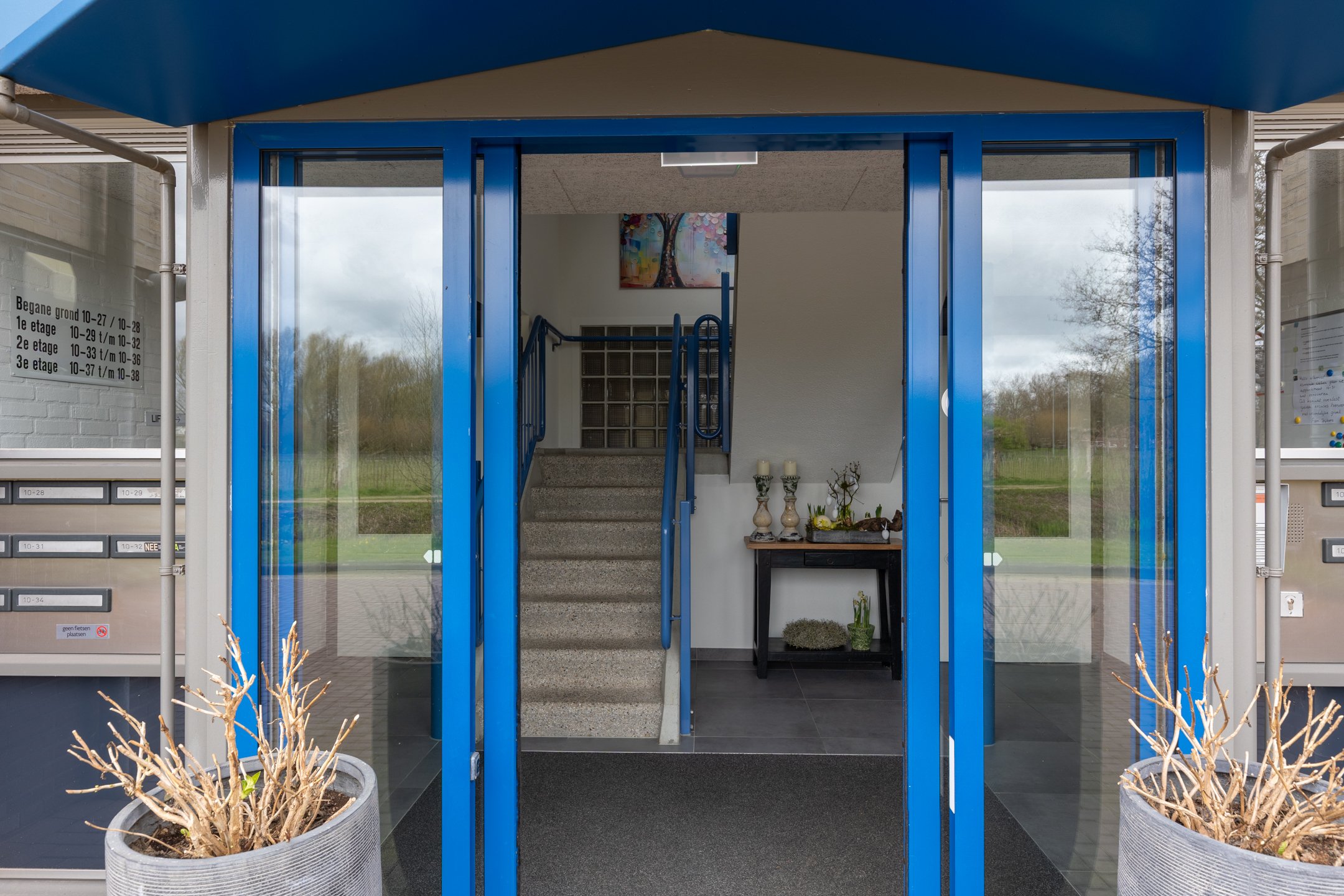 We betreden het appartementencomplex via de centrale entree/hal, voorzien van een video-intercominstallatie, trappenhuis en lift. Hier bevindt zich tevens de inpandige garagebox.