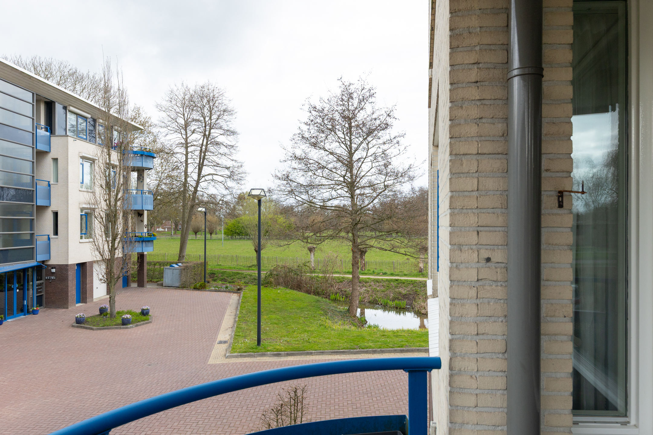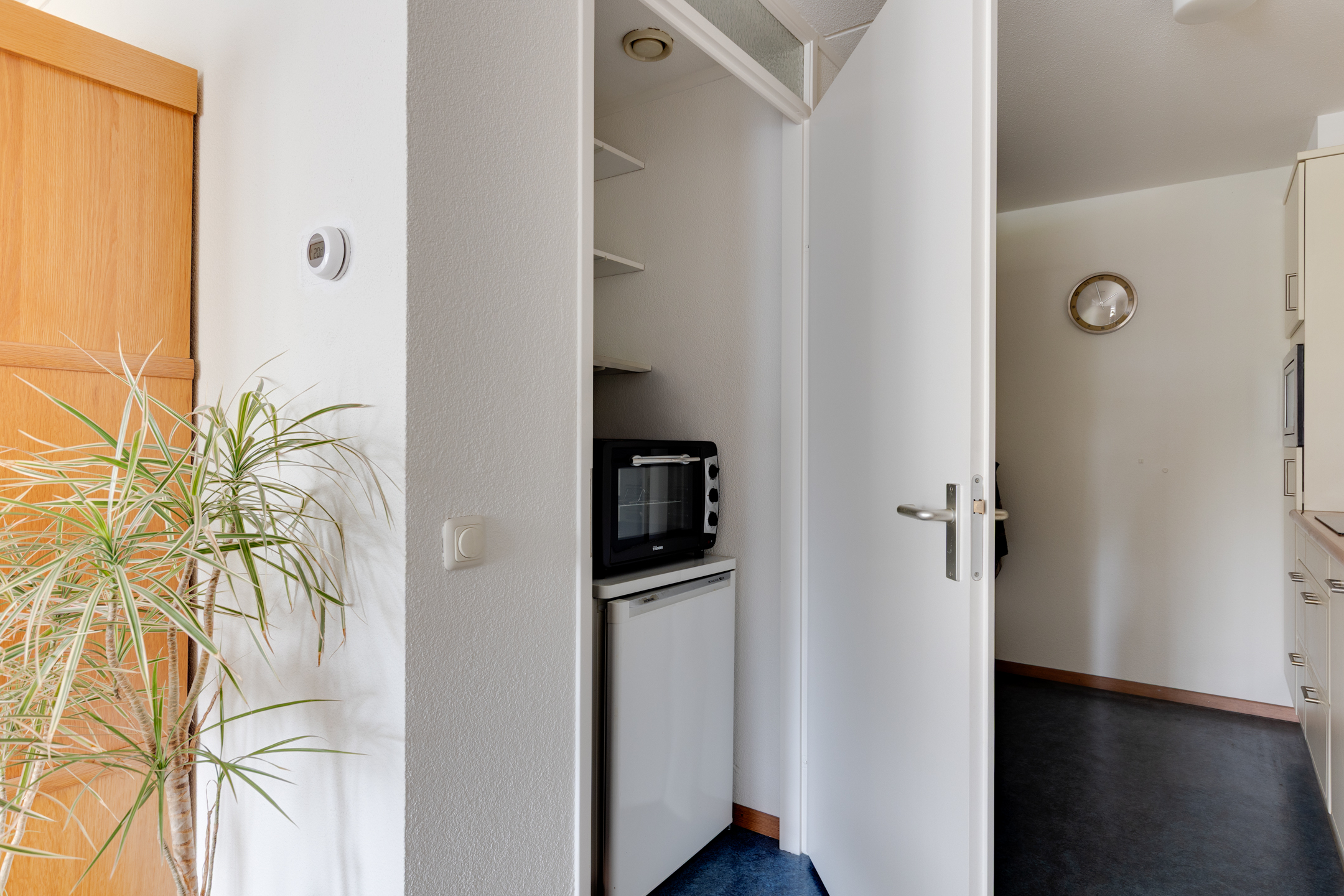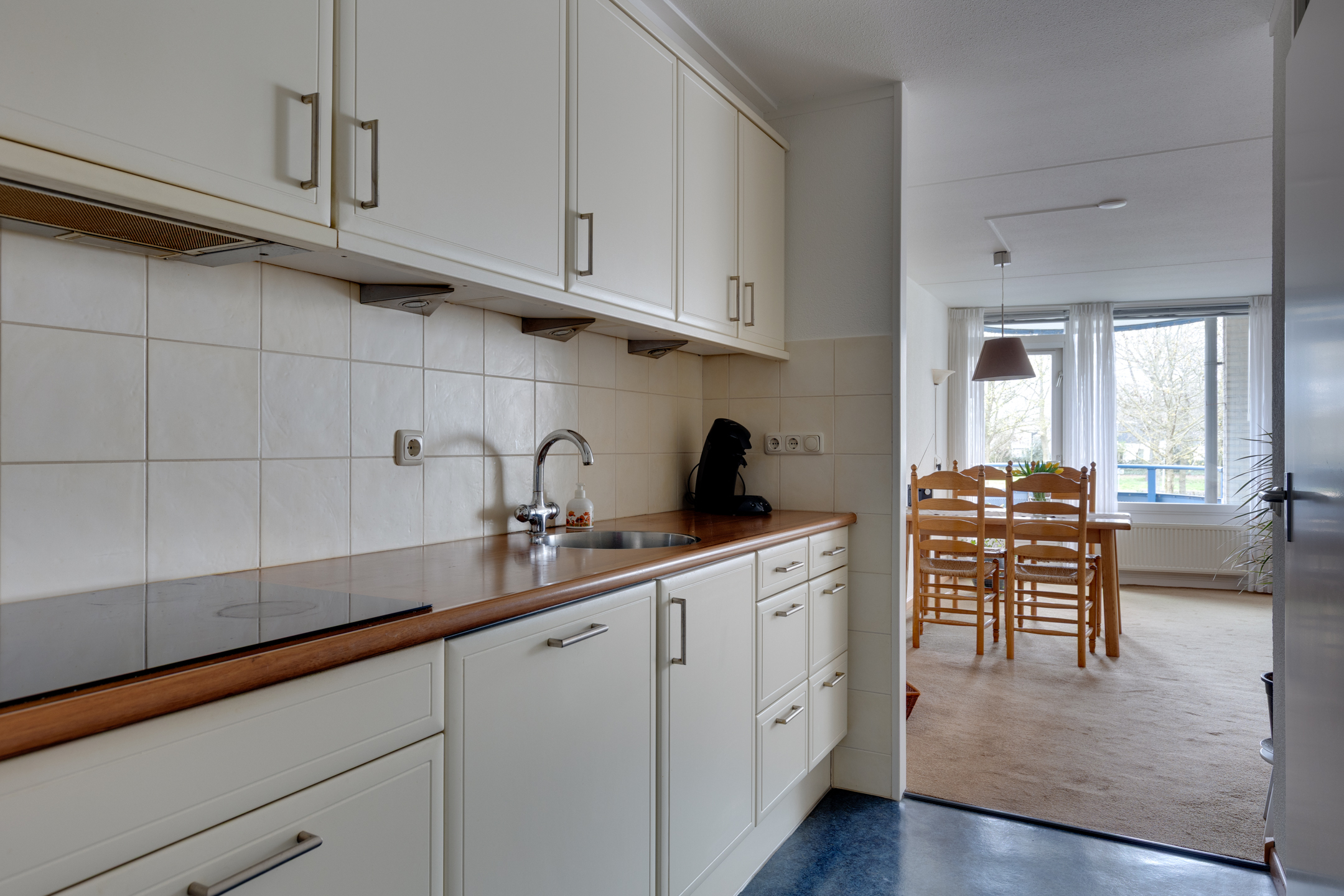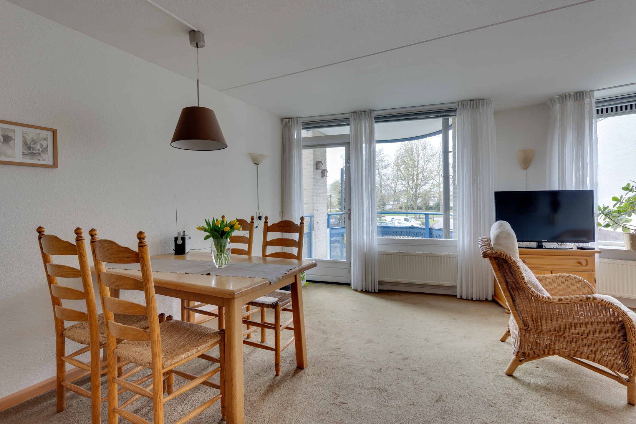 Op de eerste verdieping bereiken we het appartement. We komen via de entree/hal in de woonkamer. Vanuit de hal zijn ook het toilet met fonteintje en de badkamer met douche en wastafel bereikbaar. De woonkamer biedt een vrij uitzicht en geeft toegang tot het balkon. De keuken is voorzien van een provisiekast en diverse inbouwapparaten, waaronder een koelkast, combi-oven, kookplaat en afzuigkap. Vanuit de keuken is de berging bereikbaar, waar zich de aansluiting voor de wasmachine en droger bevindt.
