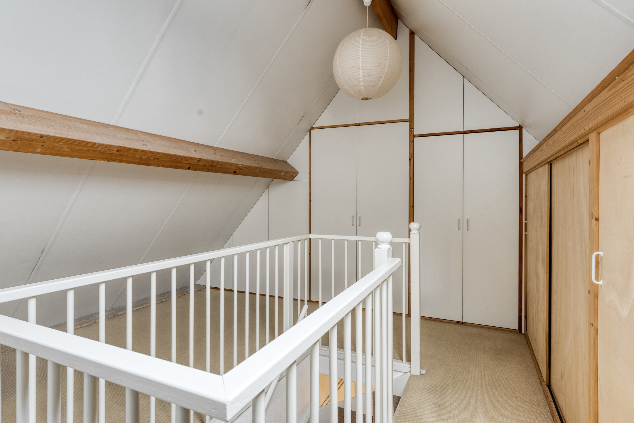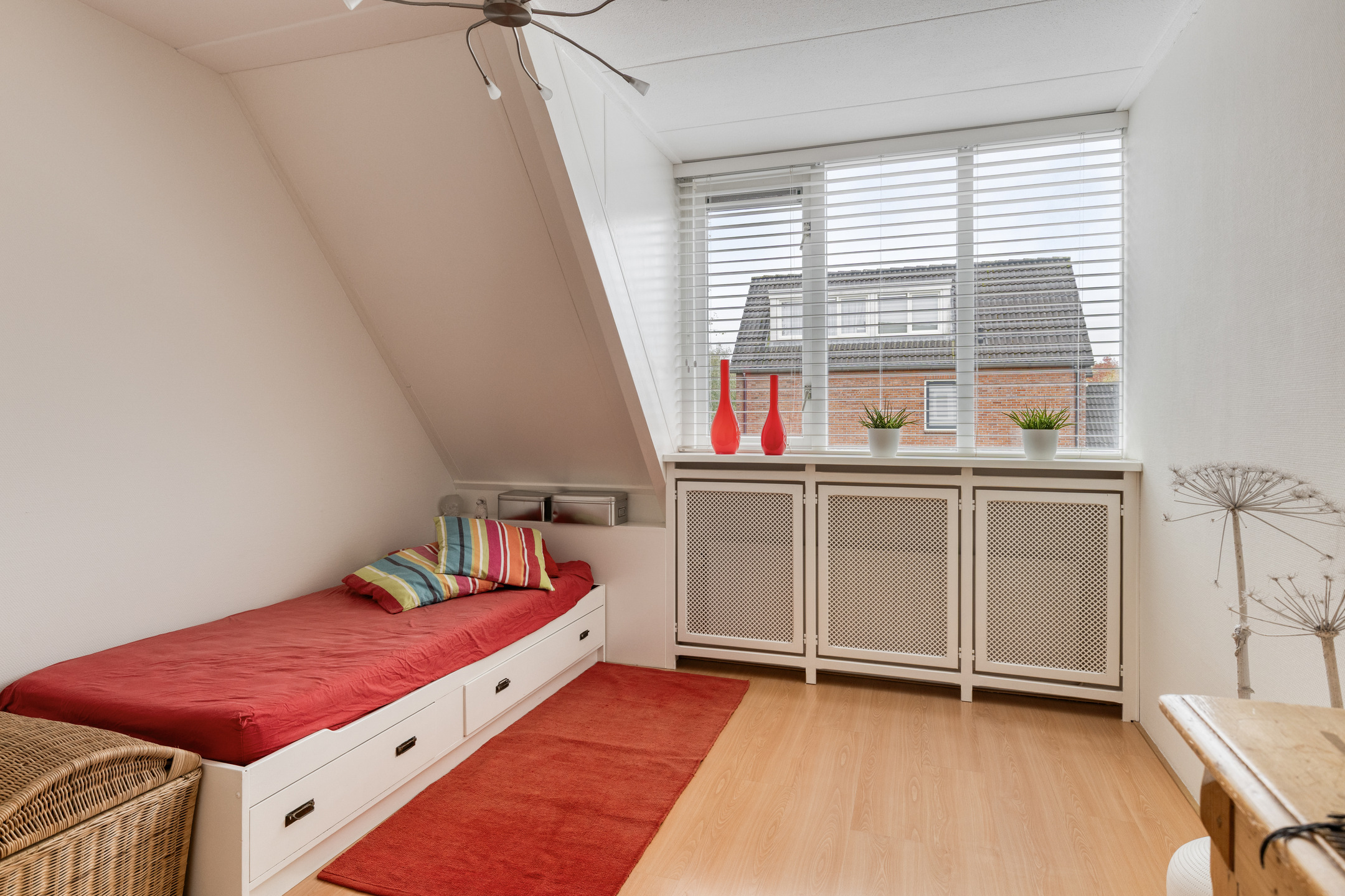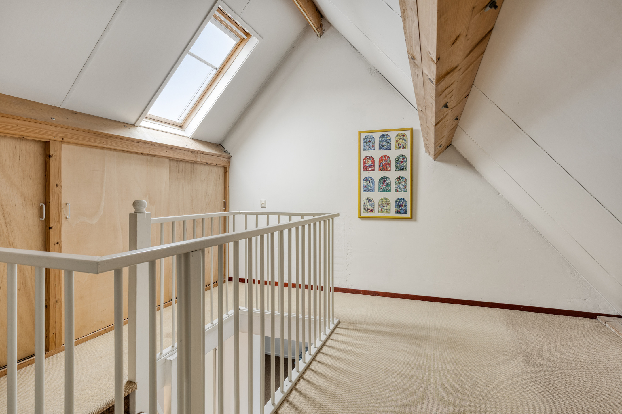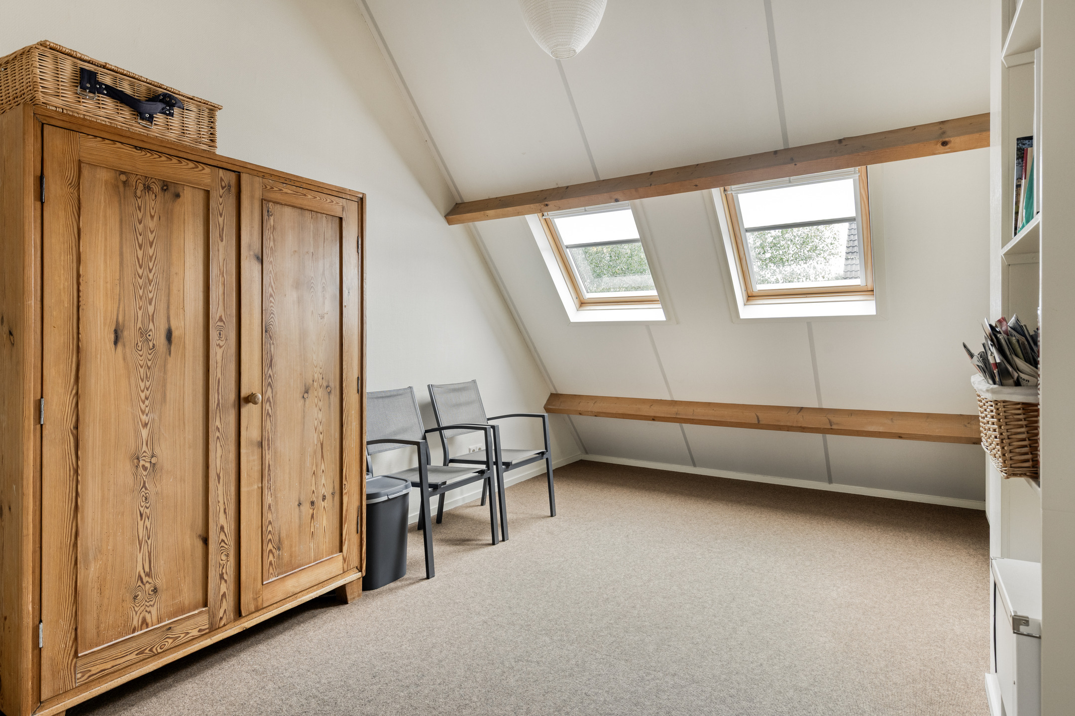 Op de eerste verdieping bevinden zich drie ruime slaapkamers en de badkamer. Dankzij de uitbouw is er extra leefruimte gecreëerd. De badkamer is voorzien van moderne gemakken en voorzien van vloerverwarming. Via een vaste trap bereik je de zolderverdieping- een veelzijdige ruimte die eenvoudig kan worden ingericht als 4e slaapkamer of hobbyruimte.
