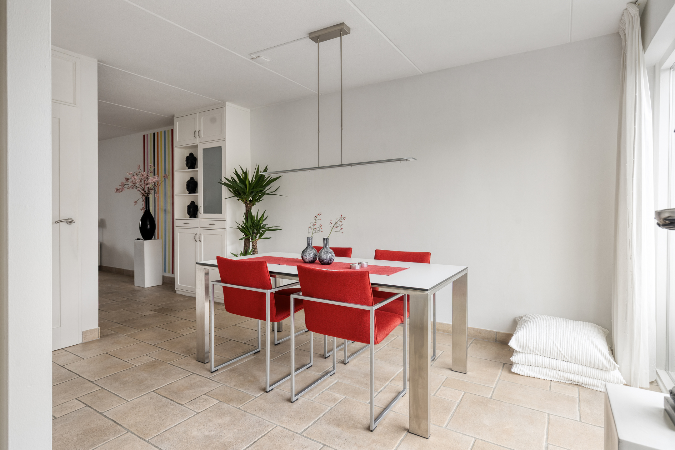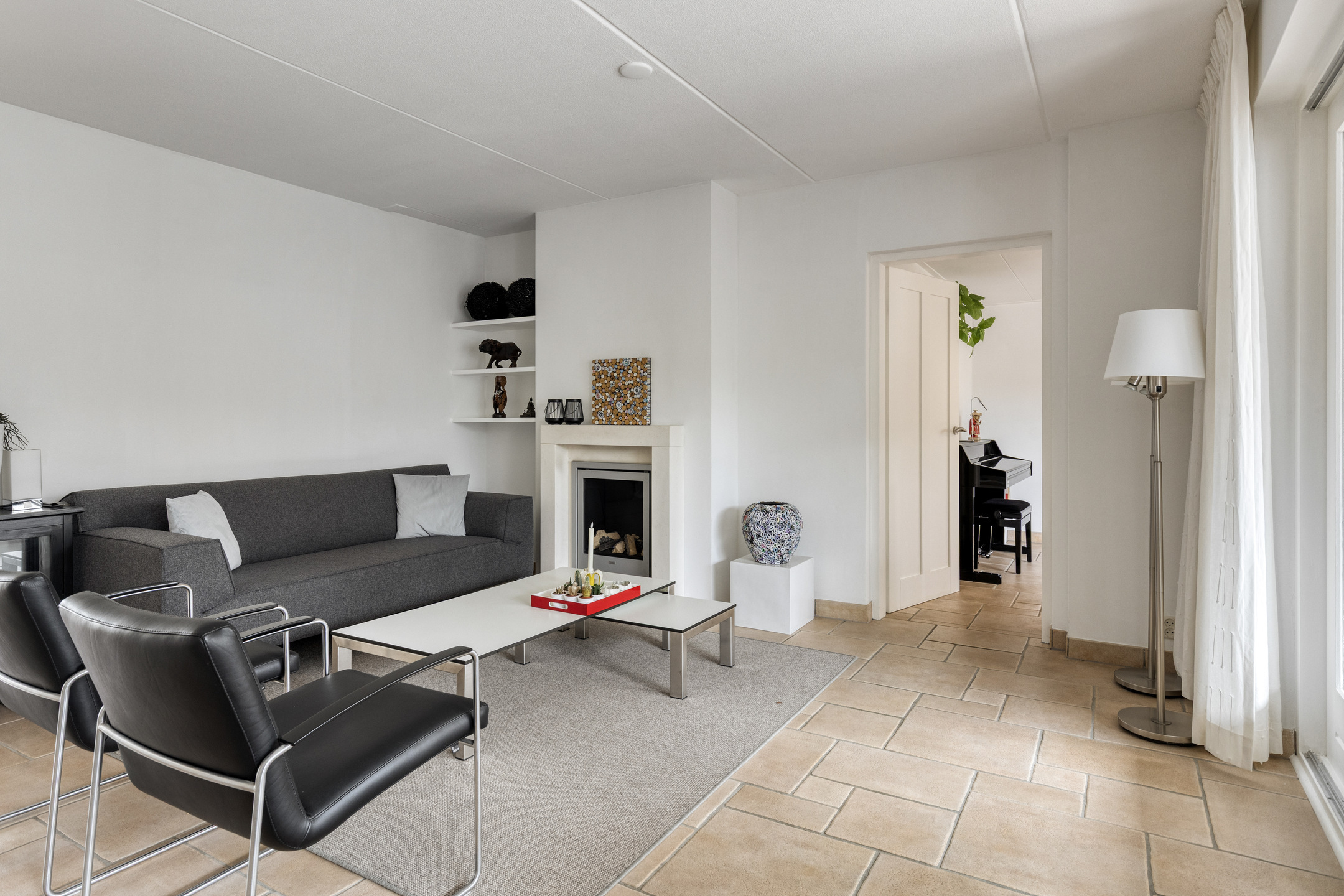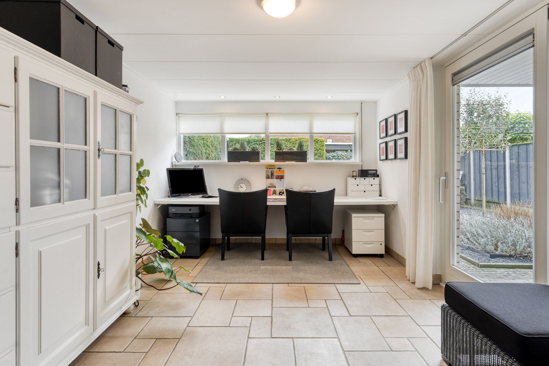 De straatgerichte keuken met eethoek heeft grote ramen waardoor er veel daglicht binnenvalt. De woonkamer aan de achterzijde is voorzien van een gashaard en een grote schuifpui naar de tuin. Aangrenzend bevindt zich een extra kamer, nu in gebruik als kantoor, eveneens met schuifpui naar de achtertuin. De gehele begane grond is voorzien van vloerverwarming.