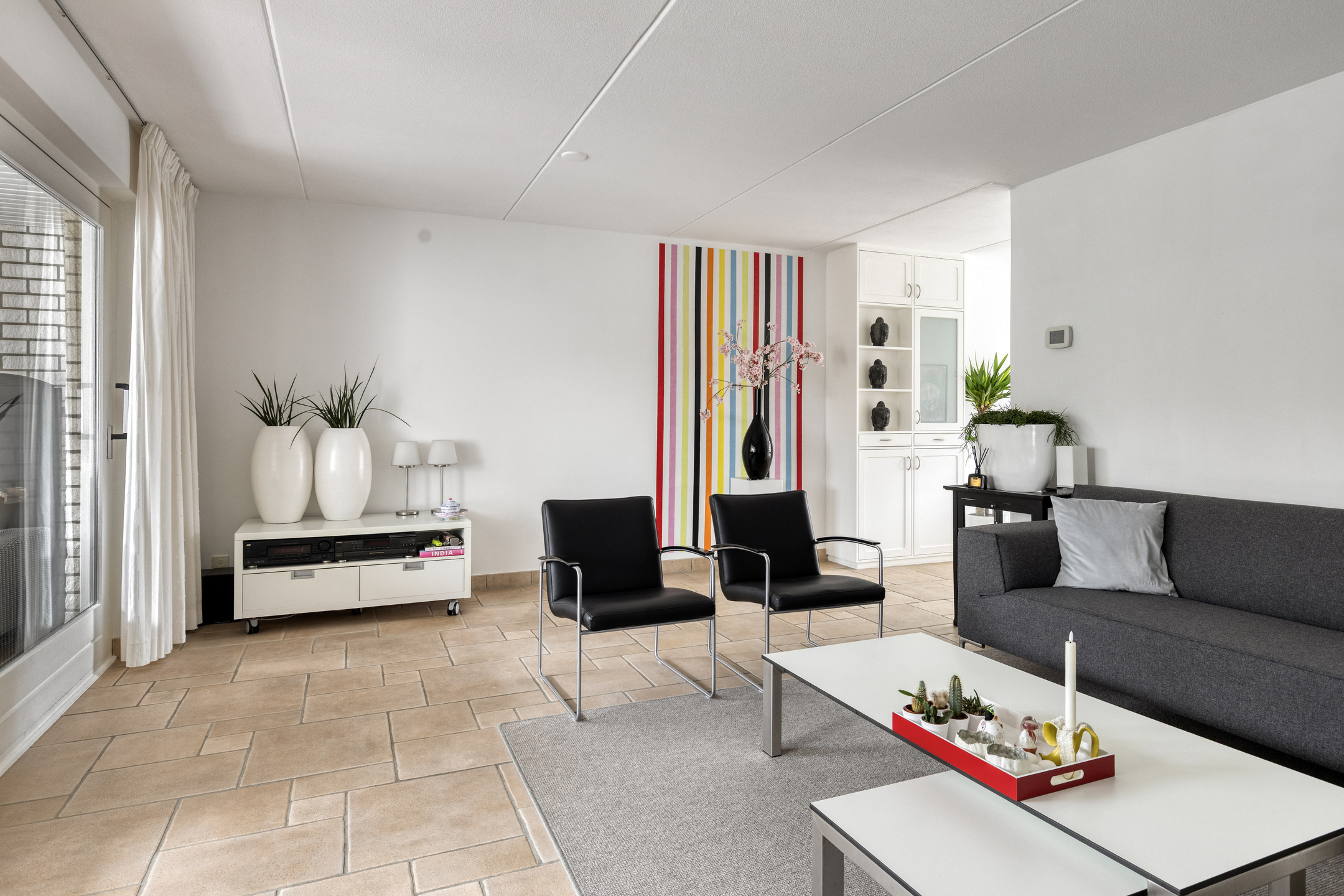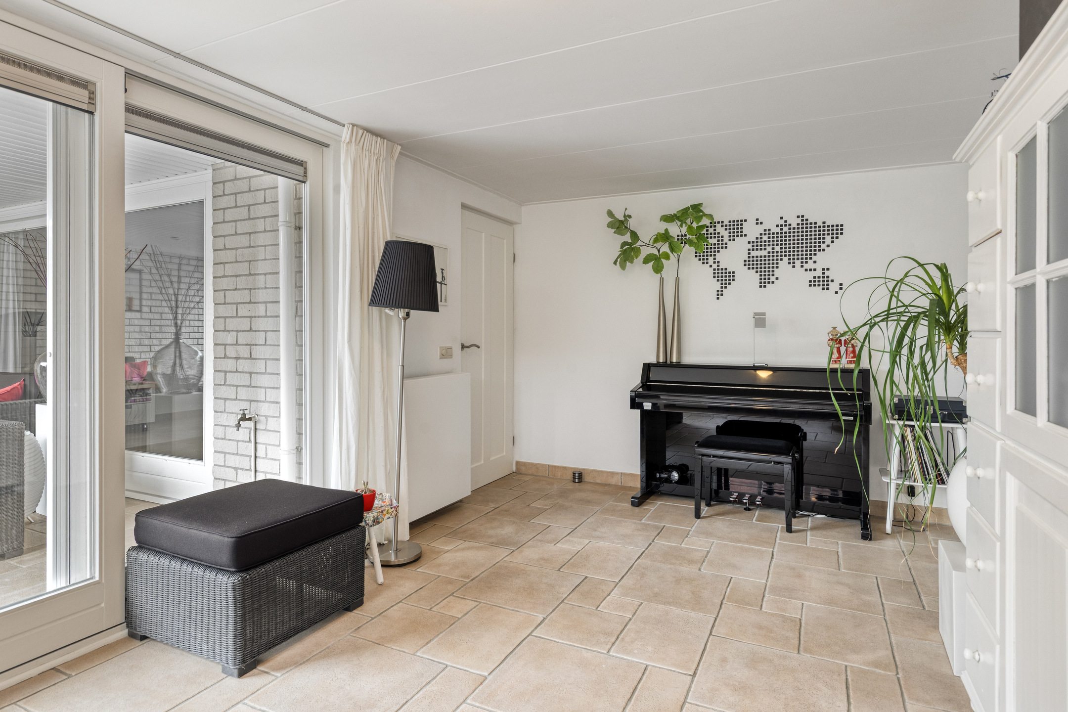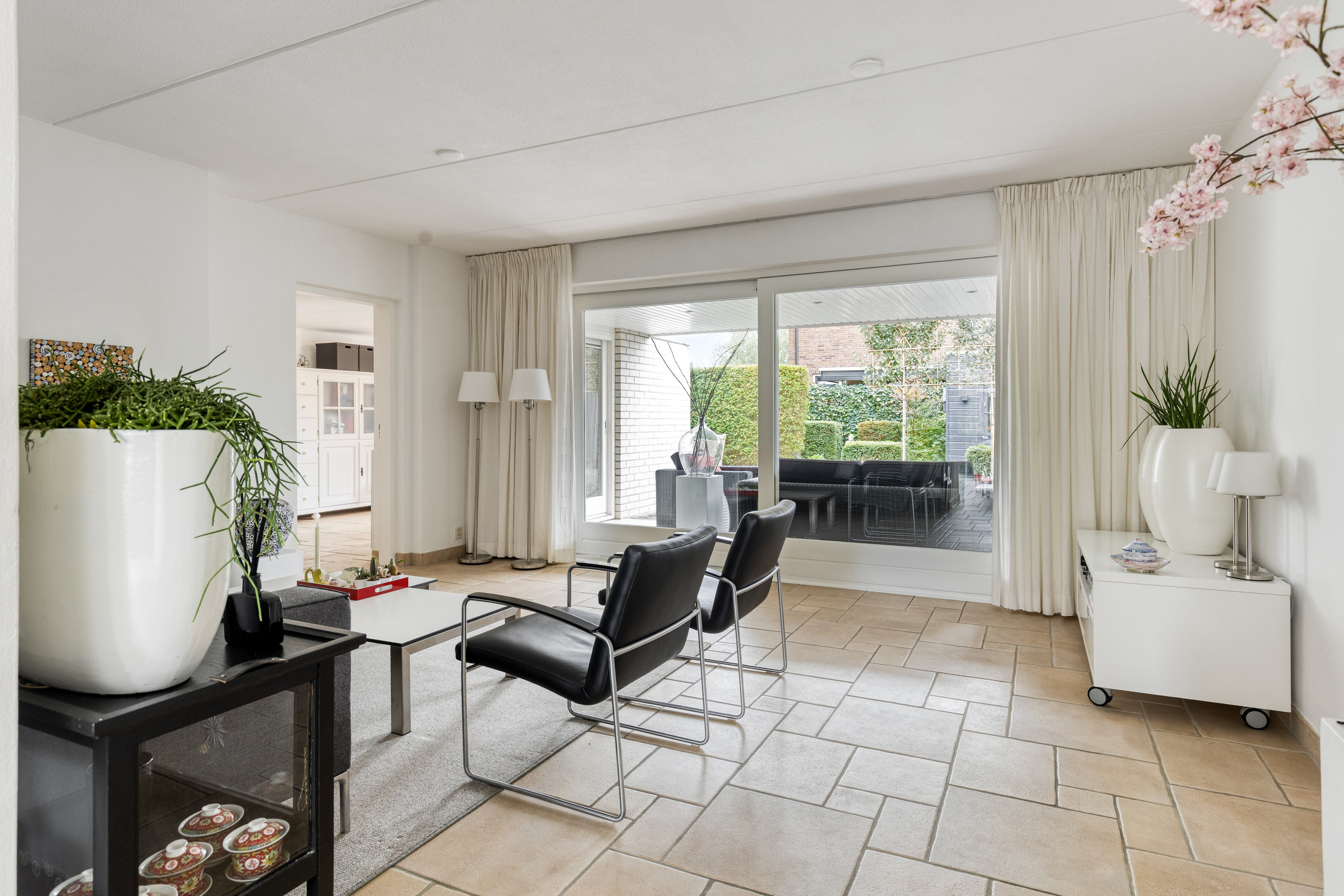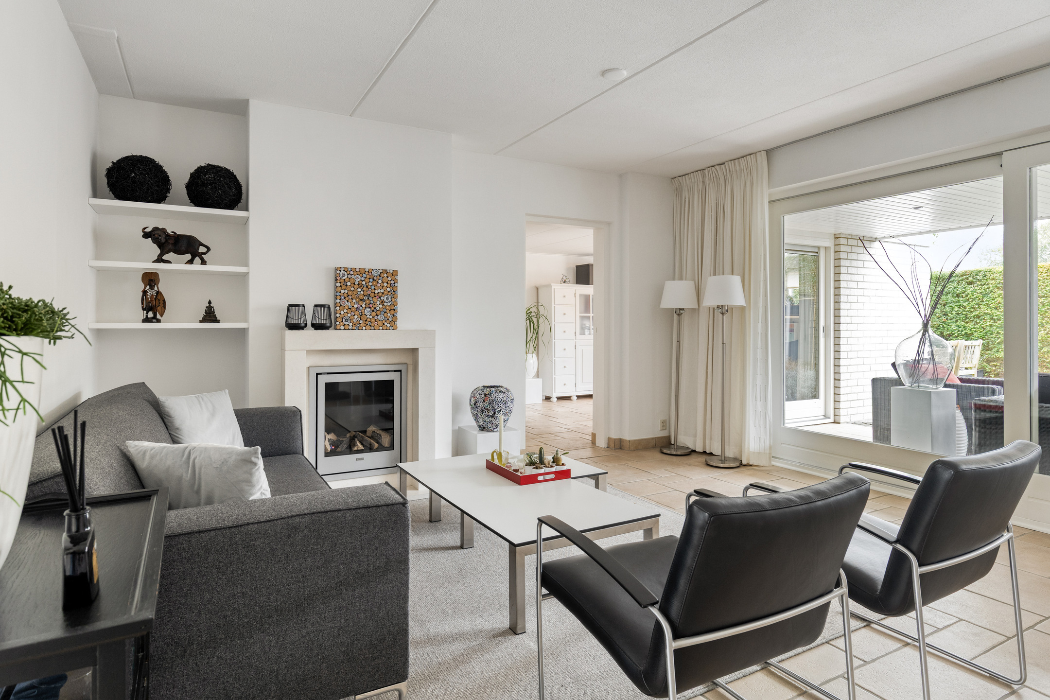 De straatgerichte keuken met eethoek heeft grote ramen waardoor er veel daglicht binnenvalt. De woonkamer aan de achterzijde is voorzien van een gashaard en een grote schuifpui naar de tuin. Aangrenzend bevindt zich een extra kamer, nu in gebruik als kantoor, eveneens met schuifpui naar de achtertuin. De gehele begane grond is voorzien van vloerverwarming.
