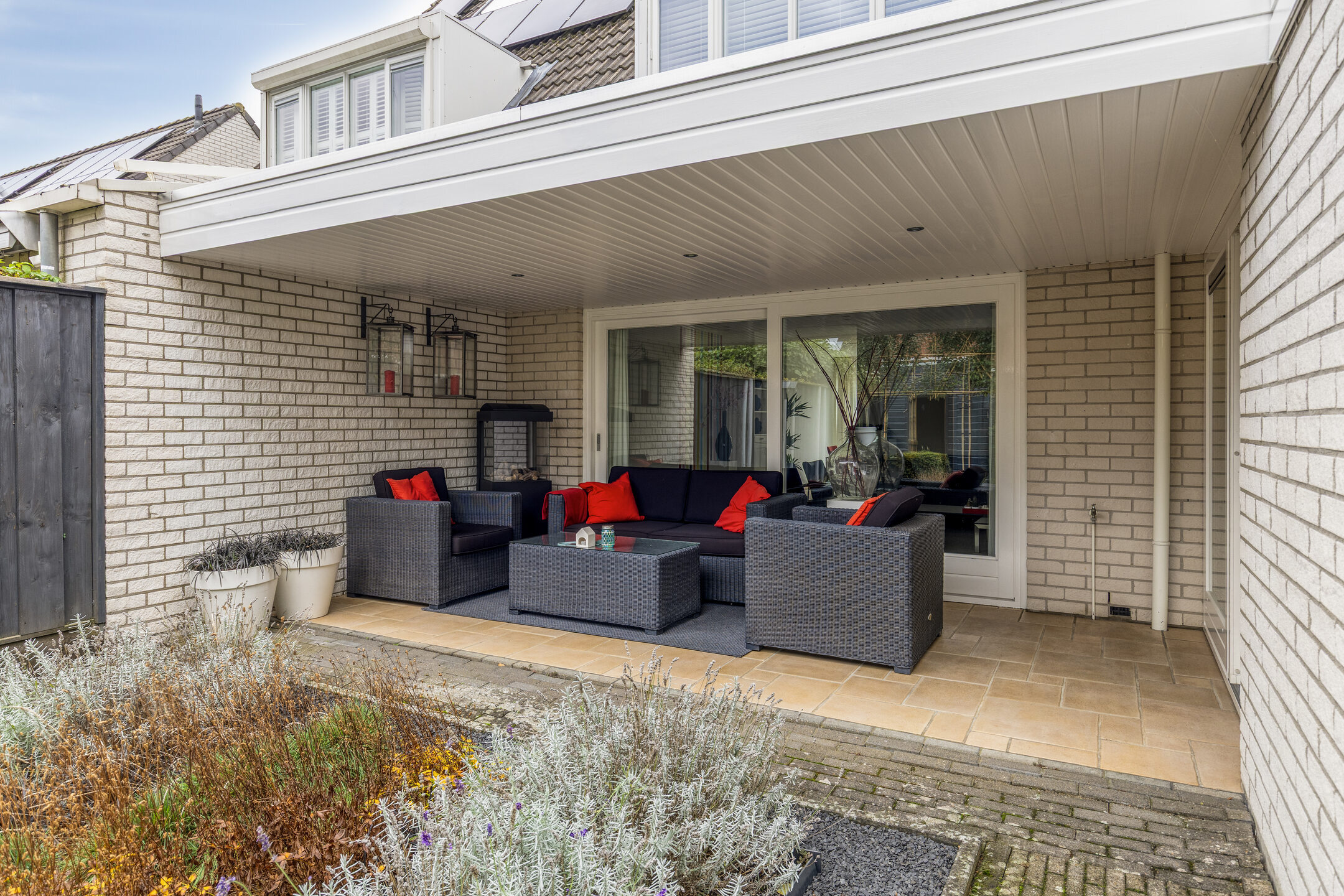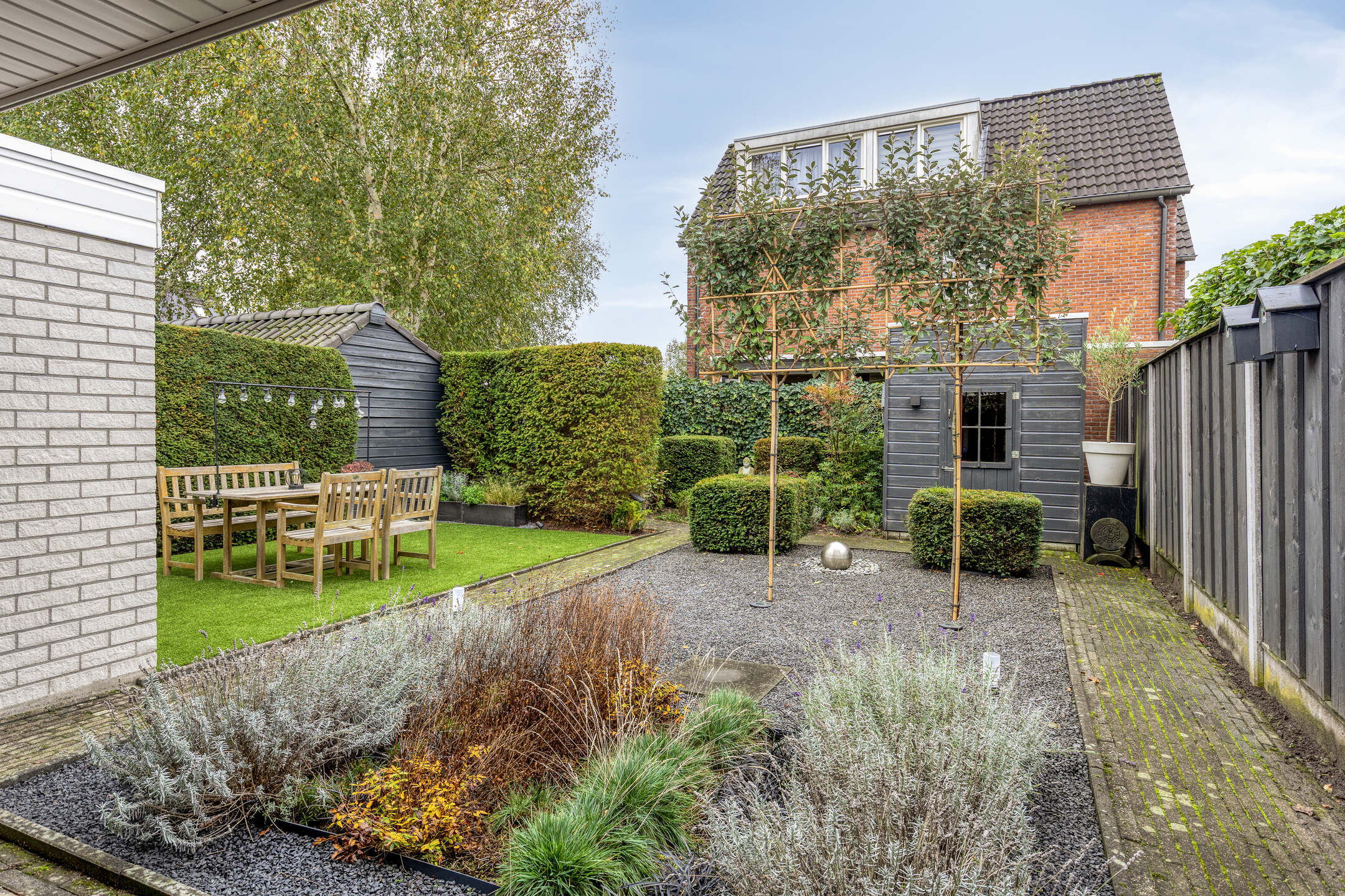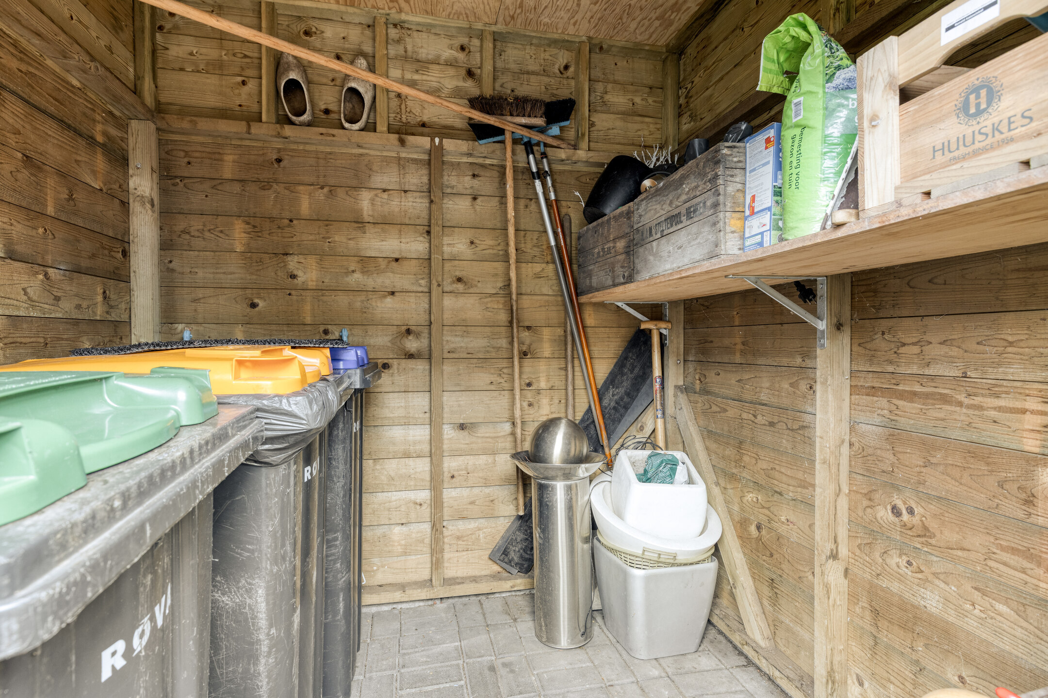 De achtertuin is voorzien van een ruime veranda met zithoek, een vrijstaande houten berging en een achterom. Een fijne plek om te genieten van rust en privacy.