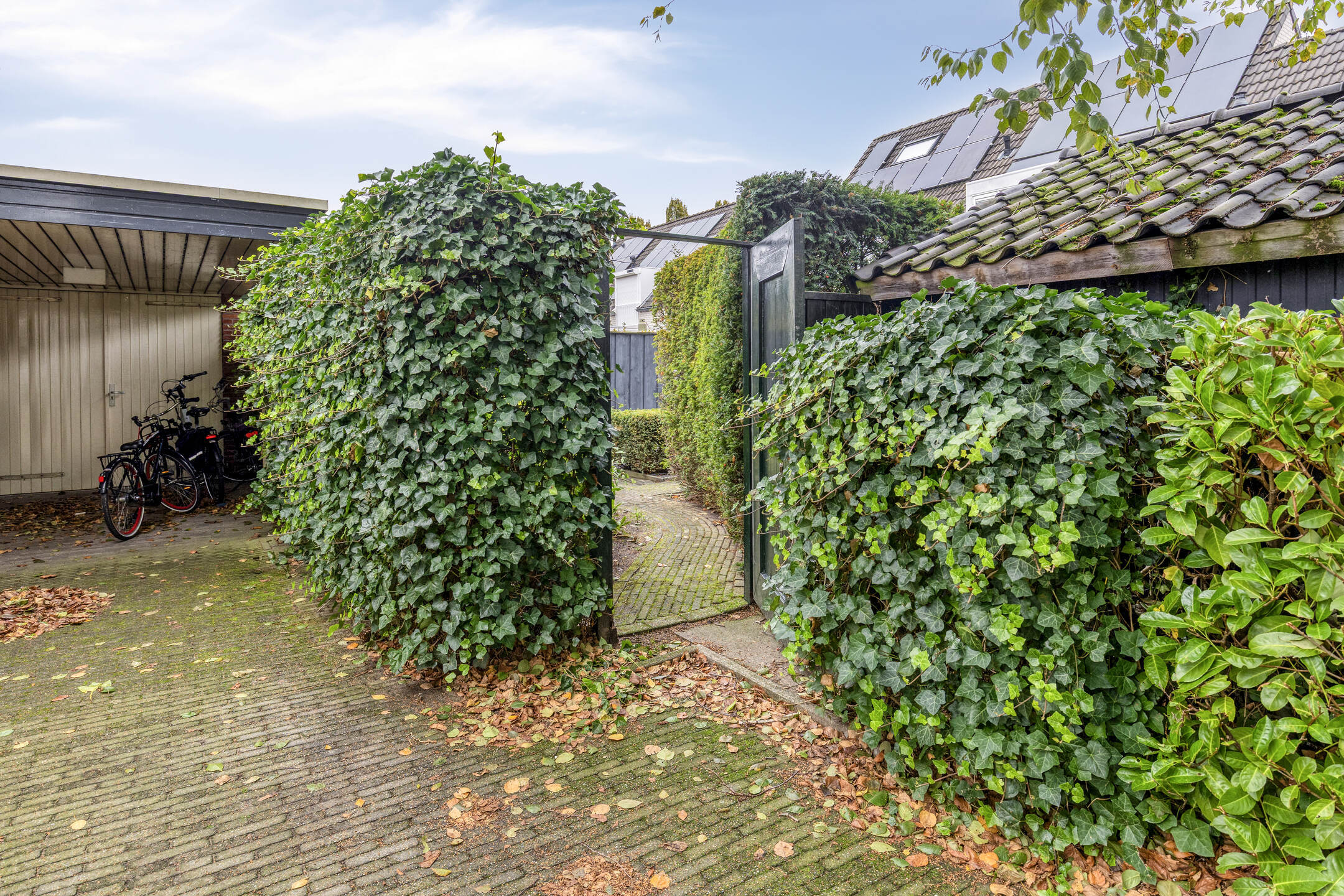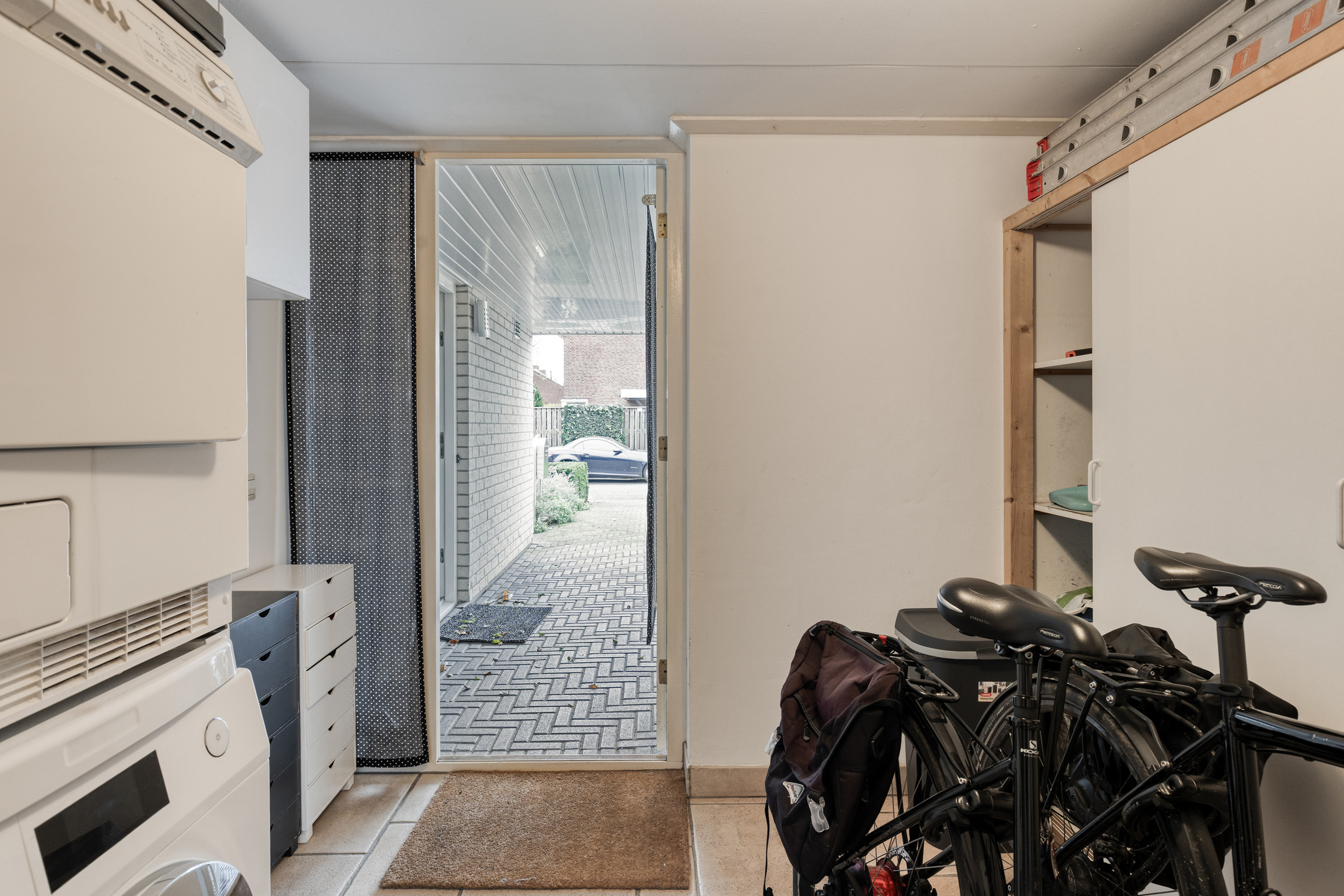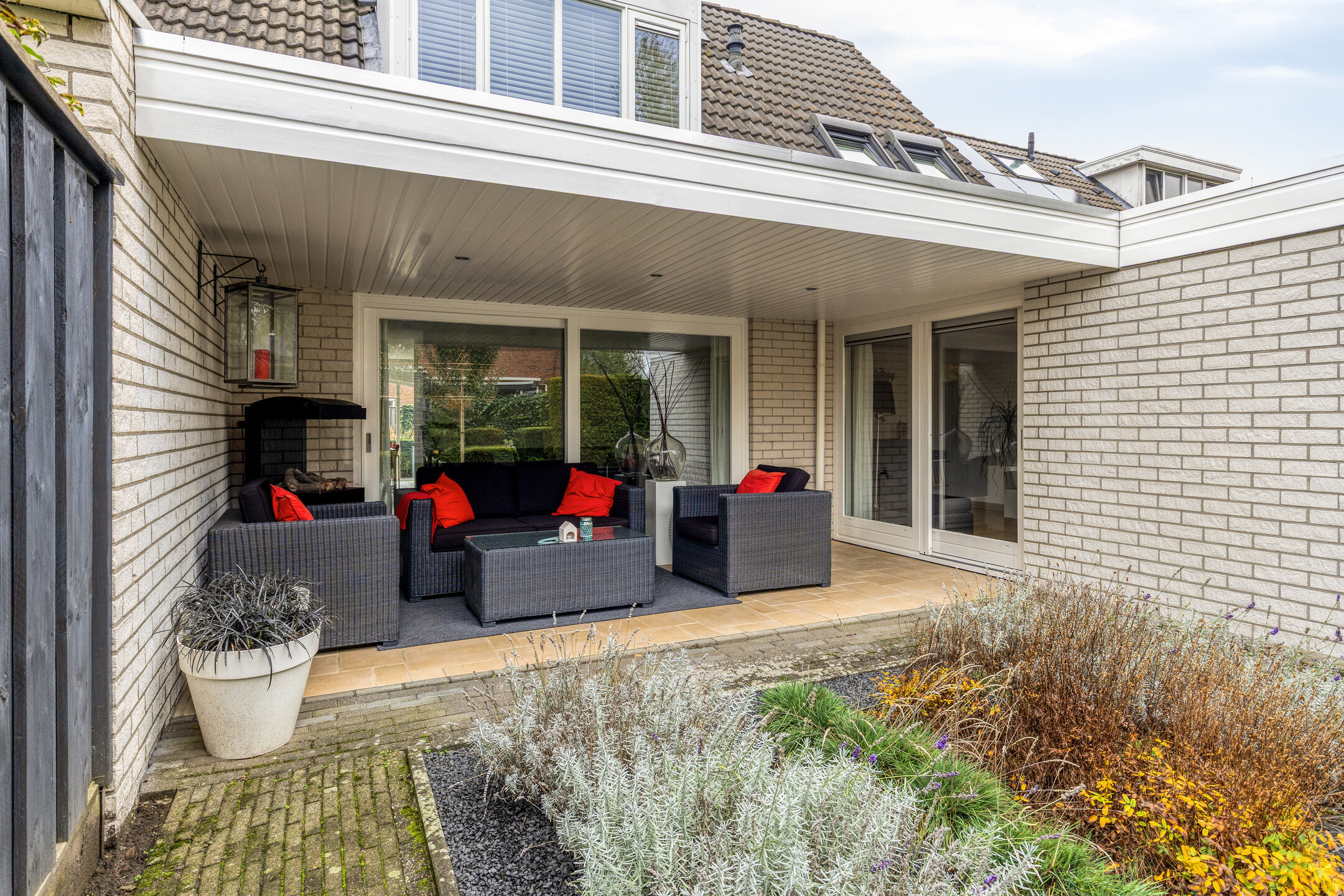 De achtertuin is voorzien van een ruime veranda met zithoek, een vrijstaande houten berging en een achterom. Een fijne plek om te genieten van rust en privacy.
