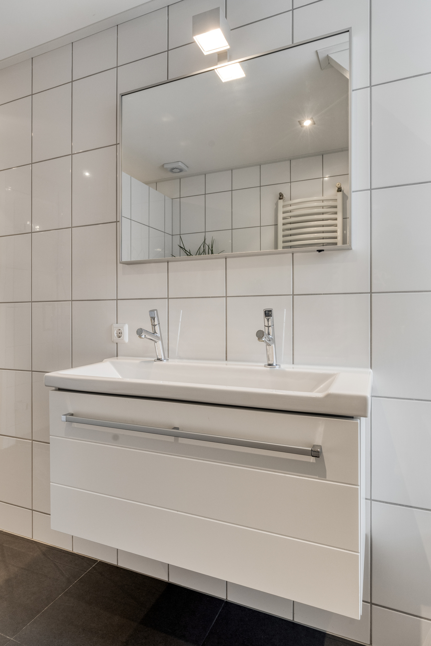 1e VERDIEPING: ruime overloop; bergkast; drie ruime slaapkamers; badkamer met dubbele wastafelmeubel, ligbad, inloopdouche en toilet en elektrische vloerverwarming.
