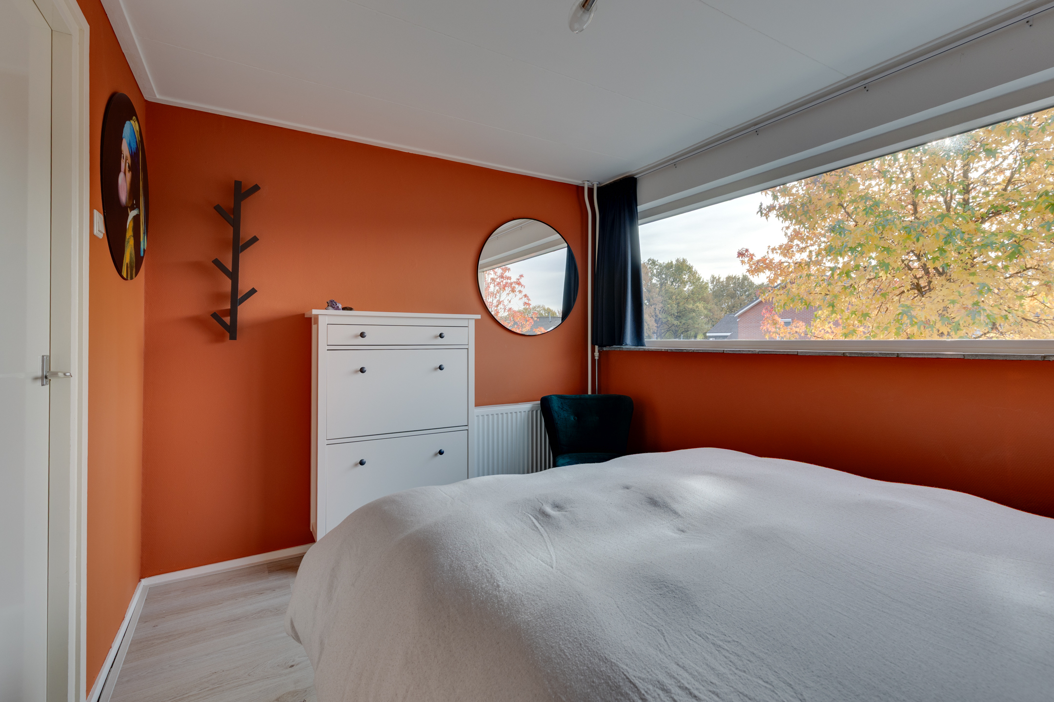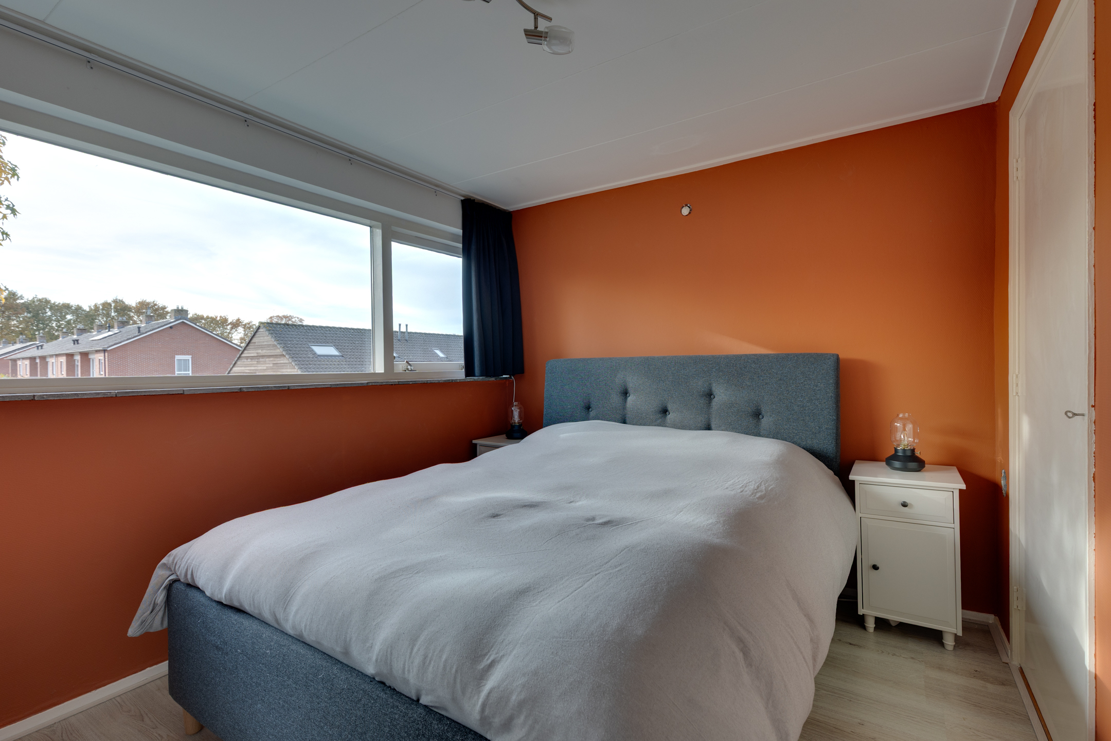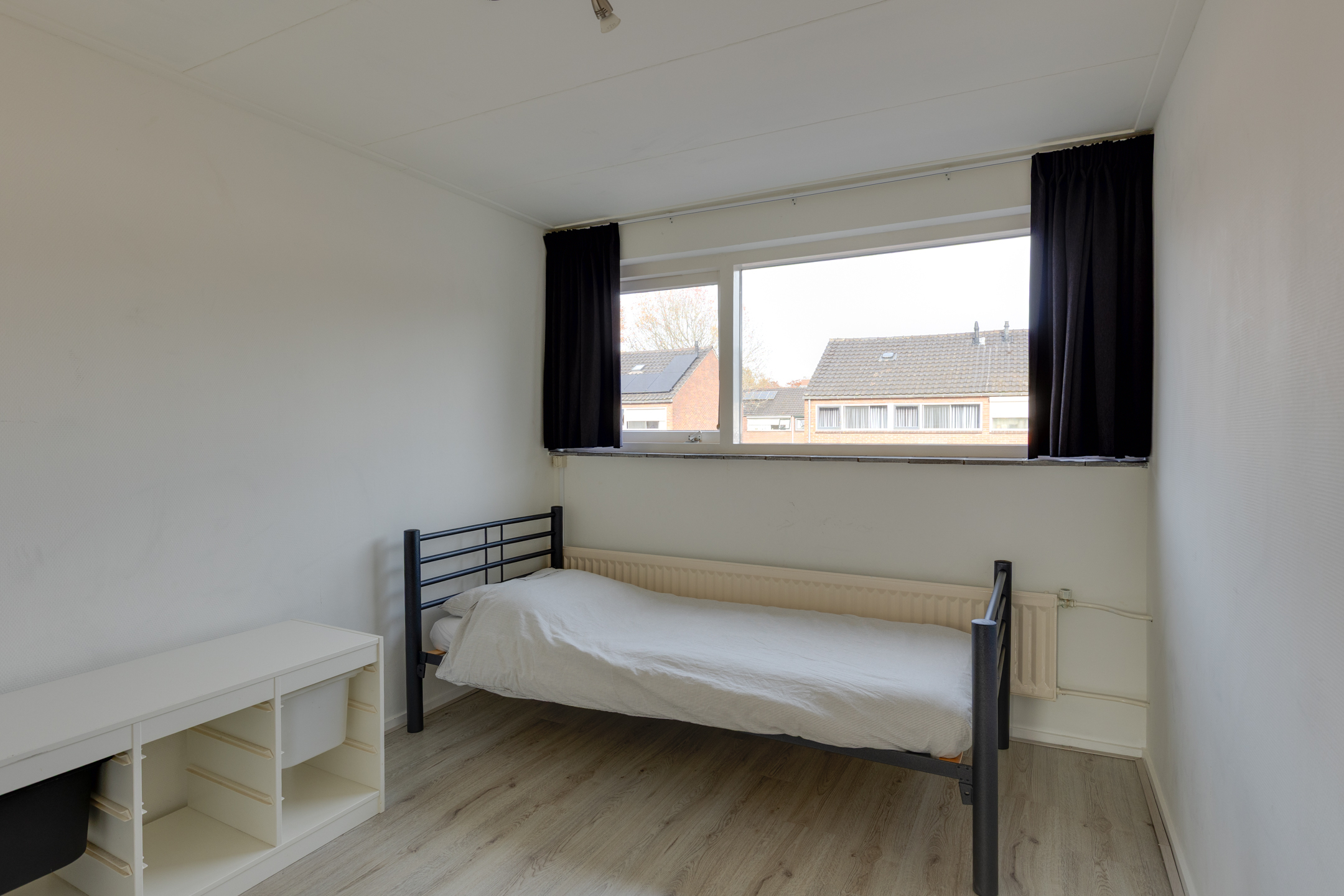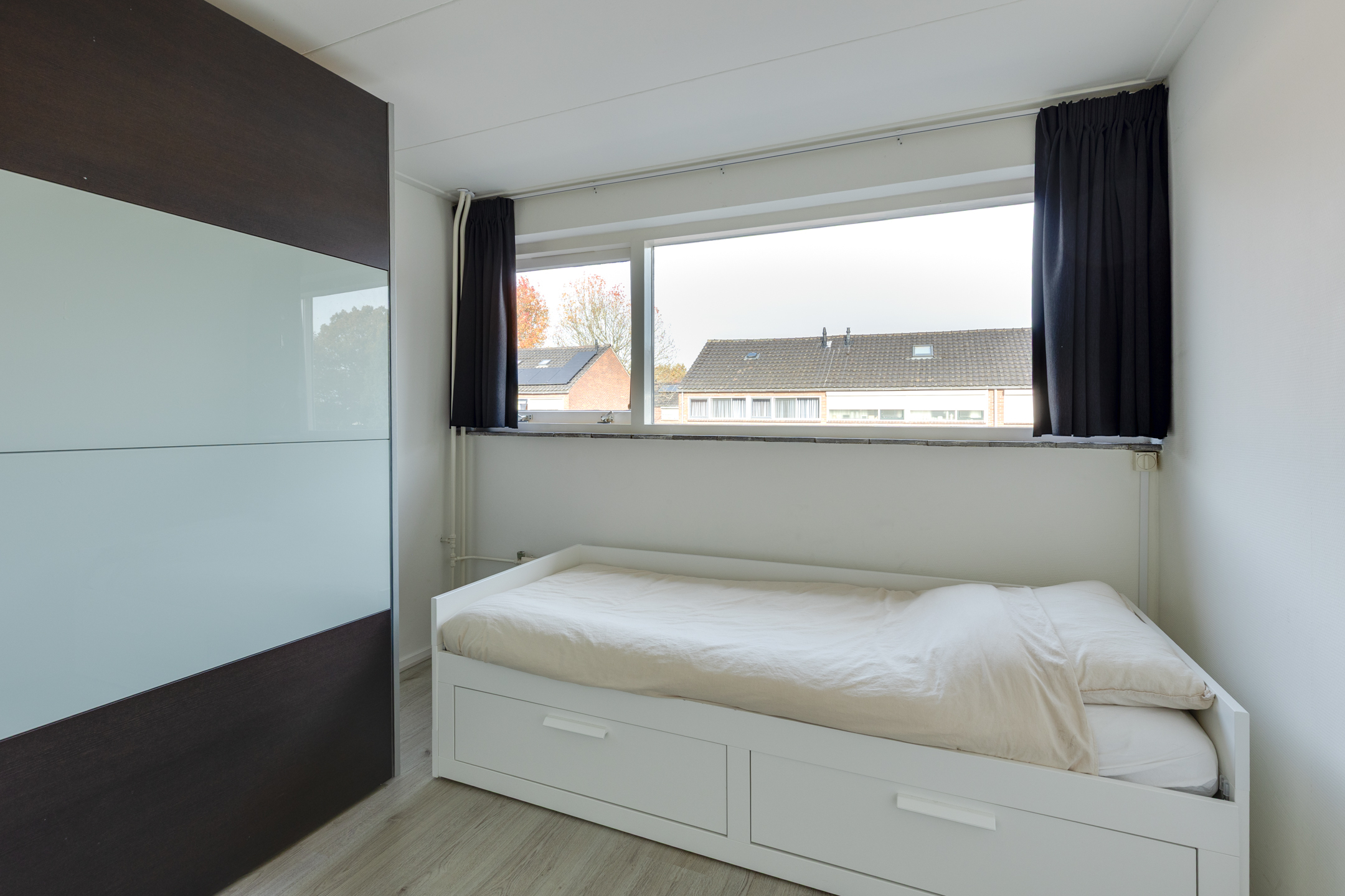 Boven zijn drie slaapkamers te vinden, twee voorzien van een inbouwkast en allen met rolluiken aan de buitenzijde. De badkamer in moderne kleurstelling bestaat uit een douche, wastafelmeubel en een toilet. De tweede verdieping is via een vlizotrap te bereiken, hier bevindt zich de bergzolder.