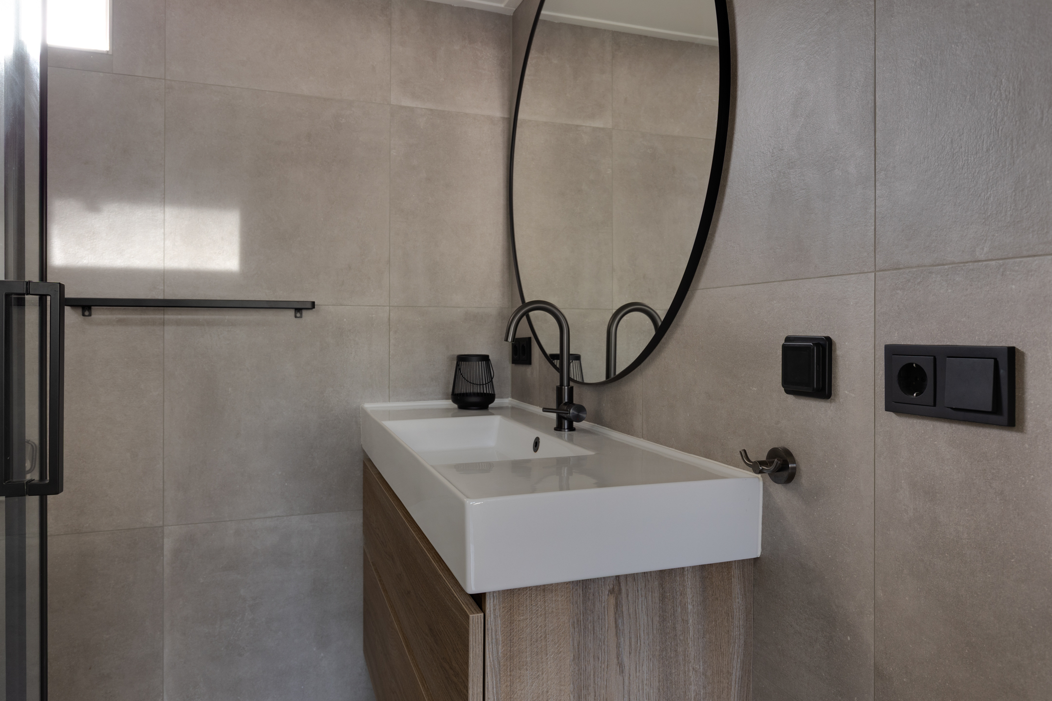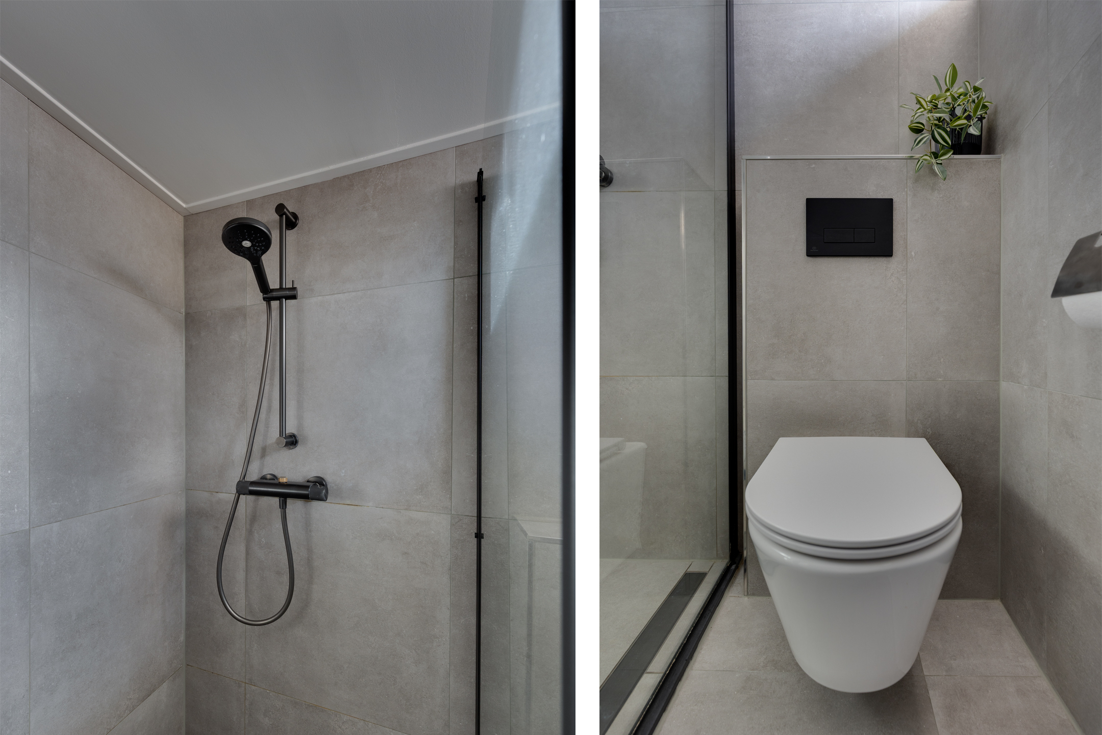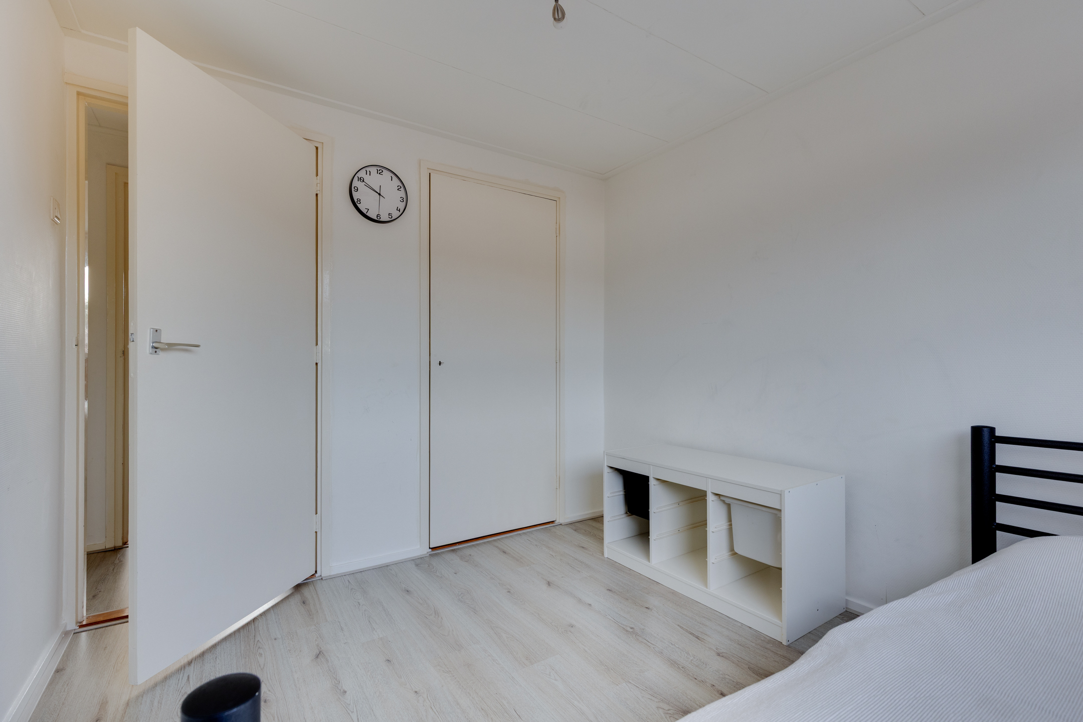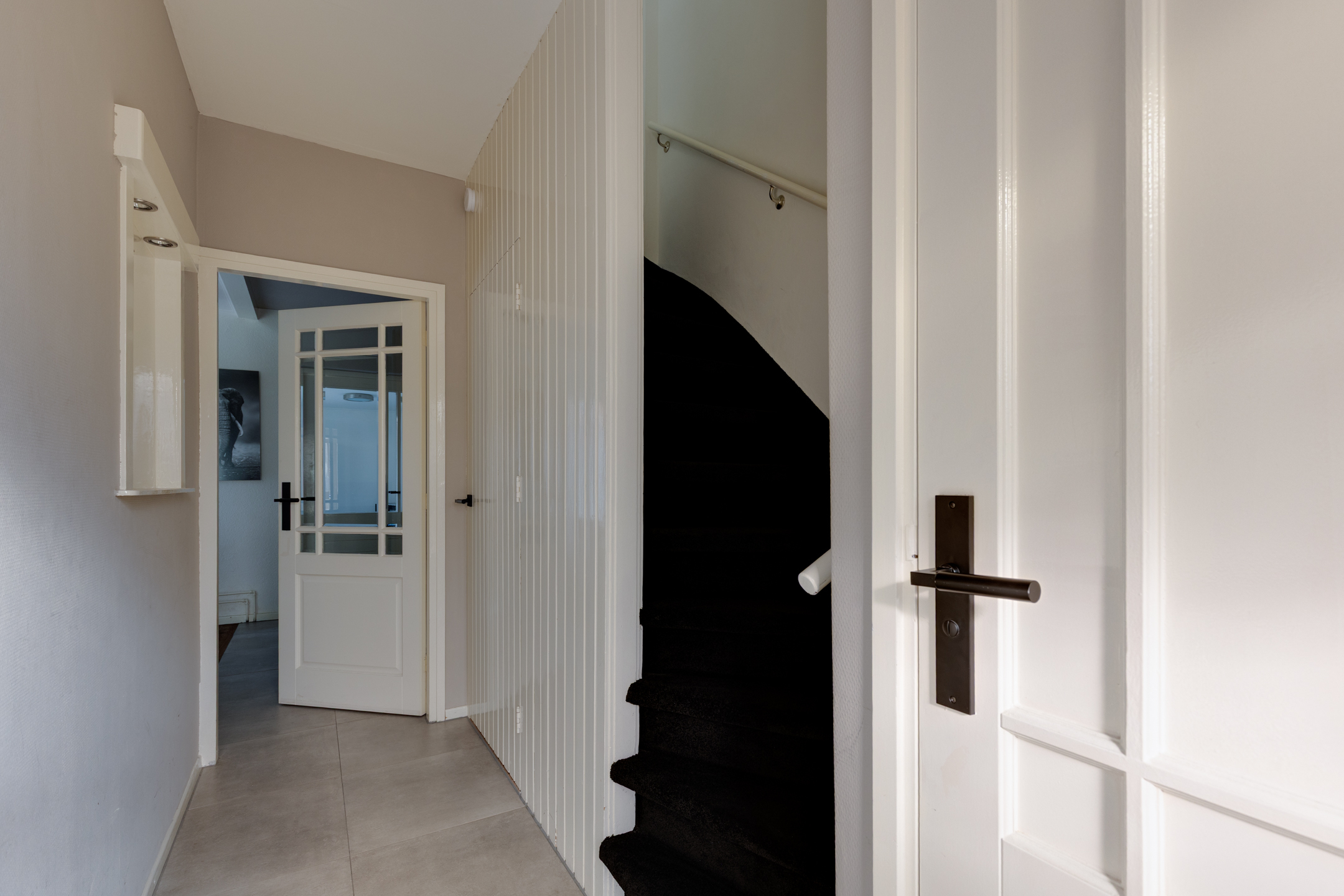 Boven zijn drie slaapkamers te vinden, twee voorzien van een inbouwkast en allen met rolluiken aan de buitenzijde. De badkamer in moderne kleurstelling bestaat uit een douche, wastafelmeubel en een toilet. De tweede verdieping is via een vlizotrap te bereiken, hier bevindt zich de bergzolder.