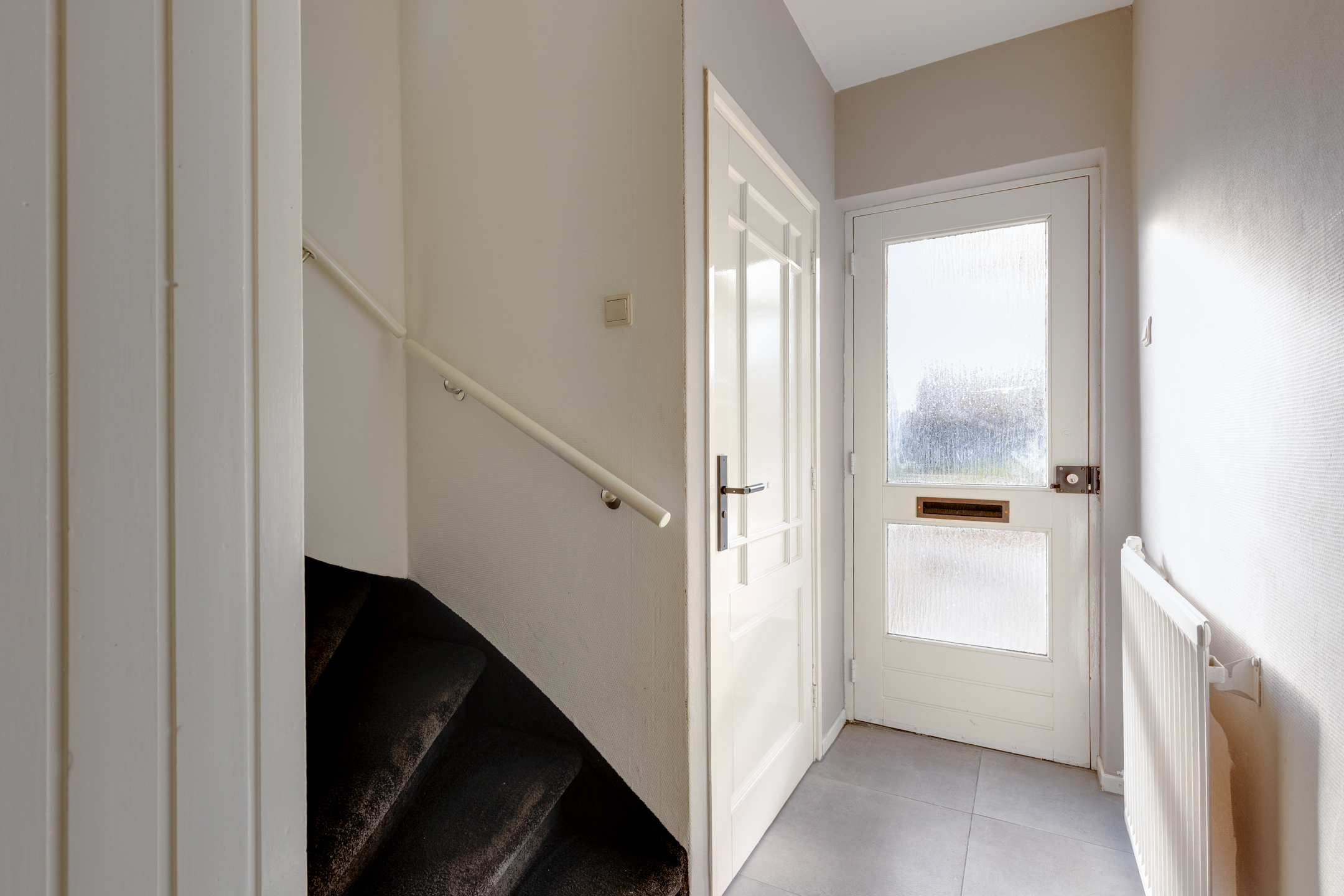 BEGANE GROND: entree/hal met trapopgang; toilet; kelderkast en tevens bevindt zich hier de meterkast; open keuken met plavuizen en voorzien van inbouwapparatuur (koelkast, vaatwasser, oven, afzuigschouw en inductieplaat); lichte woonkamer met erker voorzien van een houten vloer, houtkachel en aan de voor- en achterzijde elektrische rolluiken; bijkeuken met aansluiting voor de wasmachine en een deur die toegang geeft naar de achtertuin. In de onderhoudsvriendelijke achtertuin bevindt zich een stenen schuur.