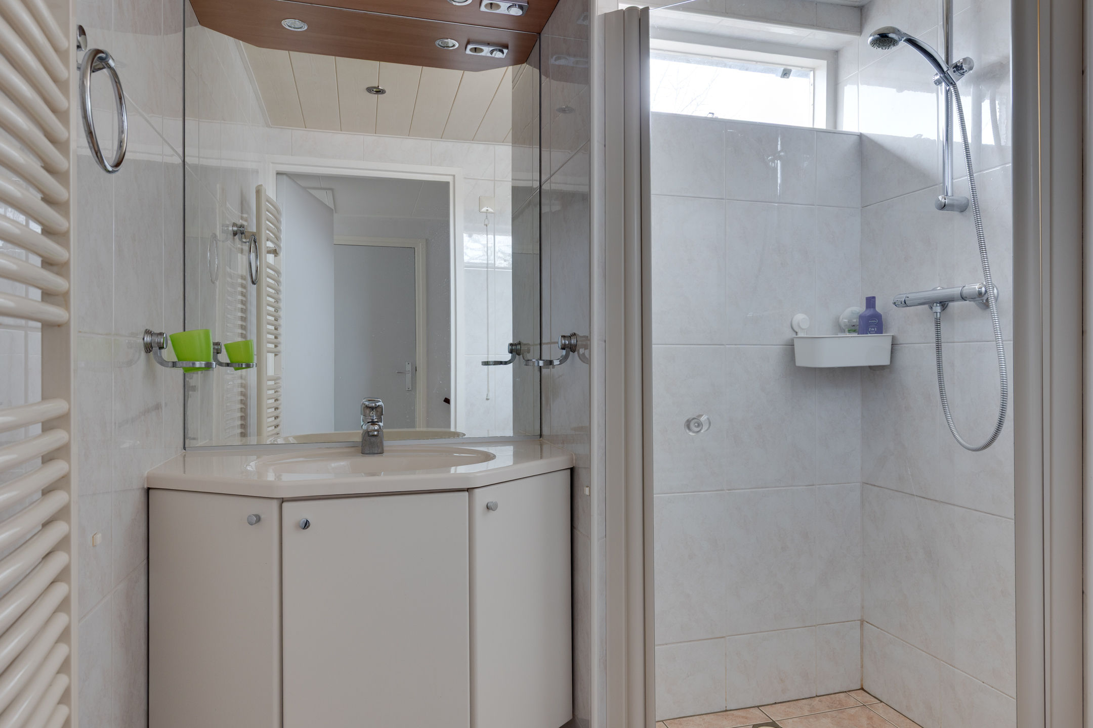 Boven aangekomen op de overloop zien wij een vijftal deuren. De overloop is namelijk voorzien van een vaste kast en de overloop geeft toegang tot drie slaapkamers en een badkamer. Twee van de drie slaapkamers zijn voorzien van een vaste kast. De badkamer is voorzien van een wastafel, douchecabine en een toilet.