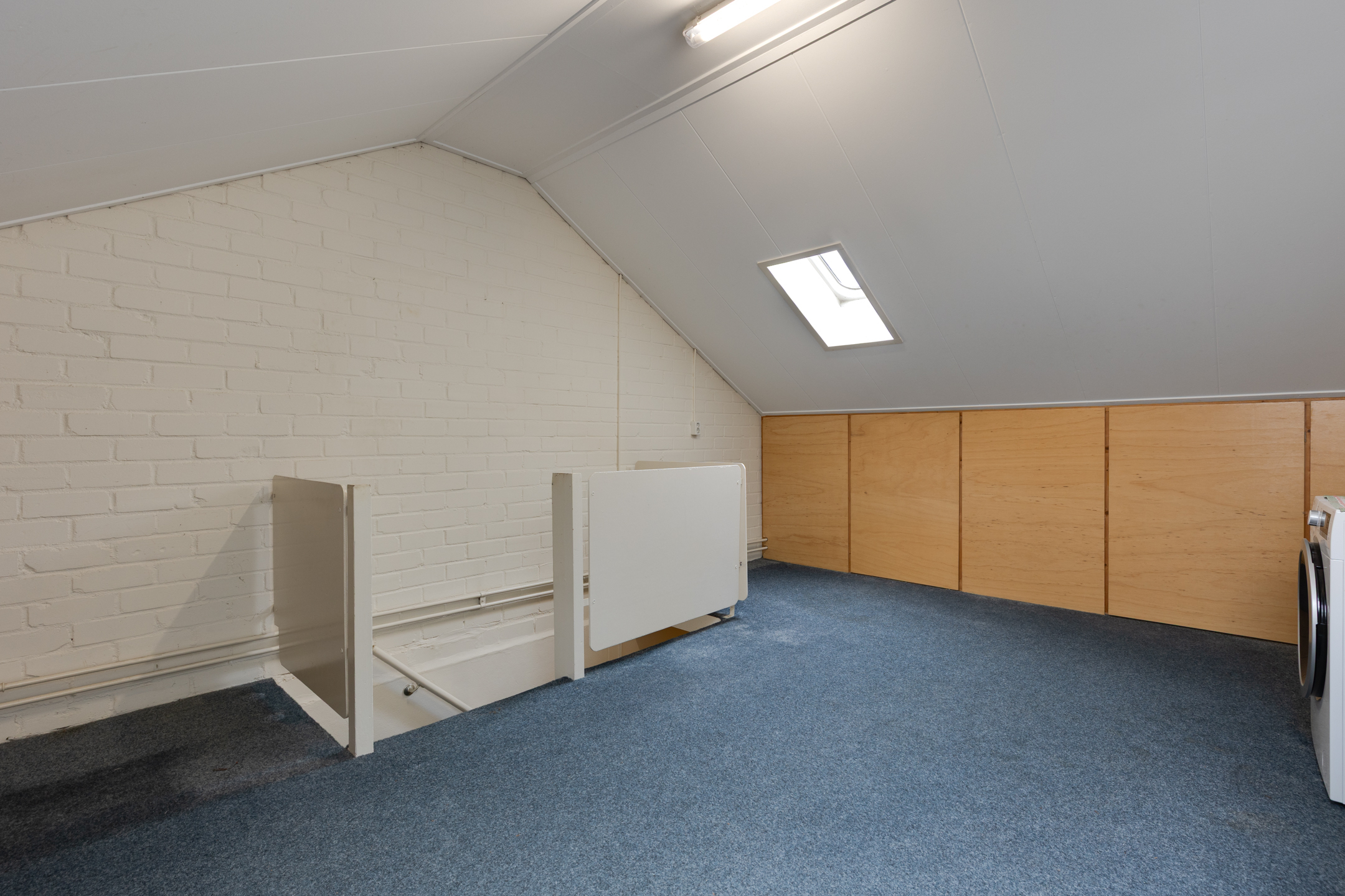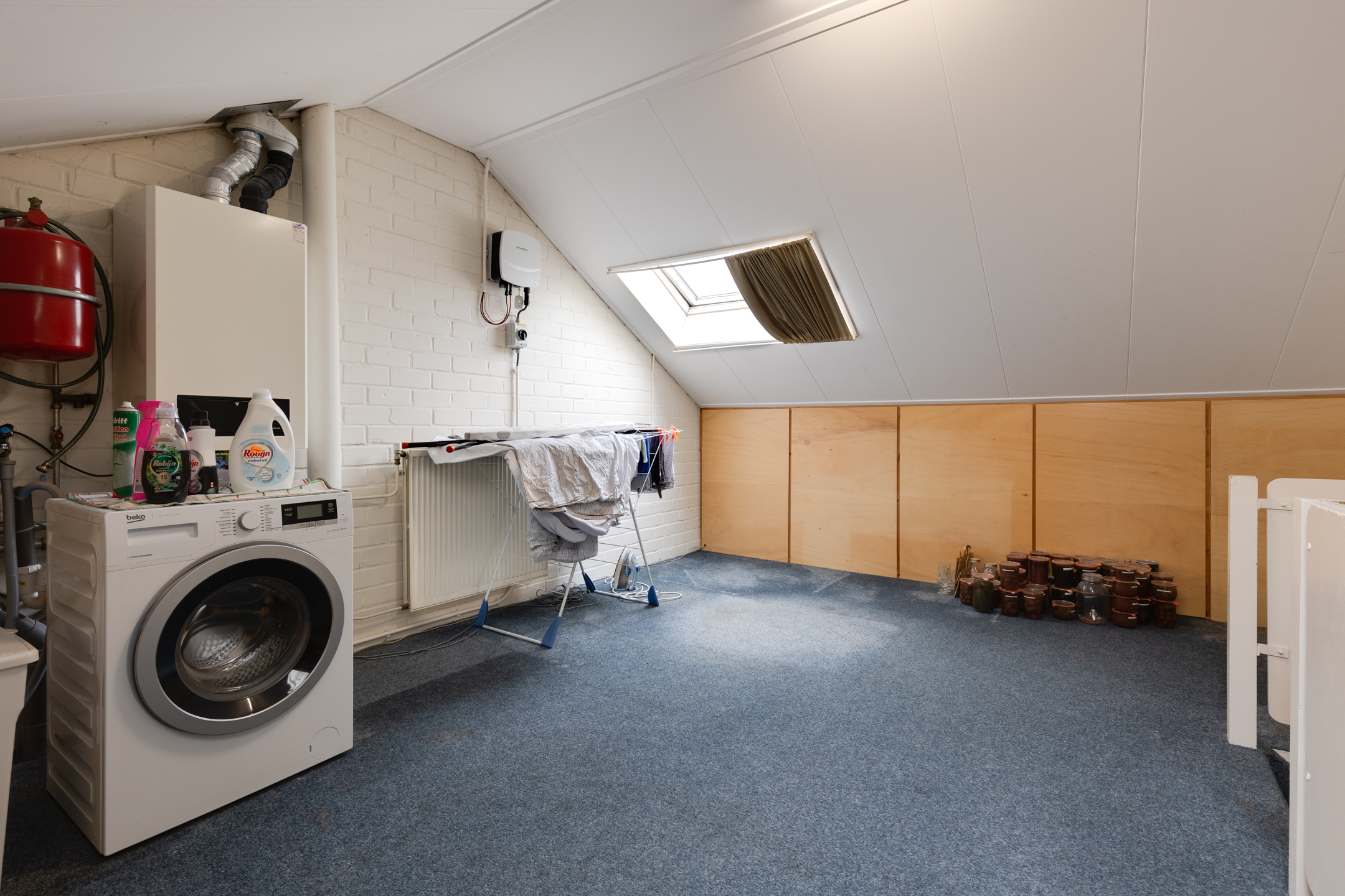 Met een vaste trap kom je op de bovenste verdieping. Hier is een ruime bergzolder met wasmachine aansluiting en hier hangt tevens de c.v. ketel. Hier is zeker een mogelijkheid voor het realiseren van een (slaap-)kamer.