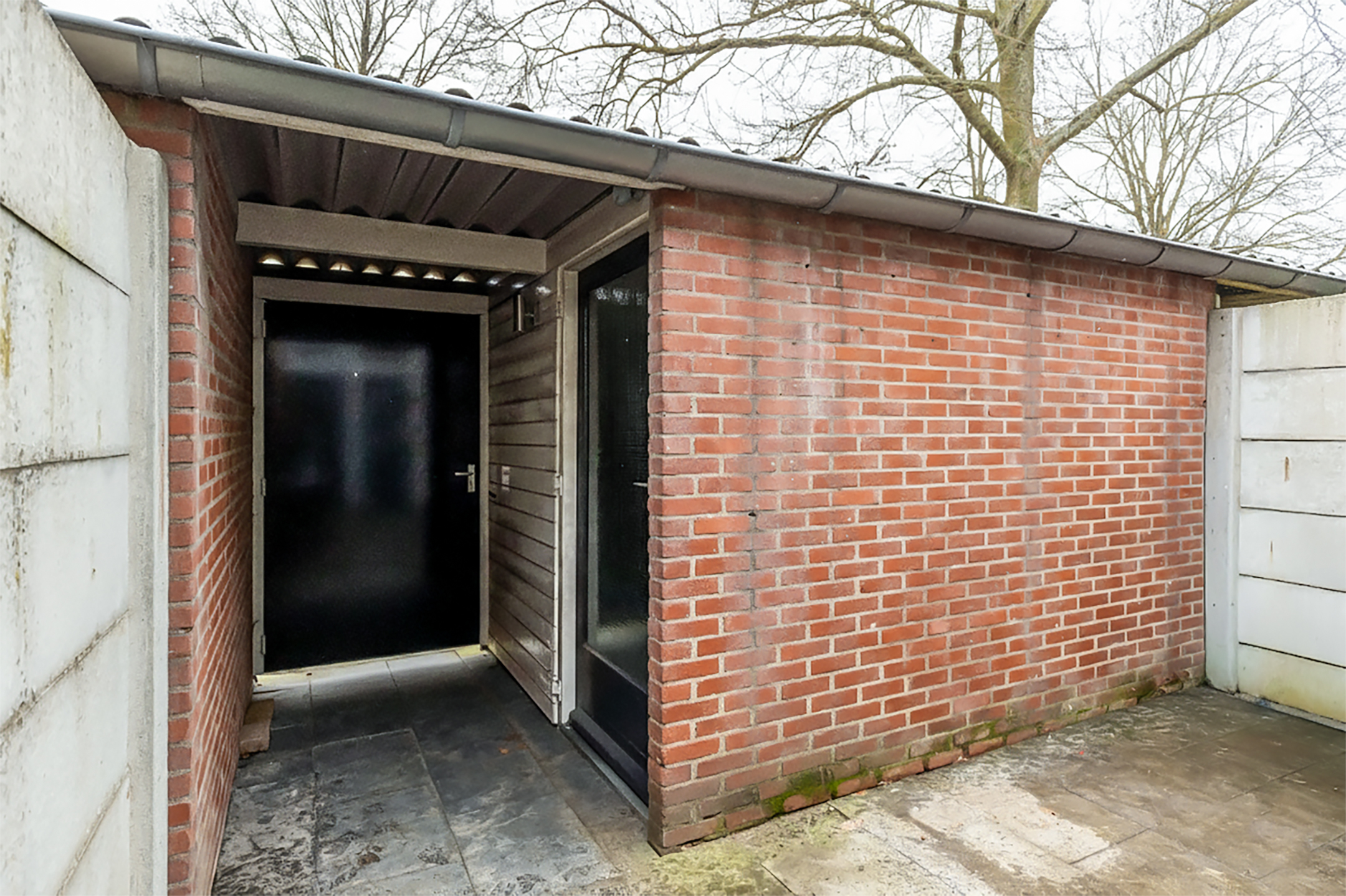Aan de voorzijde van de woning bevindt zich een poort naar de voortuin. Hier is een vrijstaande stenen berging aanwezig. De achtertuin is gelegen op het zuiden.
