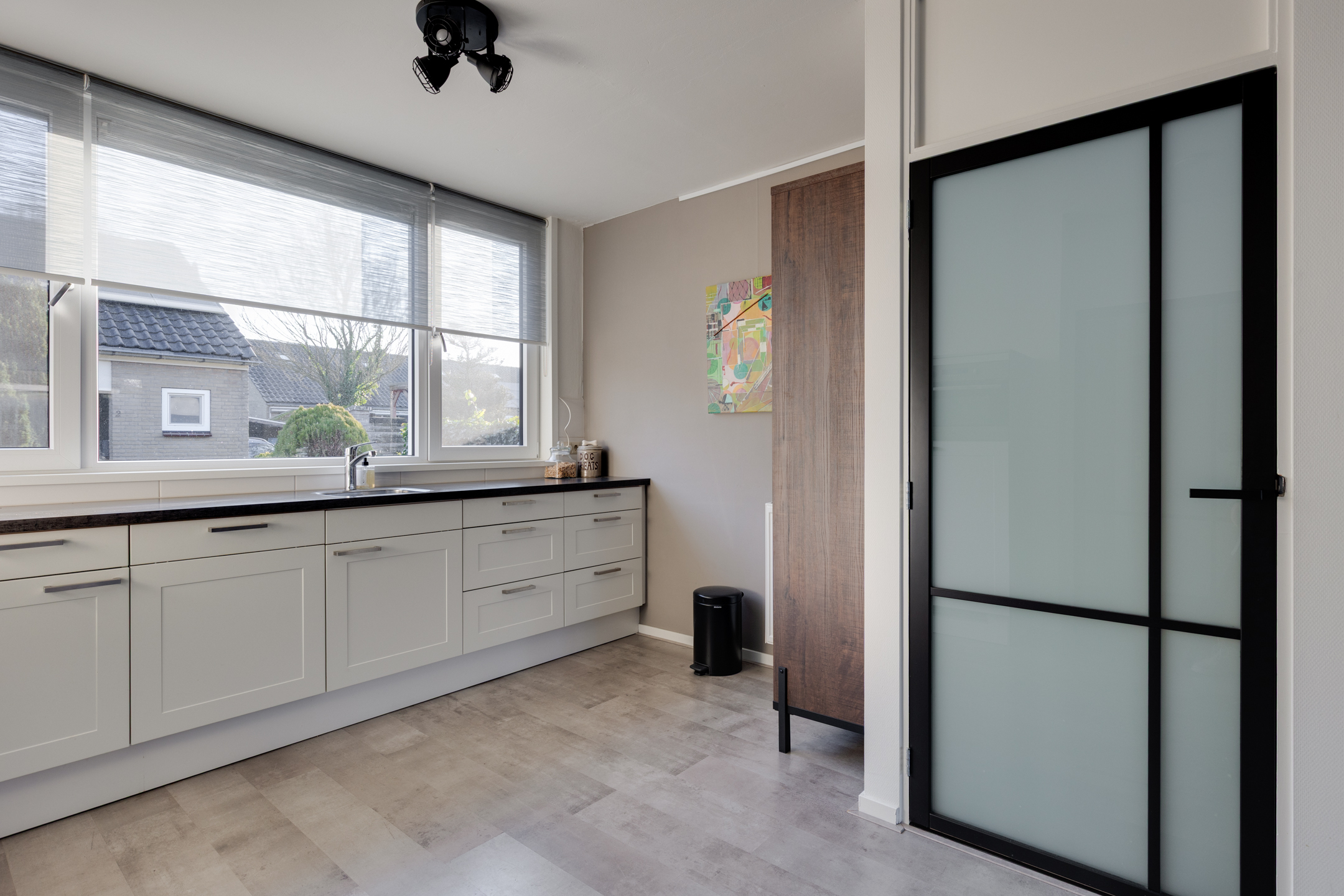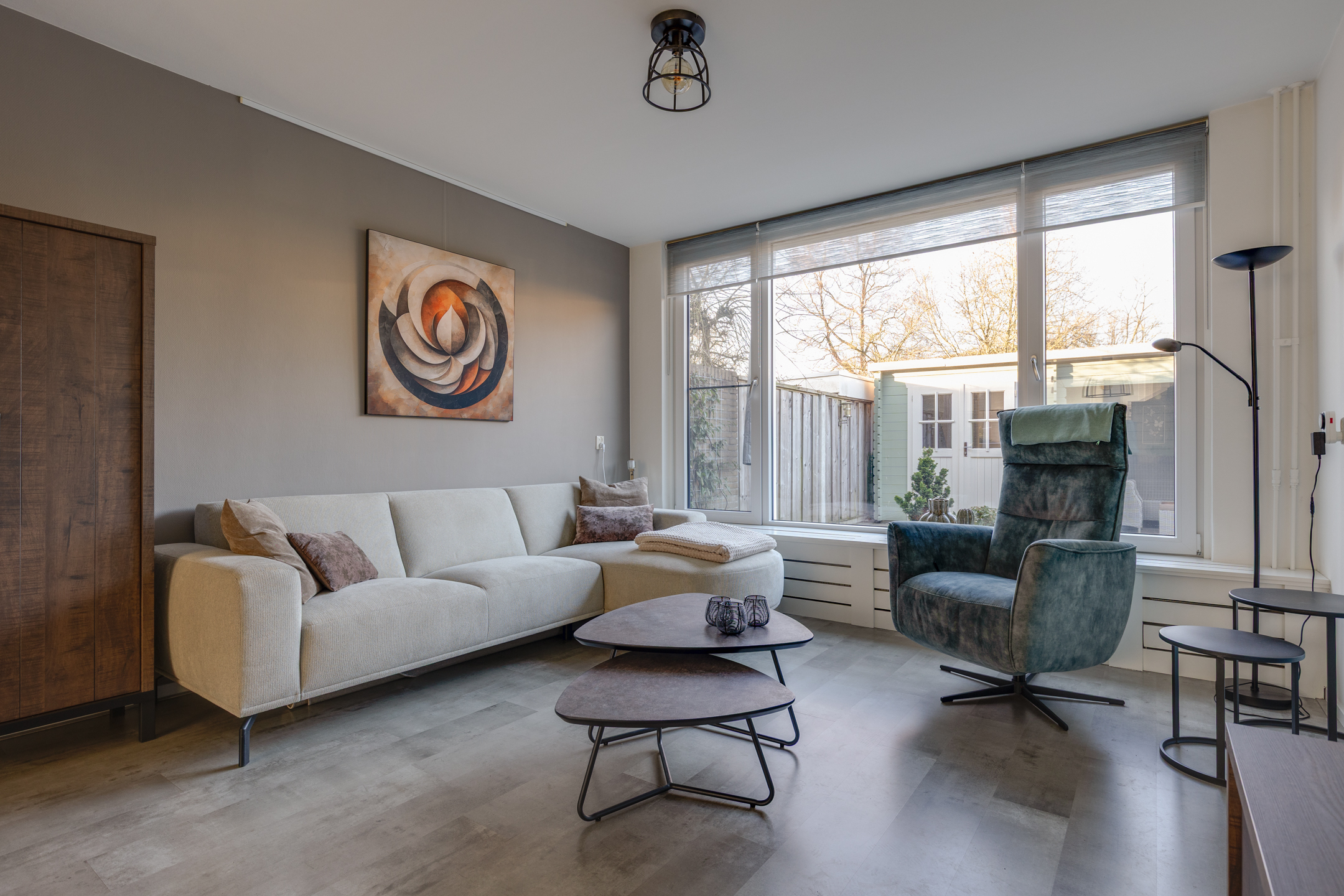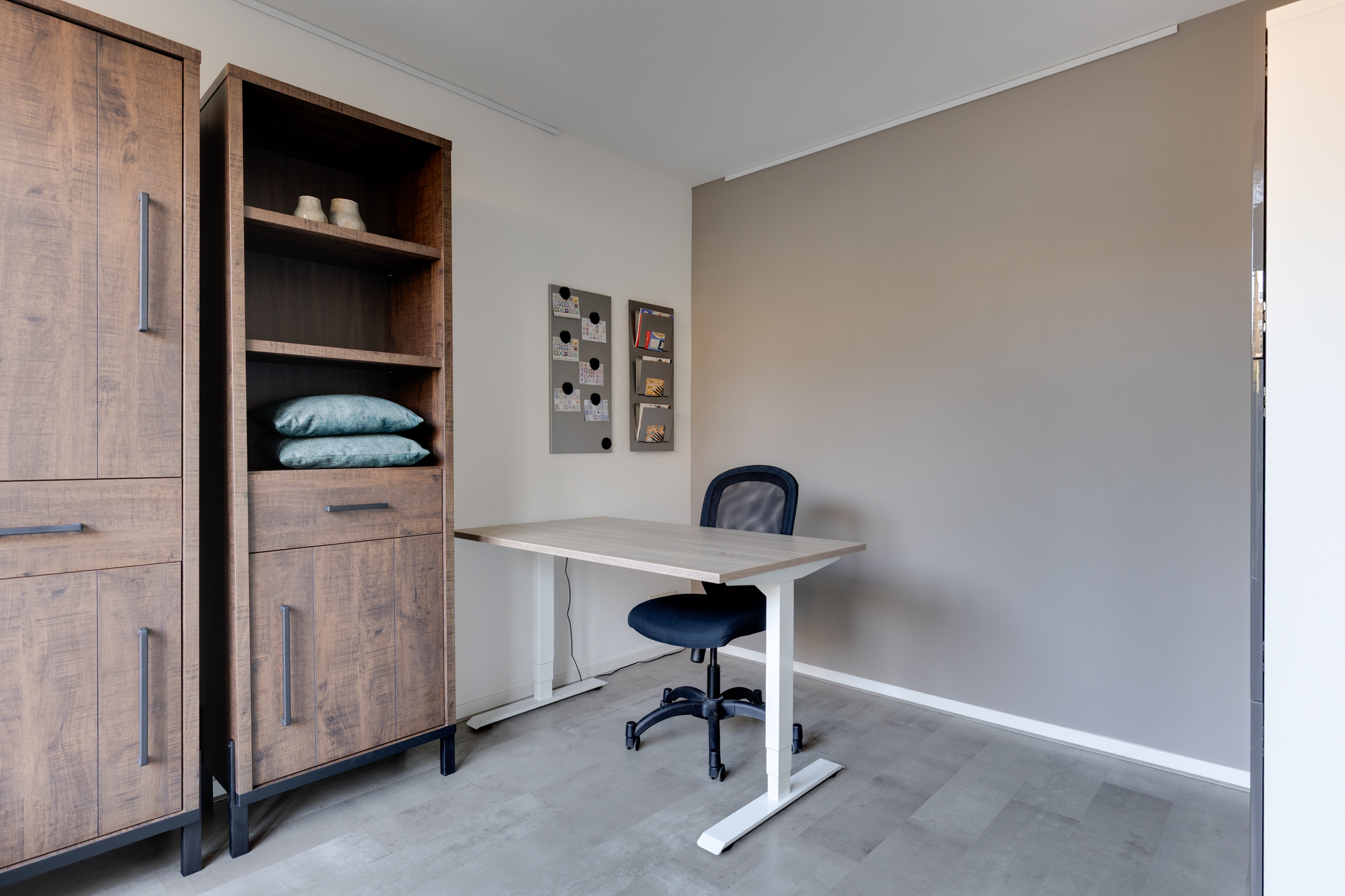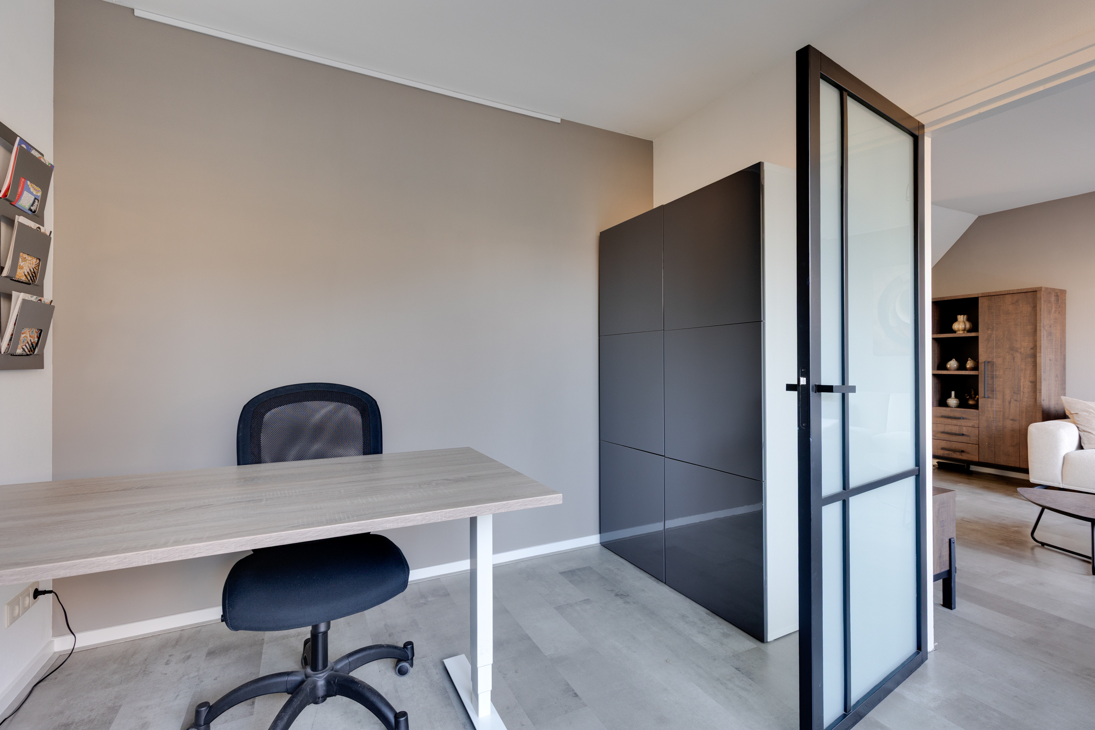 De open keuken is aan de voorzijde gelegen en het keukenblok is van een lichte kleurstelling met inbouwapparatuur. Vervolgens kom je in de tuingerichte en zeer lichte woonkamer. Als laatste een kantoor / slaapkamer met deur naar de tuin.