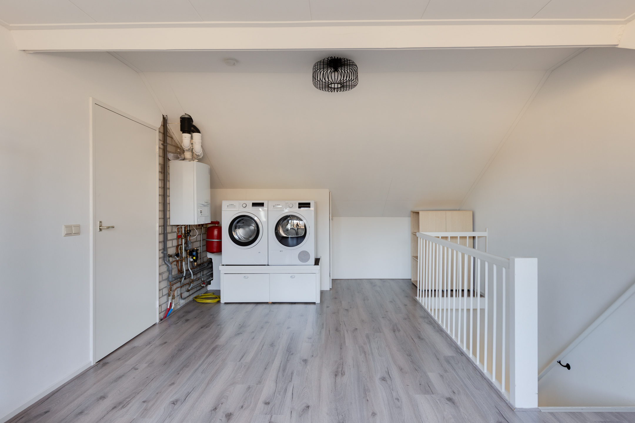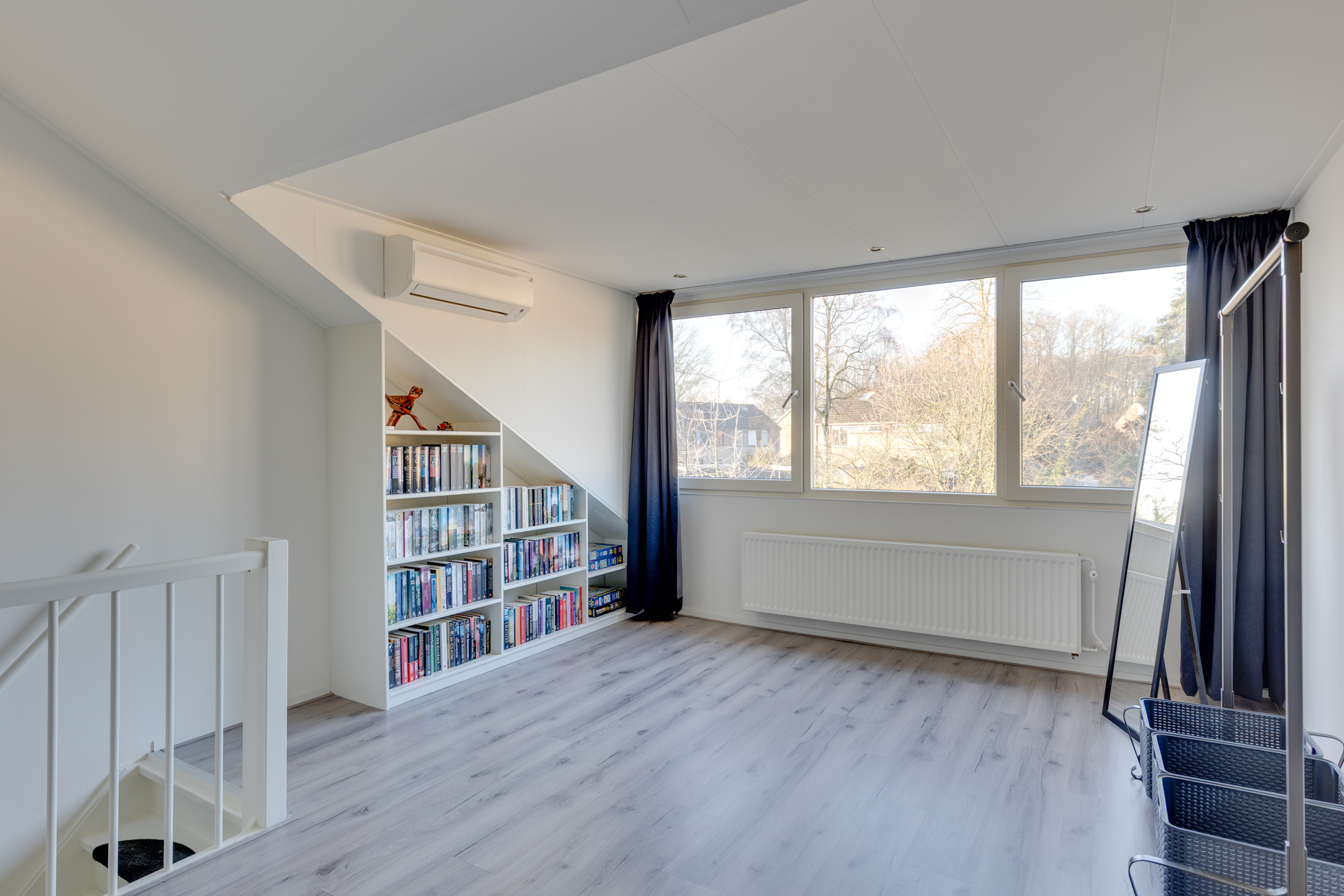Je komt boven op een zeer ruime overloop doordat er aan de achterzijde van de woning een dakkapel over bijna de volledige breedte van de woning is geplaatst. De overloop is voorzien van een airco (2015) en daar hangt de Vaillant combi-ketel uit 2025.