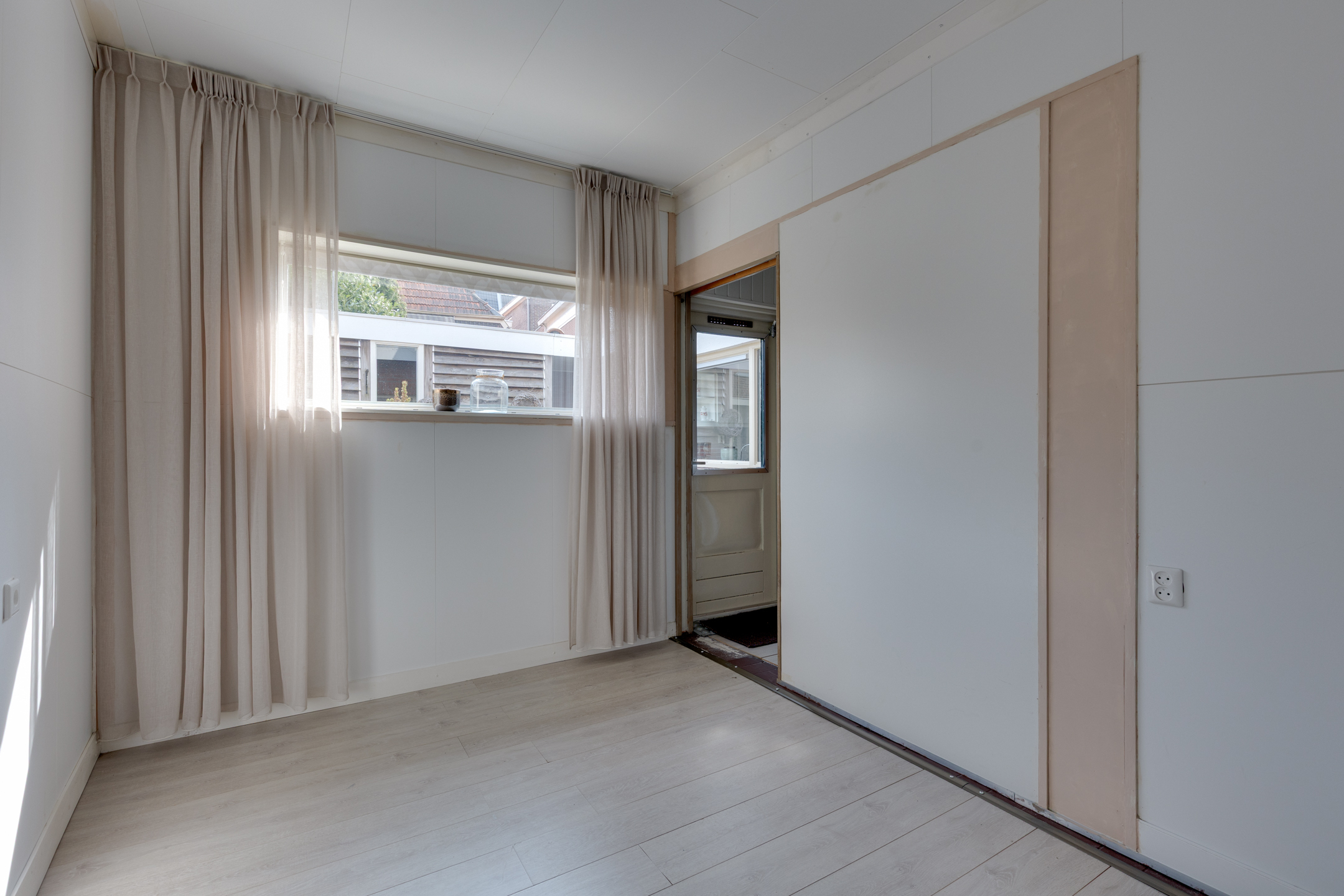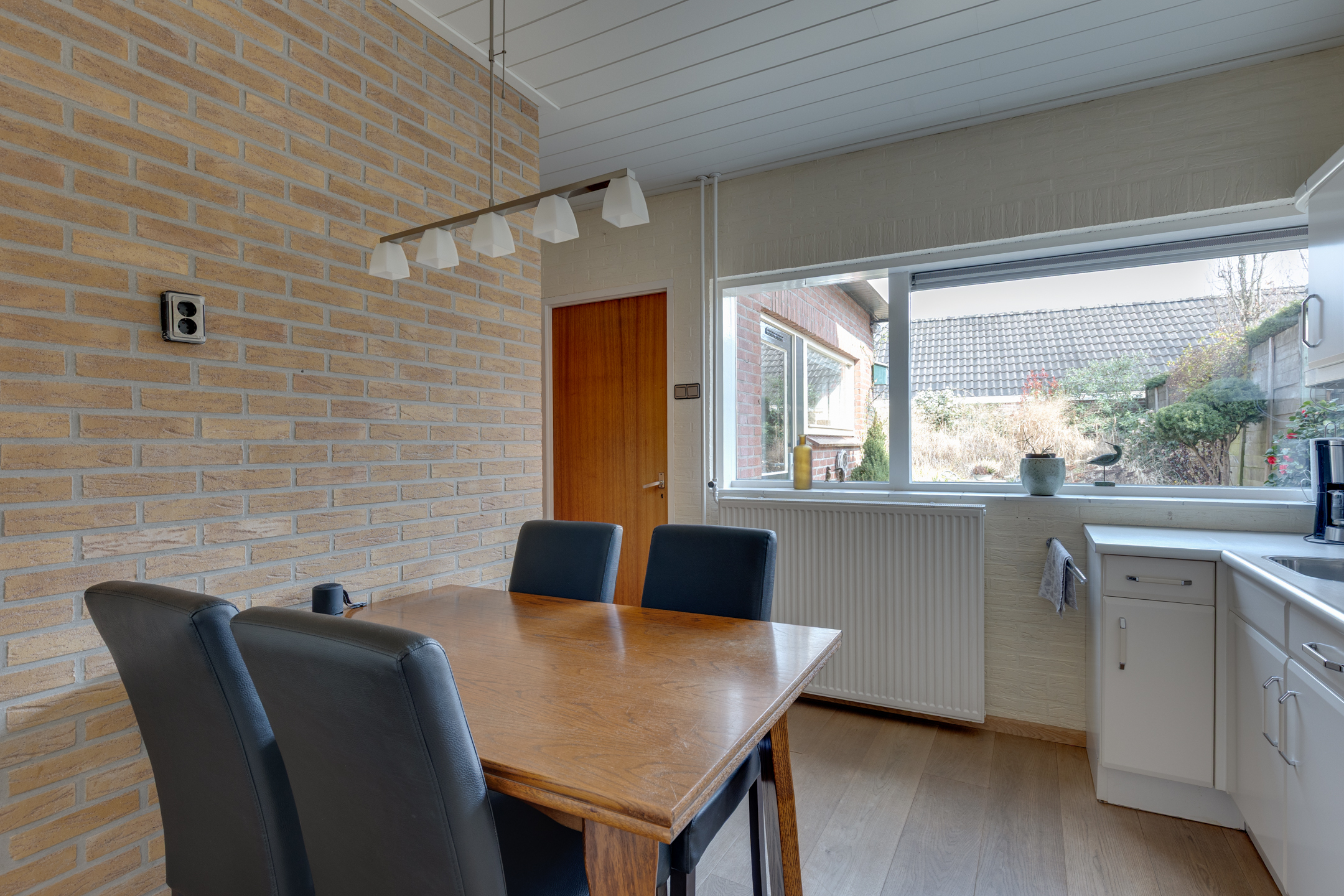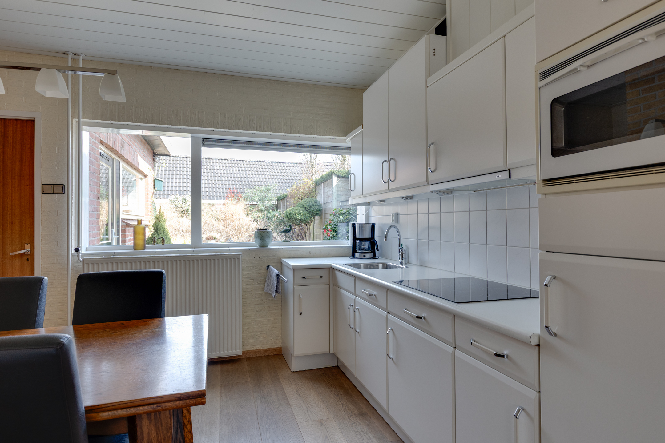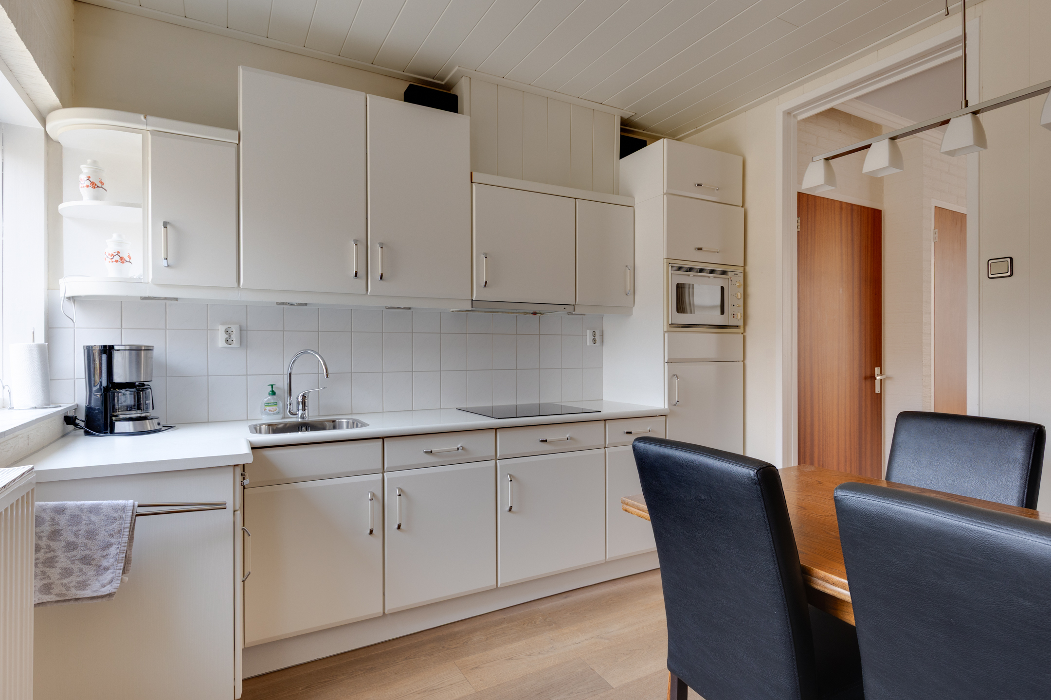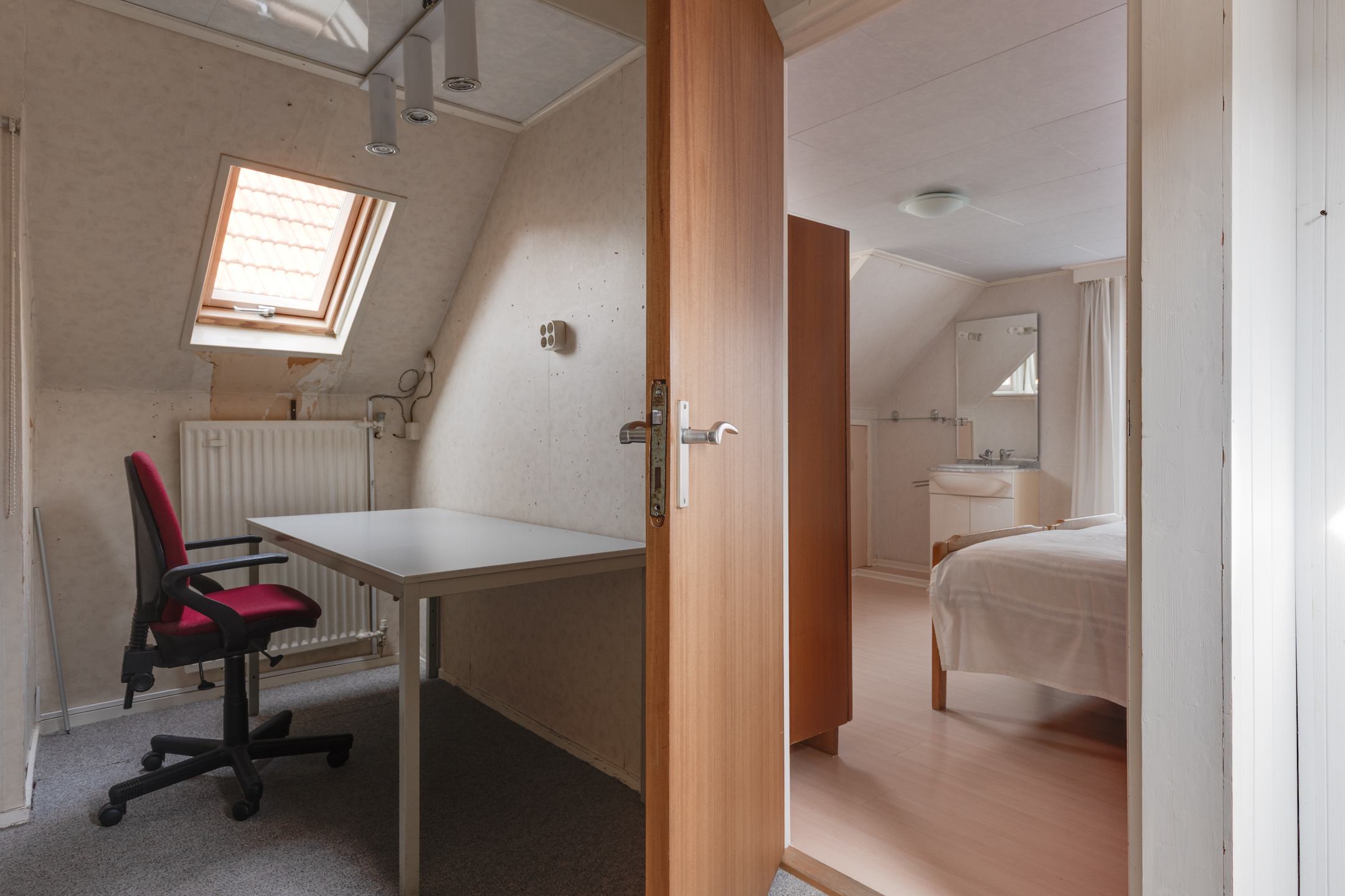 Vanuit de keuken bereiken we de bijkeuken waar zich de c.v.-installatie (Rehema ‘23), wasmachine- en drogeraansluiting bevinden. De bijkeuken biedt tevens toegang tot een kantoor of slaapkamer op de begane grond.