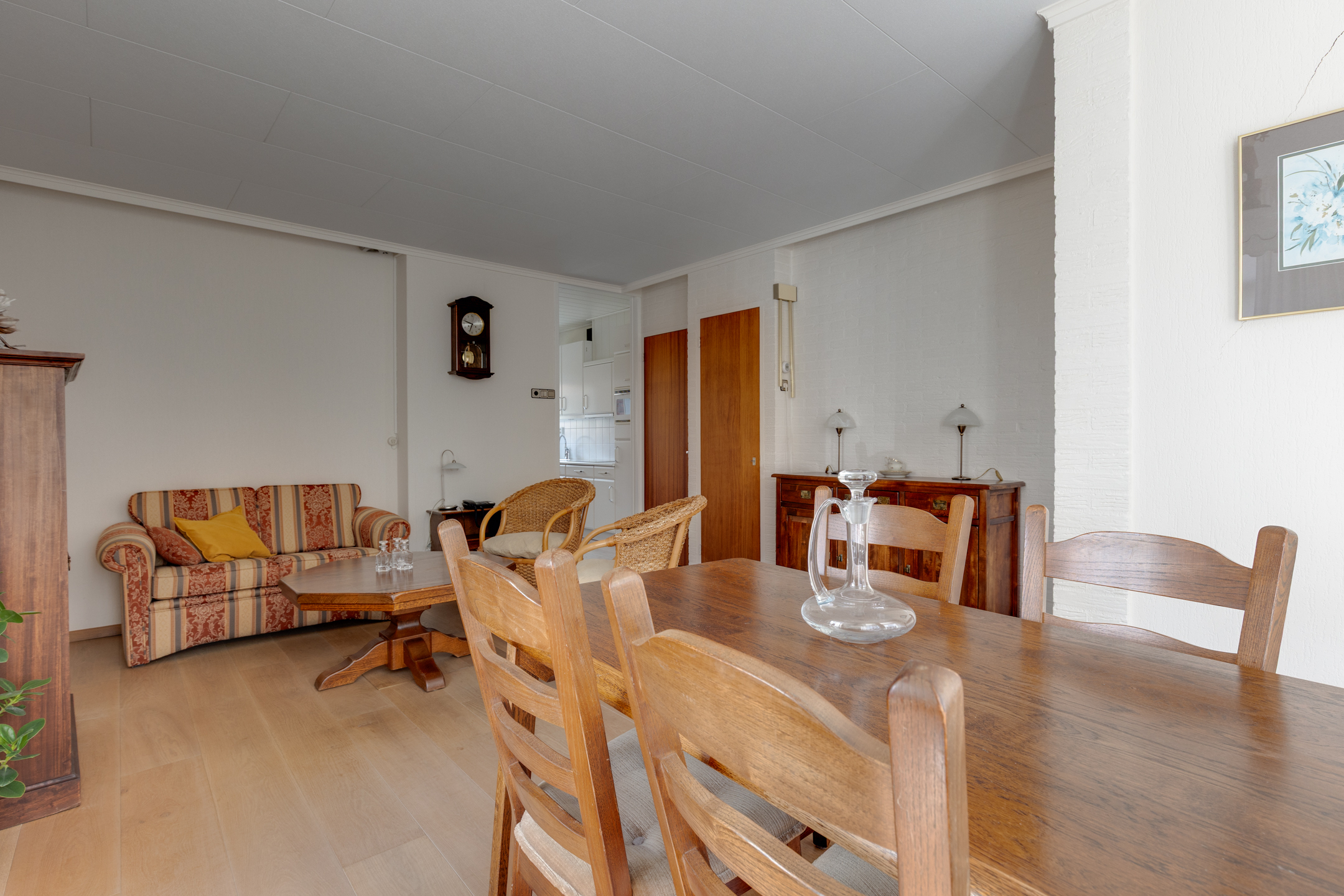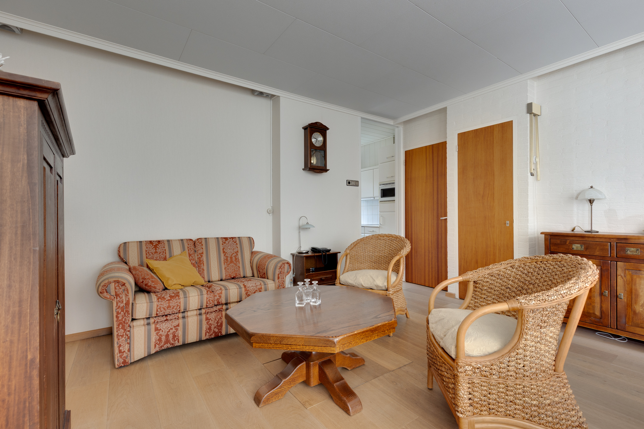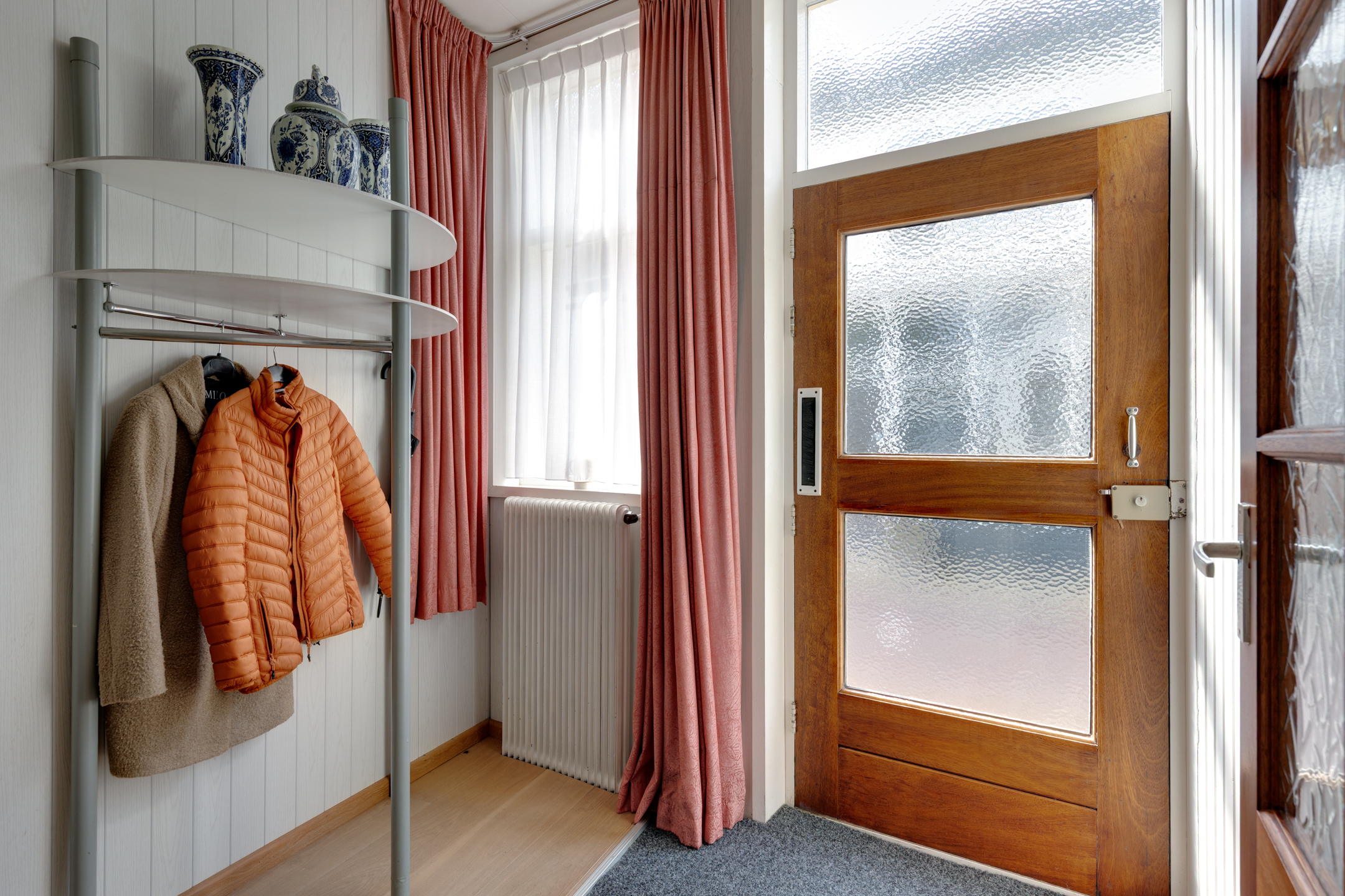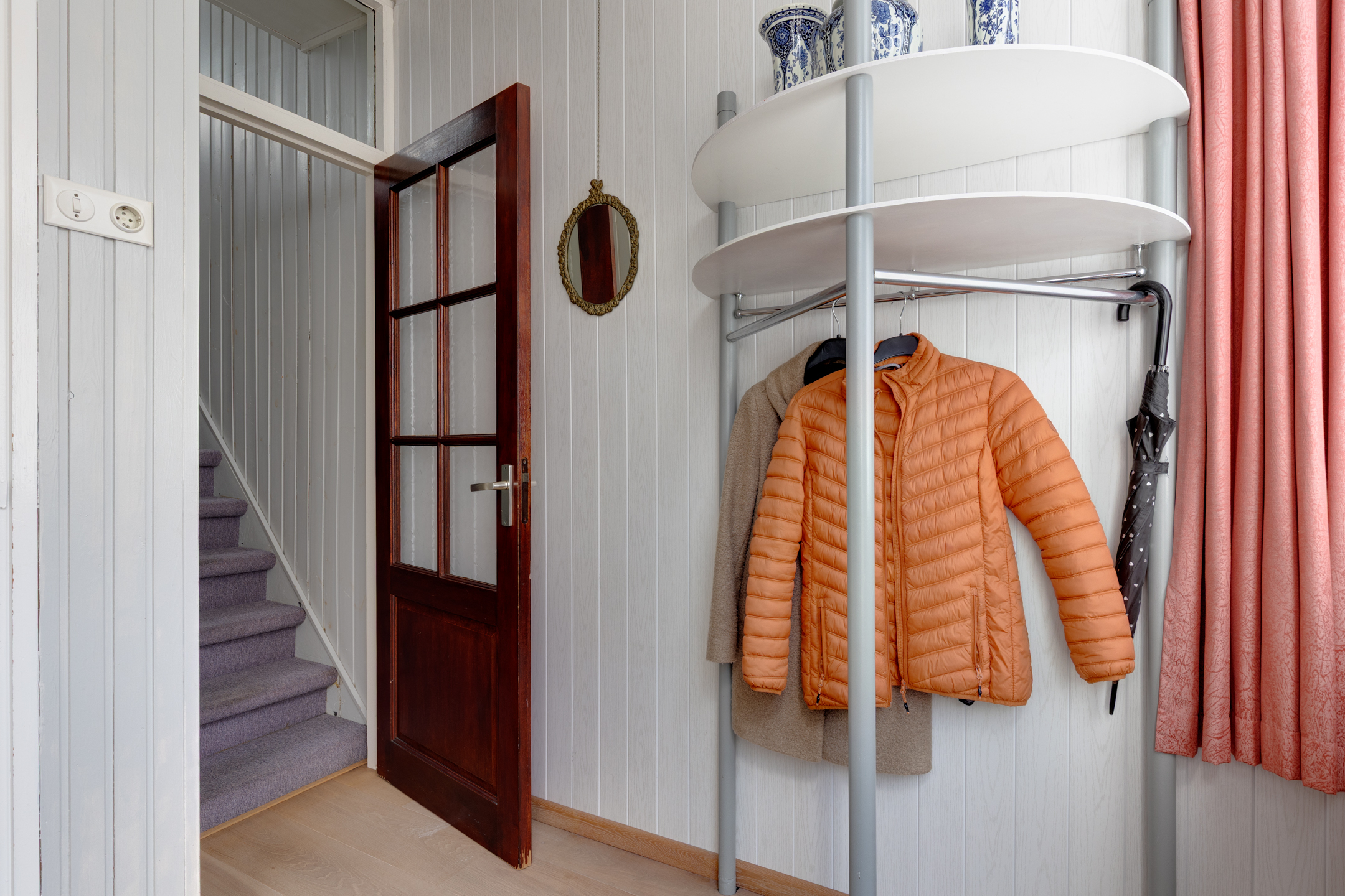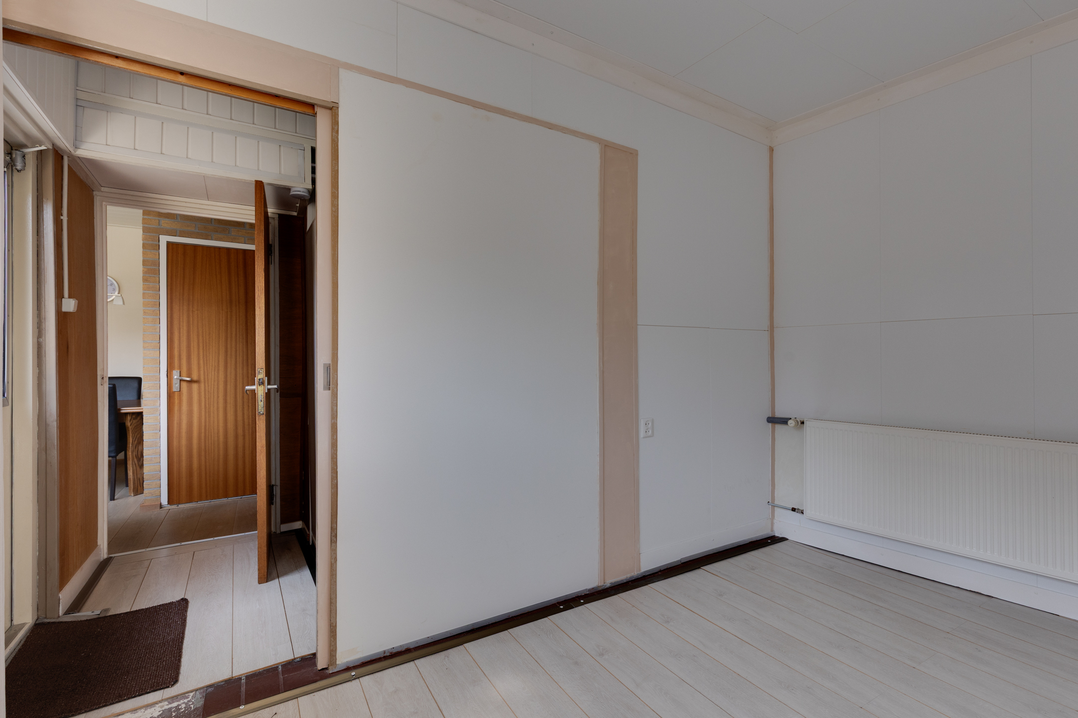Vanuit de keuken bereiken we de bijkeuken waar zich de c.v.-installatie (Rehema ‘23), wasmachine- en drogeraansluiting bevinden. De bijkeuken biedt tevens toegang tot een kantoor of slaapkamer op de begane grond.