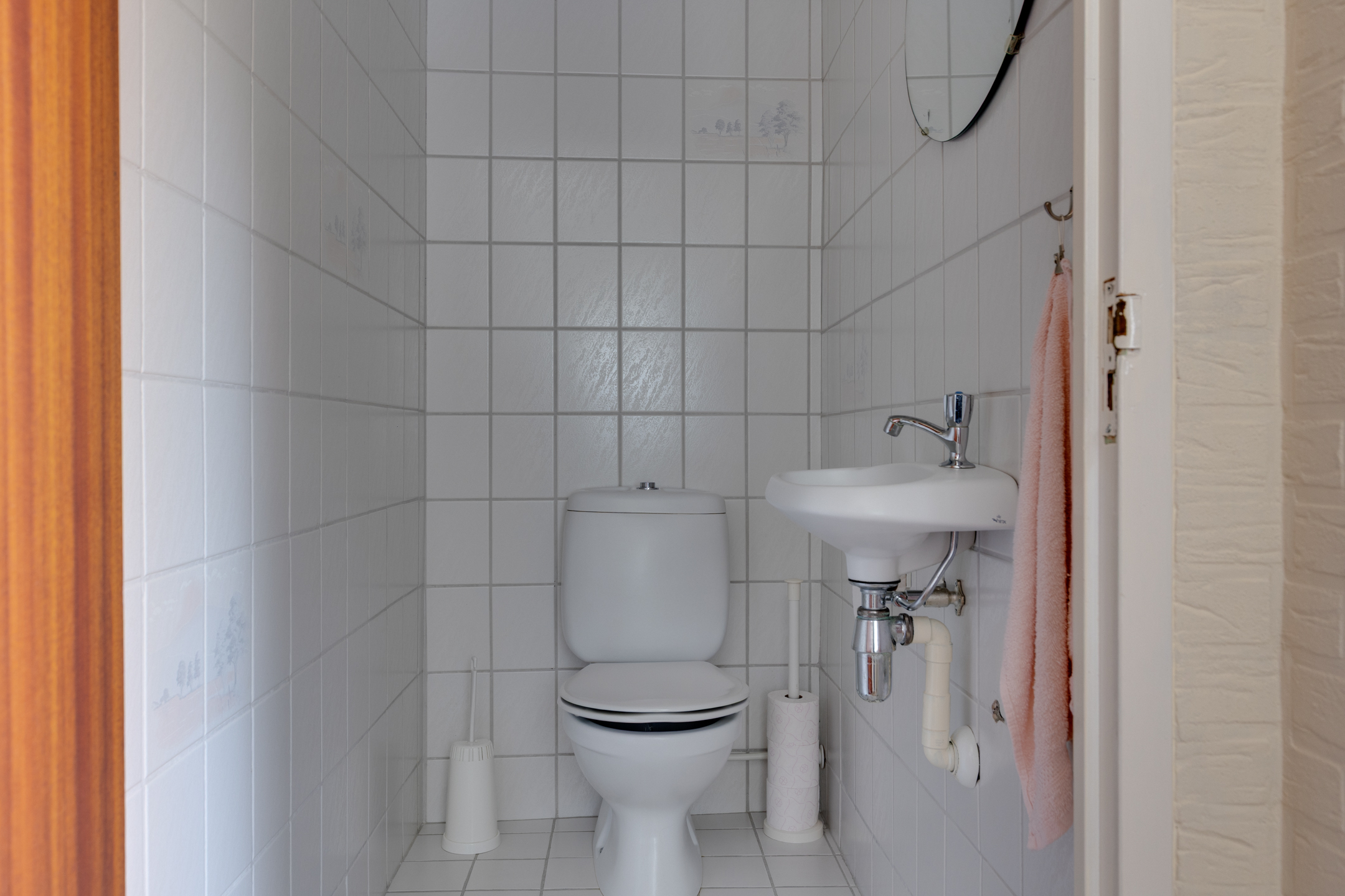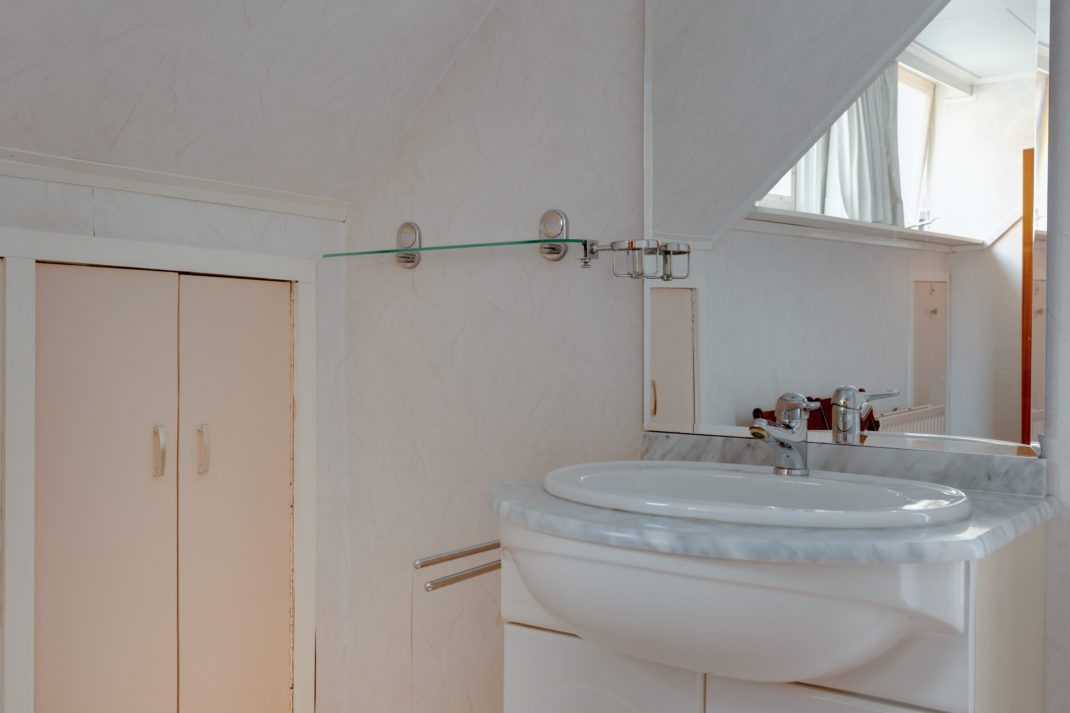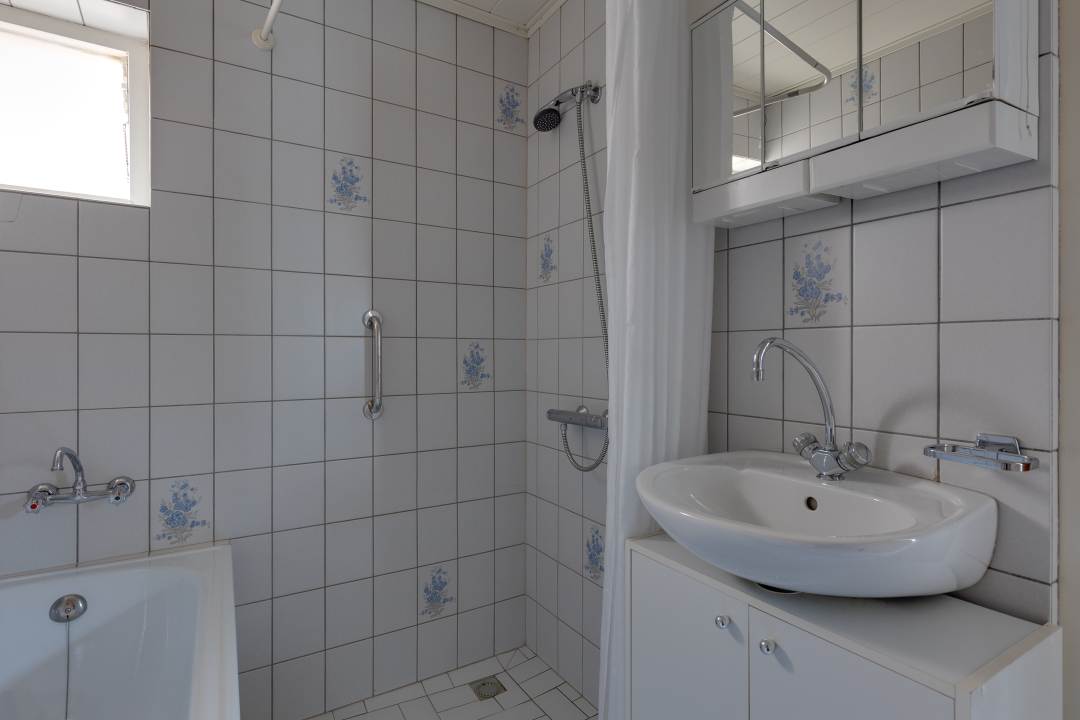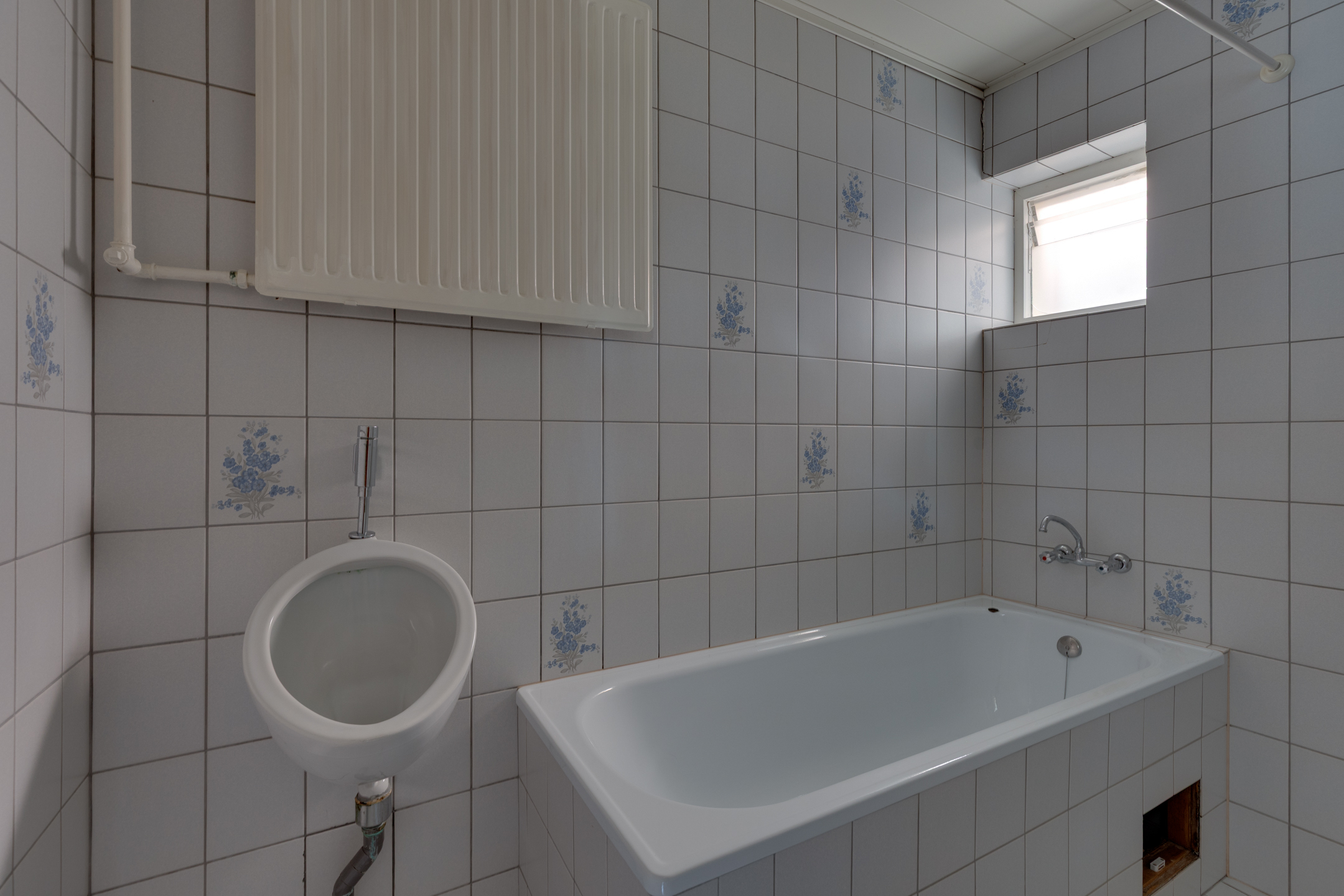 Op de begane grond is tevens de badkamer gesitueerd. Deze is uitgerust met een wastafel, ligbad, douche en urinoir. Daarnaast is er een separaat toilet met fonteintje aanwezig.