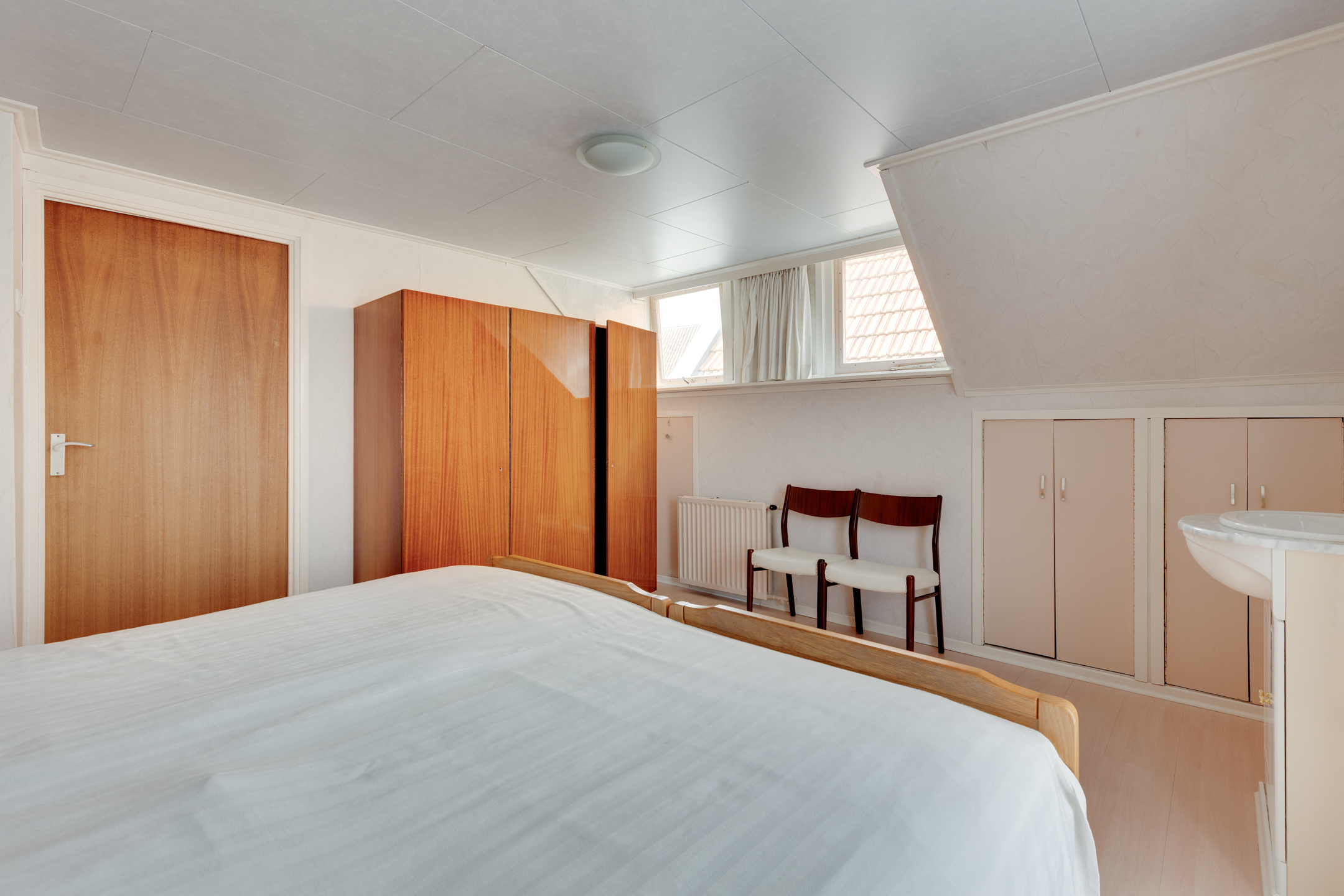 Via de trap bereiken we de eerste verdieping met een ruime overloop. Deze geeft toegang tot twee royale slaapkamers waarvan één is voorzien van knieschotbergingen en toegang tot platte dak.