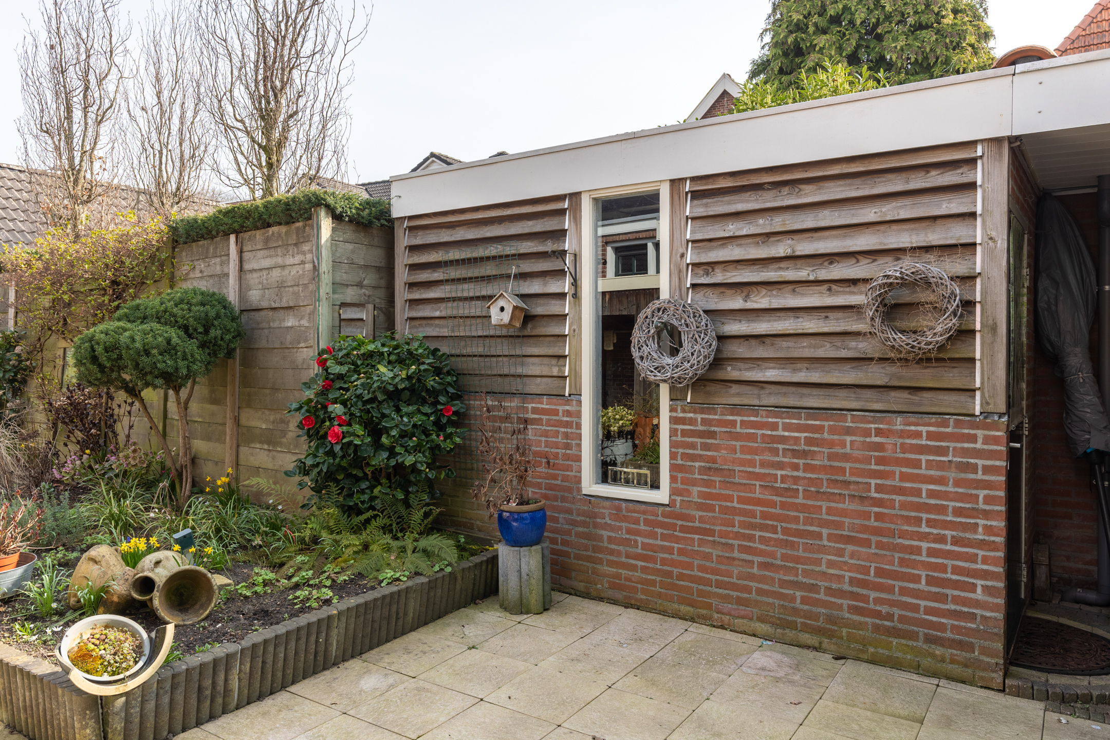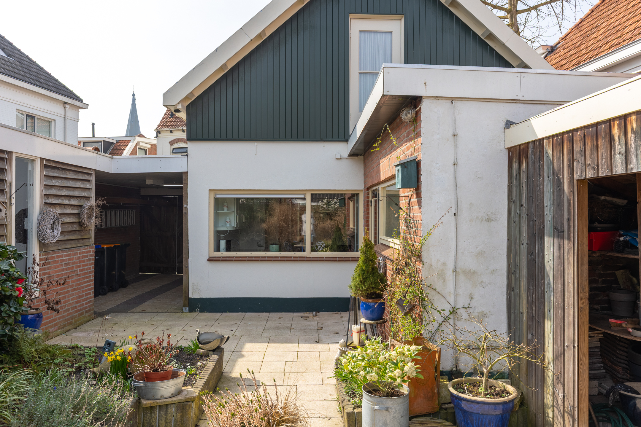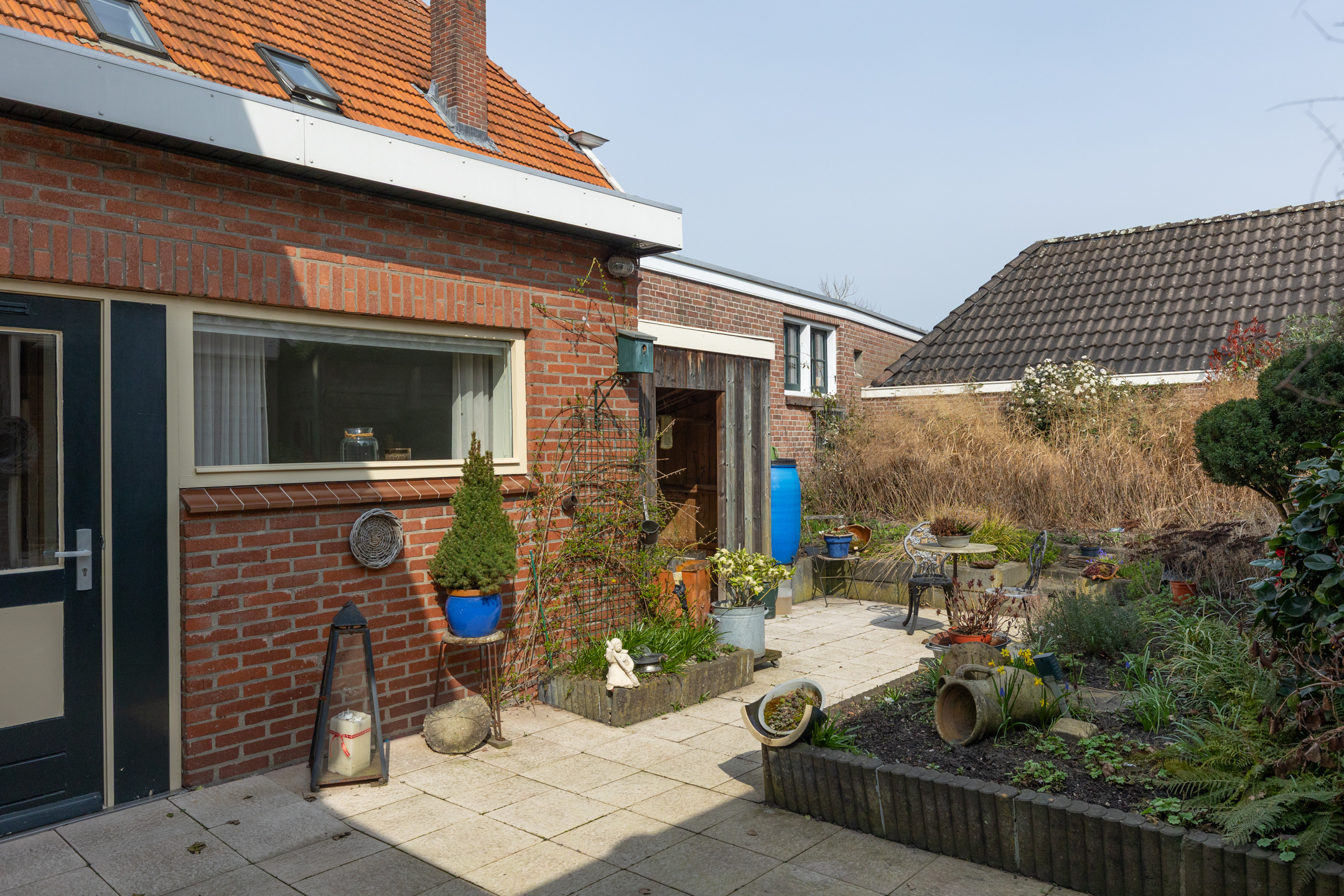 Naast de woning bevindt zich een eigen parkeerplaats met achter de poort een carport. De achtertuin beschikt over zowel een stenen schuurtje als een houten berging. Ideaal voor het opbergen van fietsen en/of tuingereedschap.