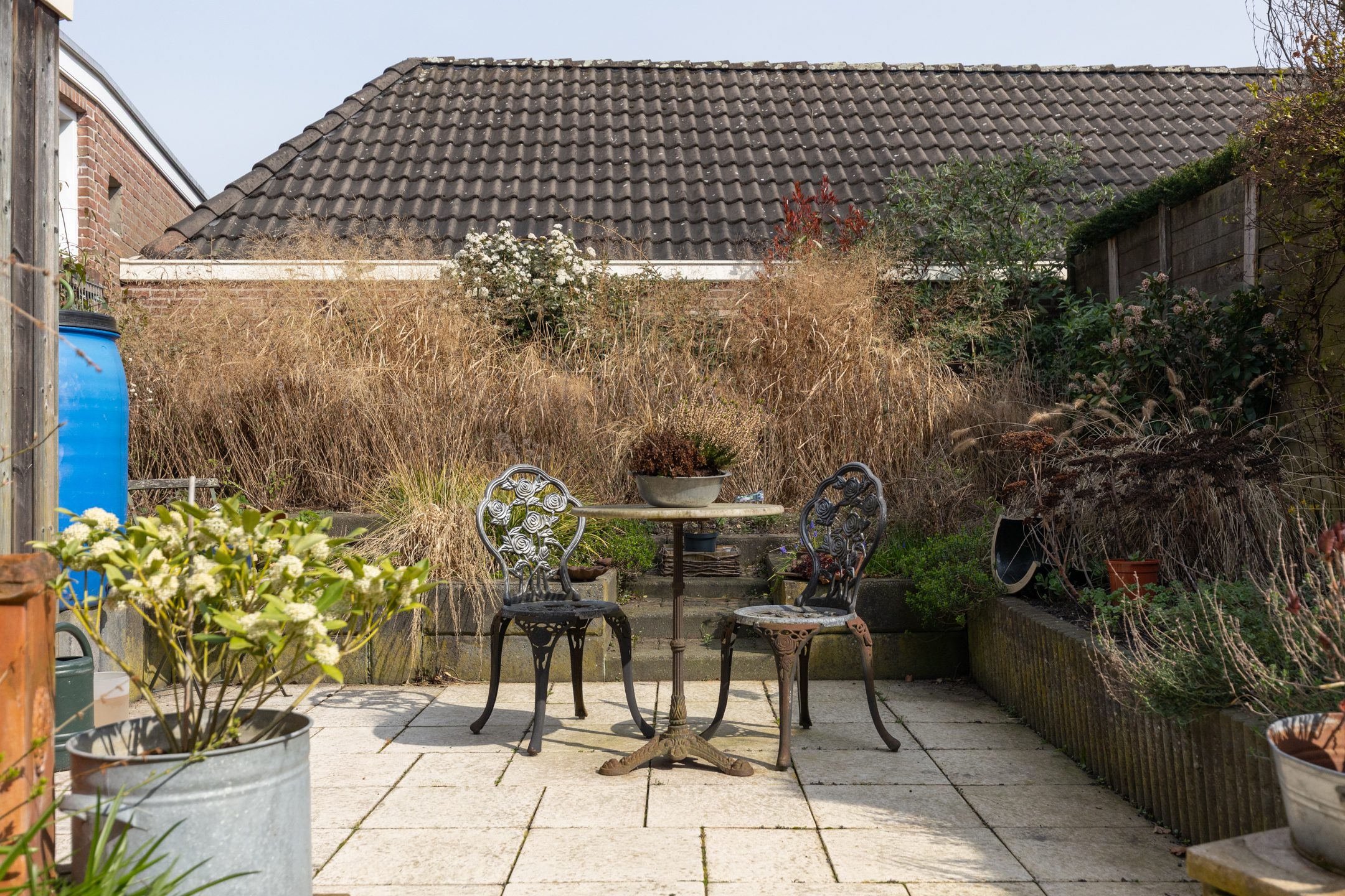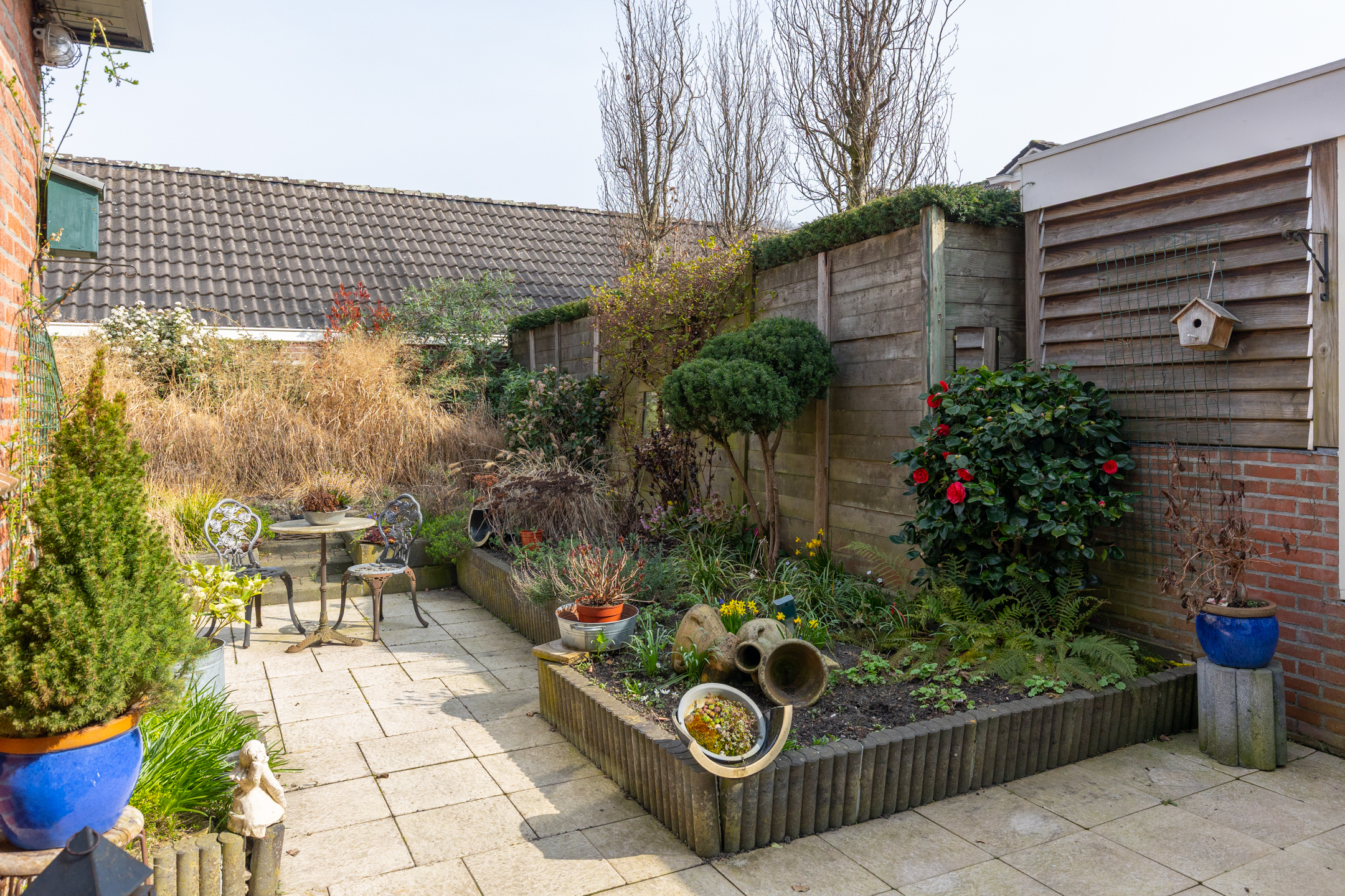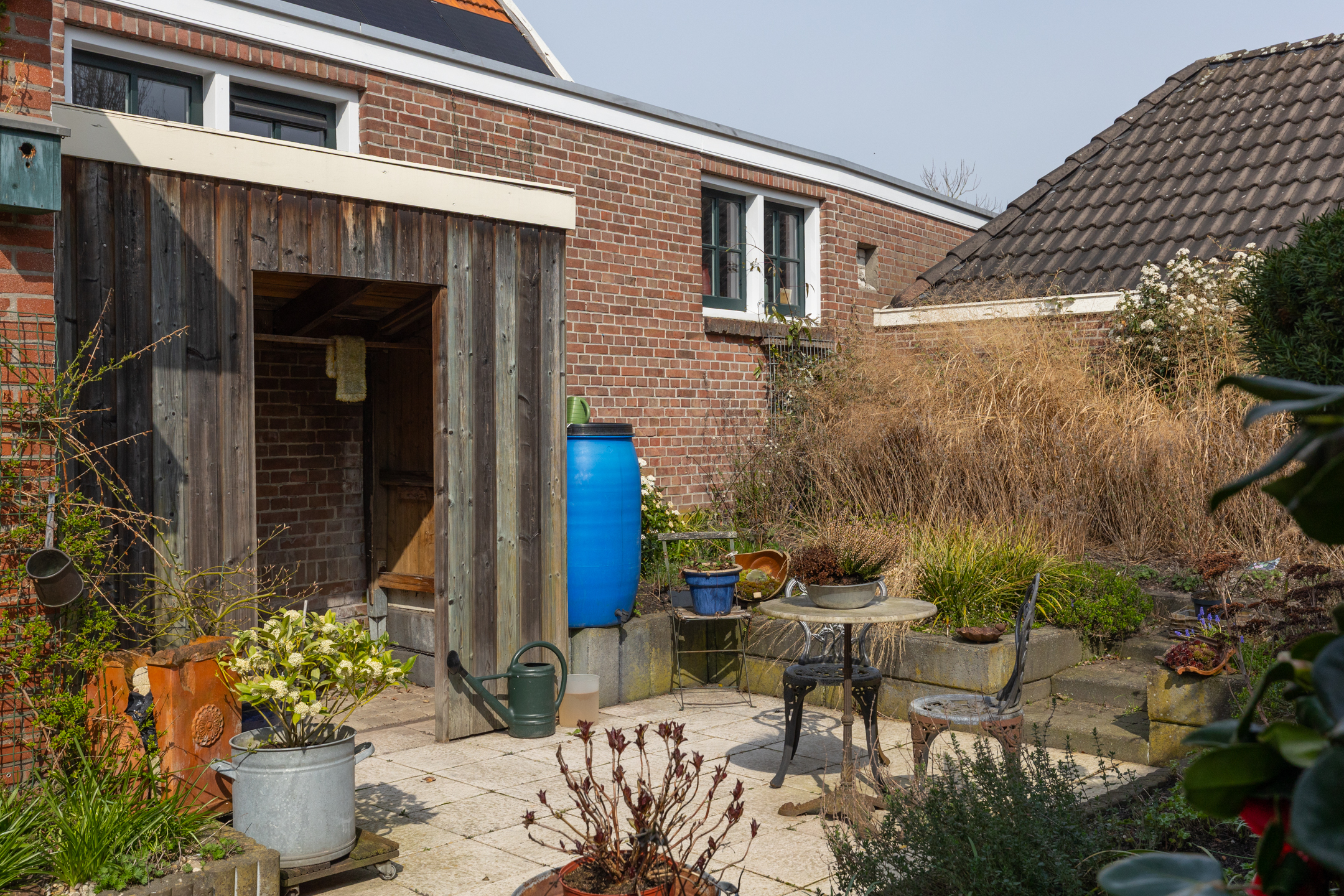 Naast de woning bevindt zich een eigen parkeerplaats met achter de poort een carport. De achtertuin beschikt over zowel een stenen schuurtje als een houten berging. Ideaal voor het opbergen van fietsen en/of tuingereedschap.