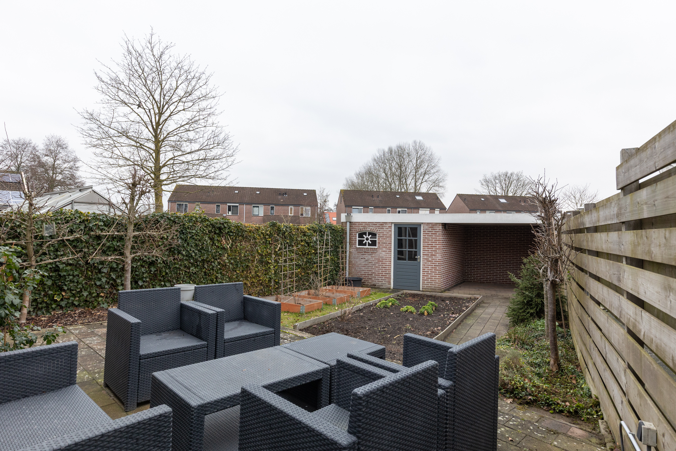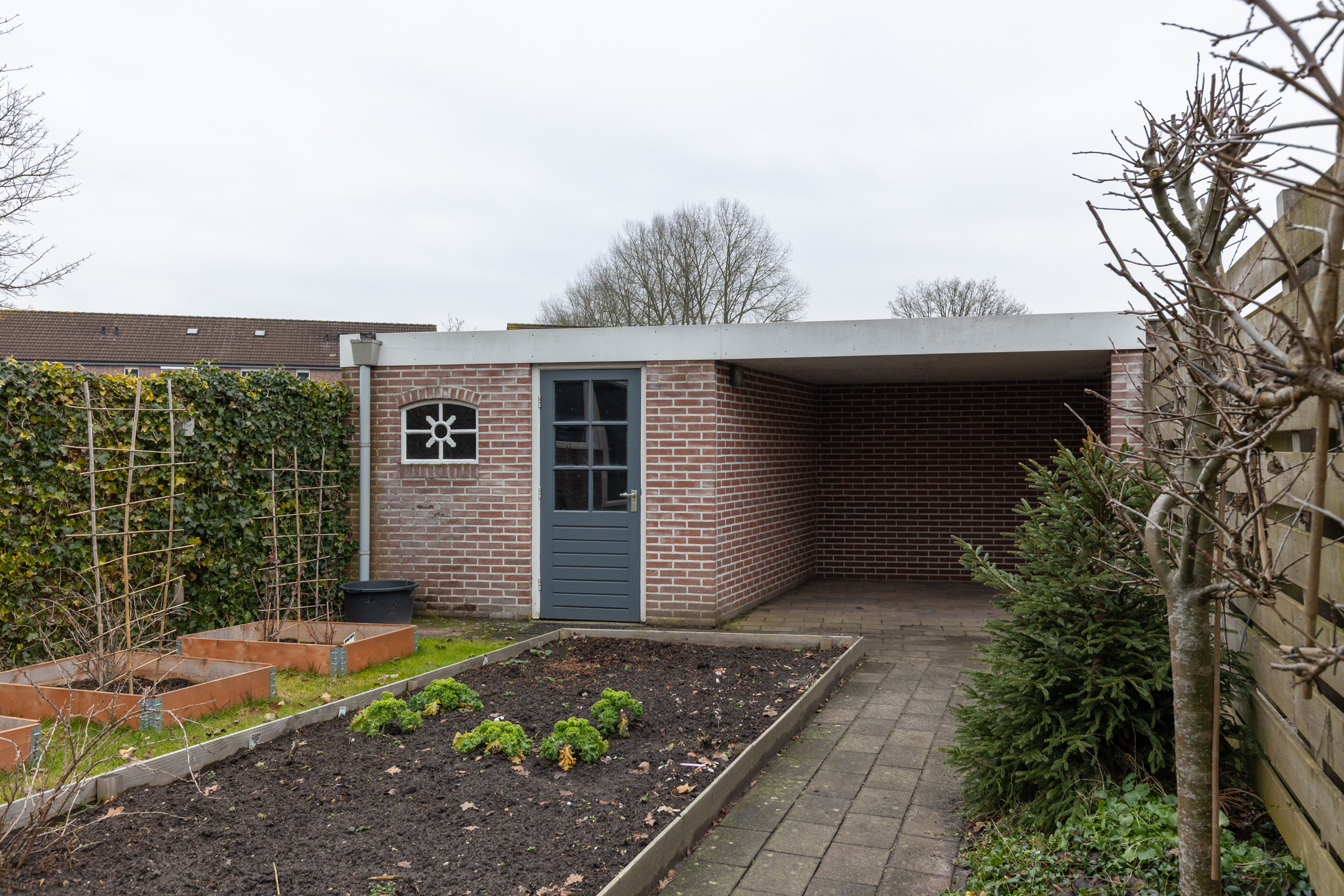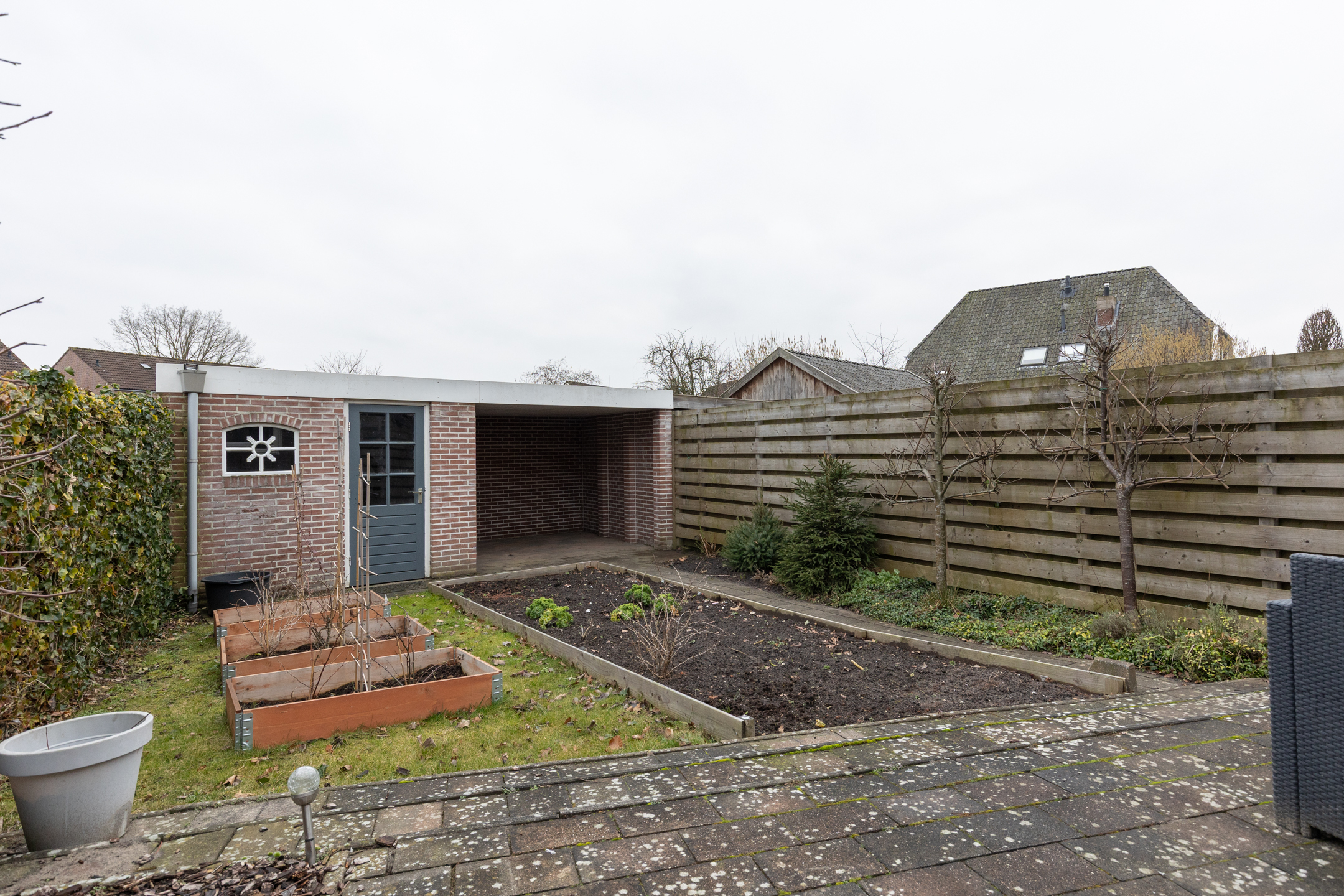 De tuin is o.a. voorzien van planten- en groentebedden, fijn voor de liefhebber van tuinieren. Daarnaast is er een stenen berging met overkapping – handige ruimte voor je tuinspullen of een gezellige zithoek.