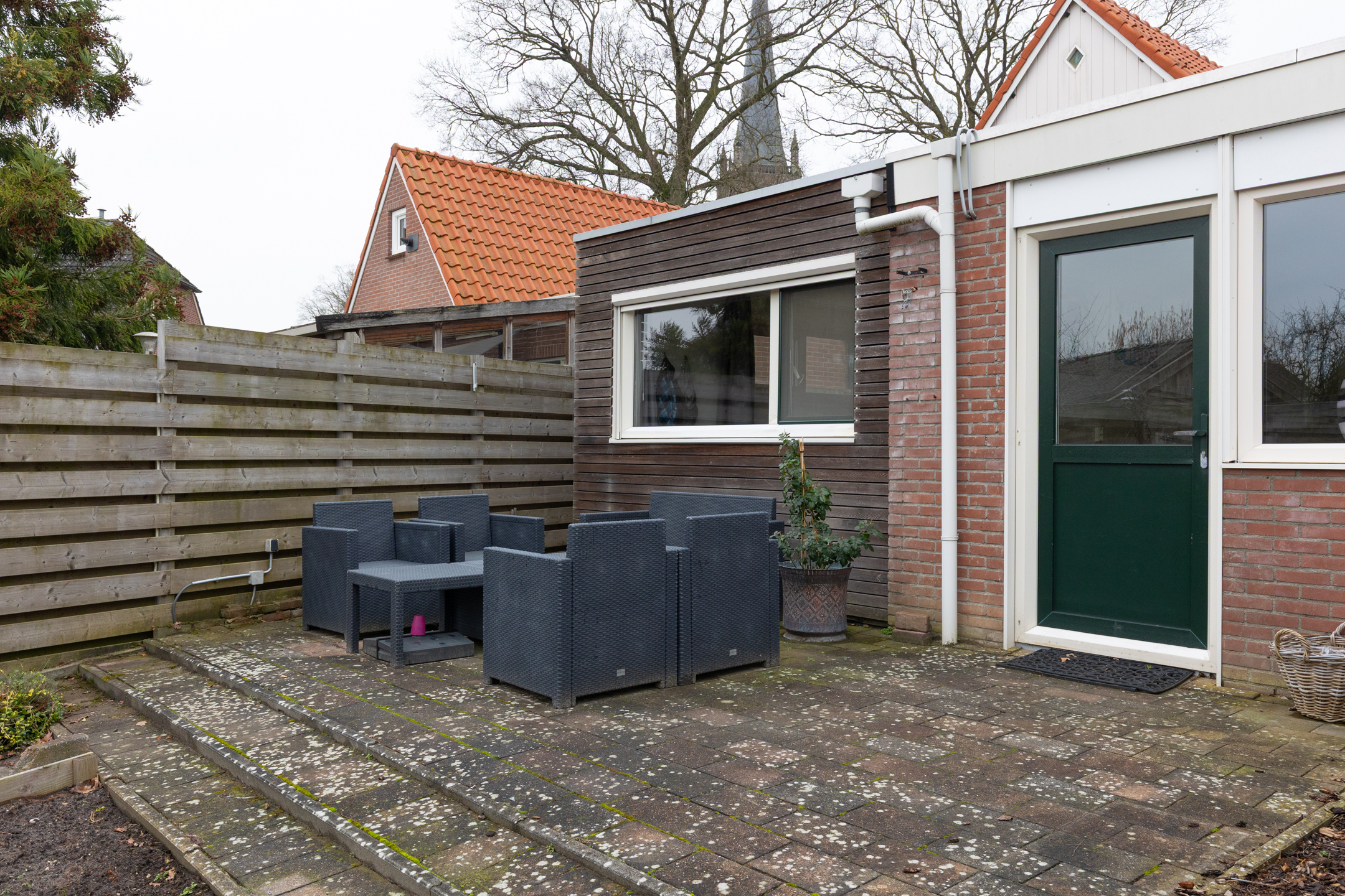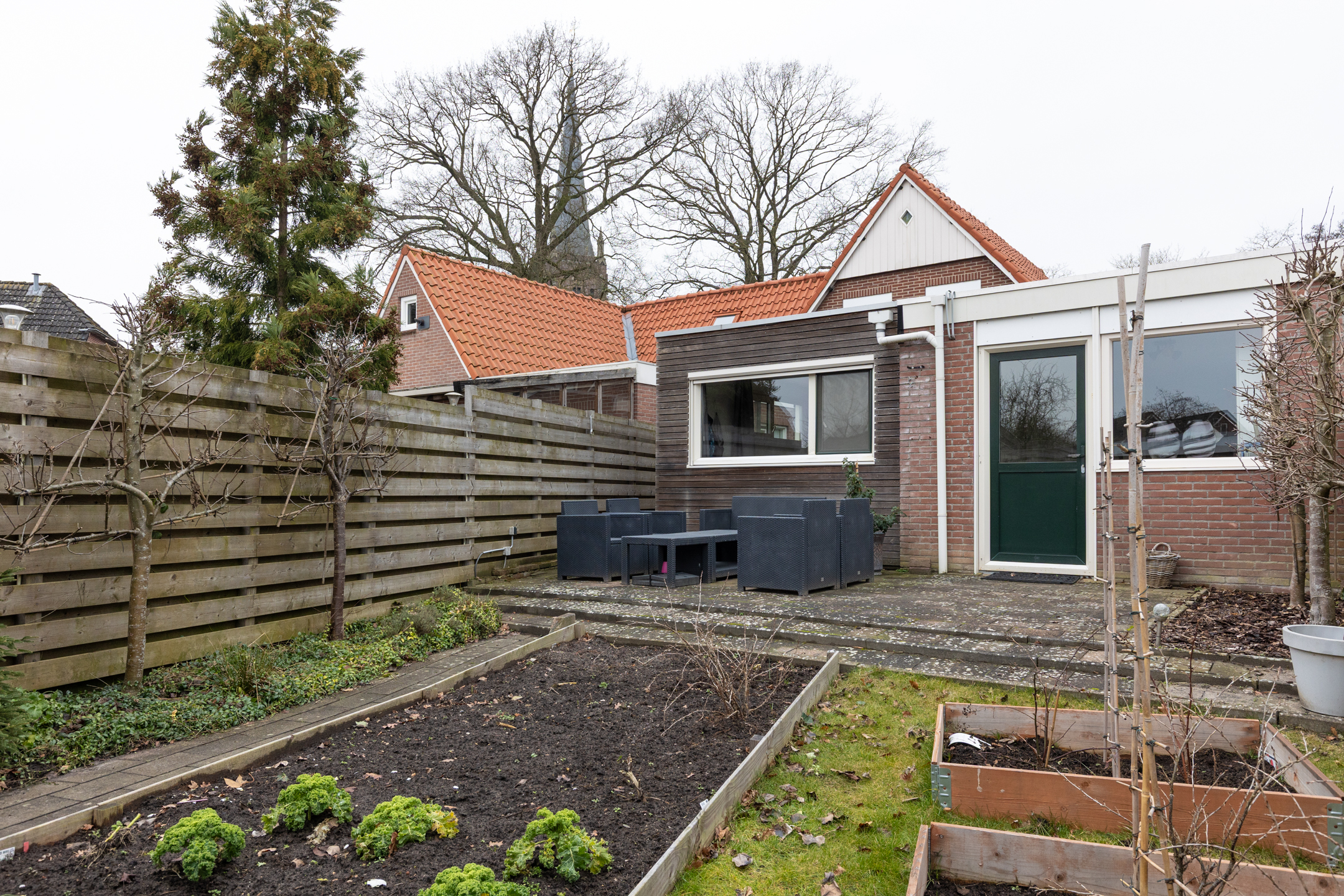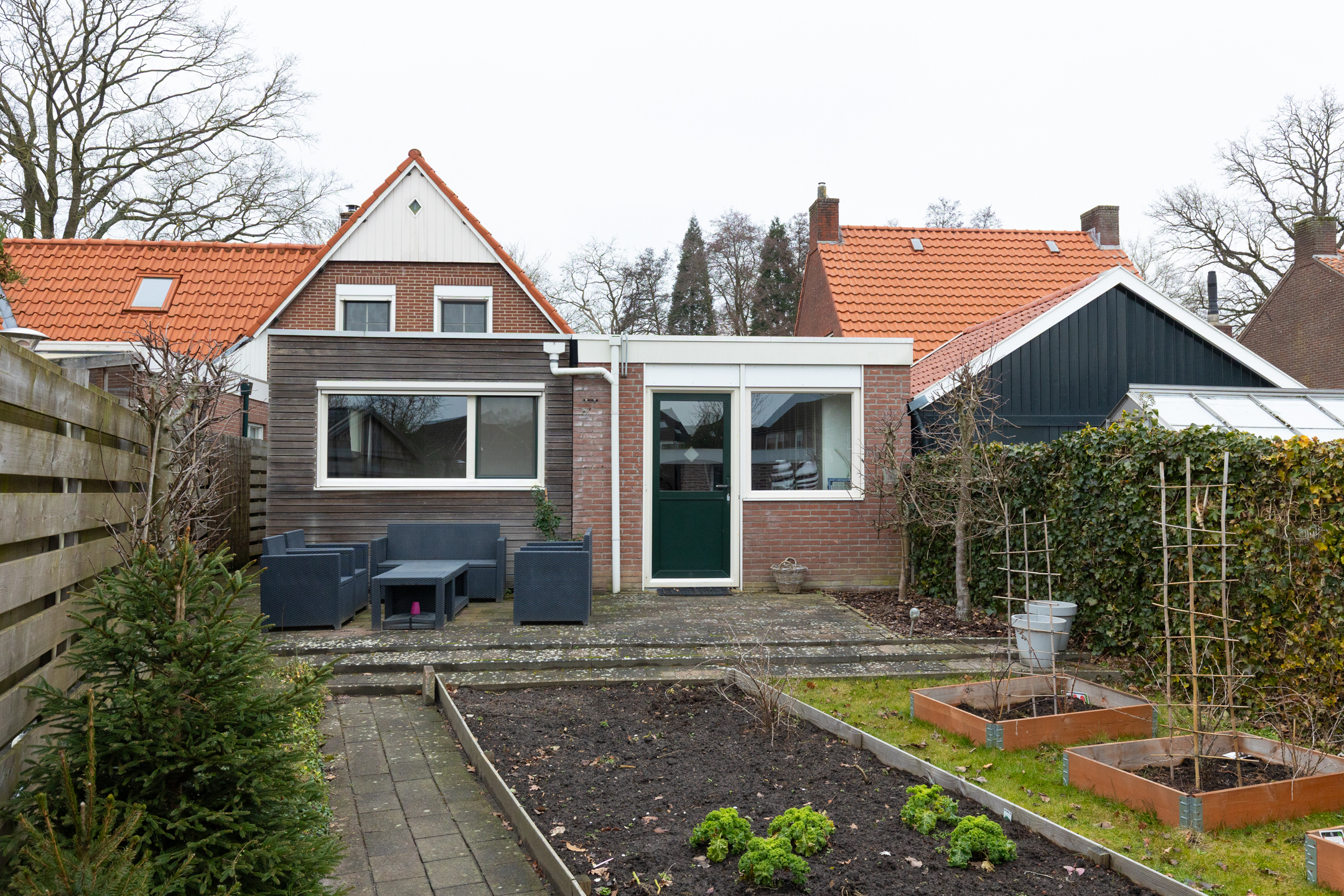 De tuin is o.a. voorzien van planten- en groentebedden, fijn voor de liefhebber van tuinieren. Daarnaast is er een stenen berging met overkapping – handige ruimte voor je tuinspullen of een gezellige zithoek.