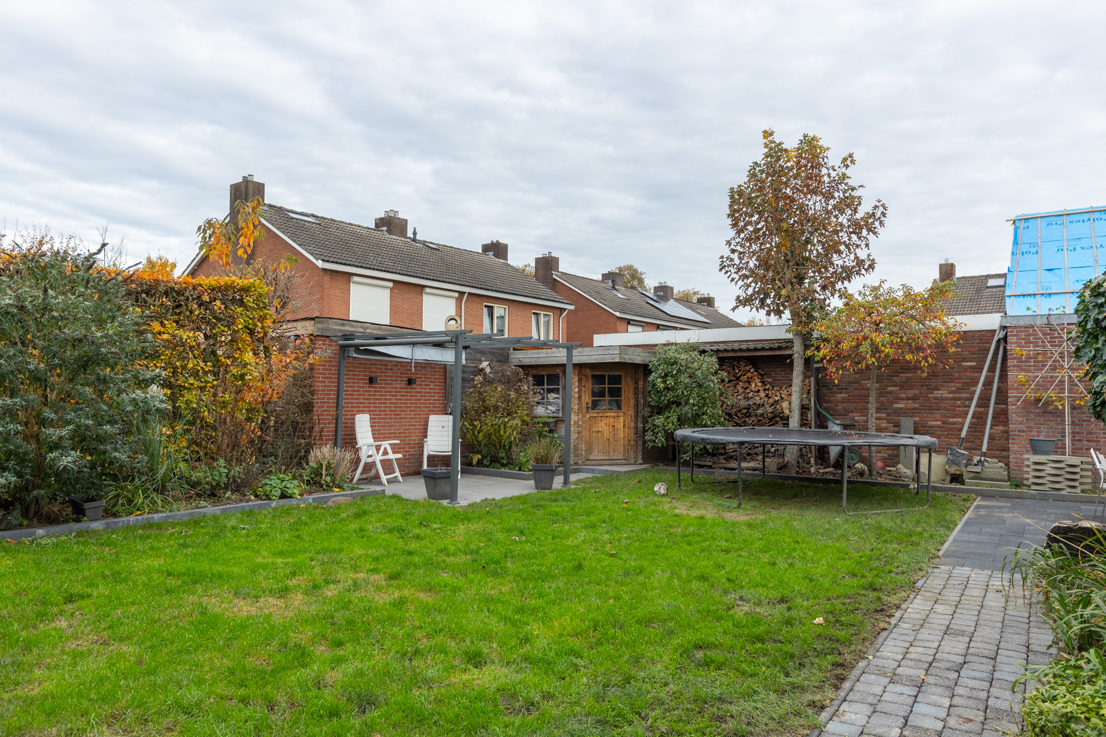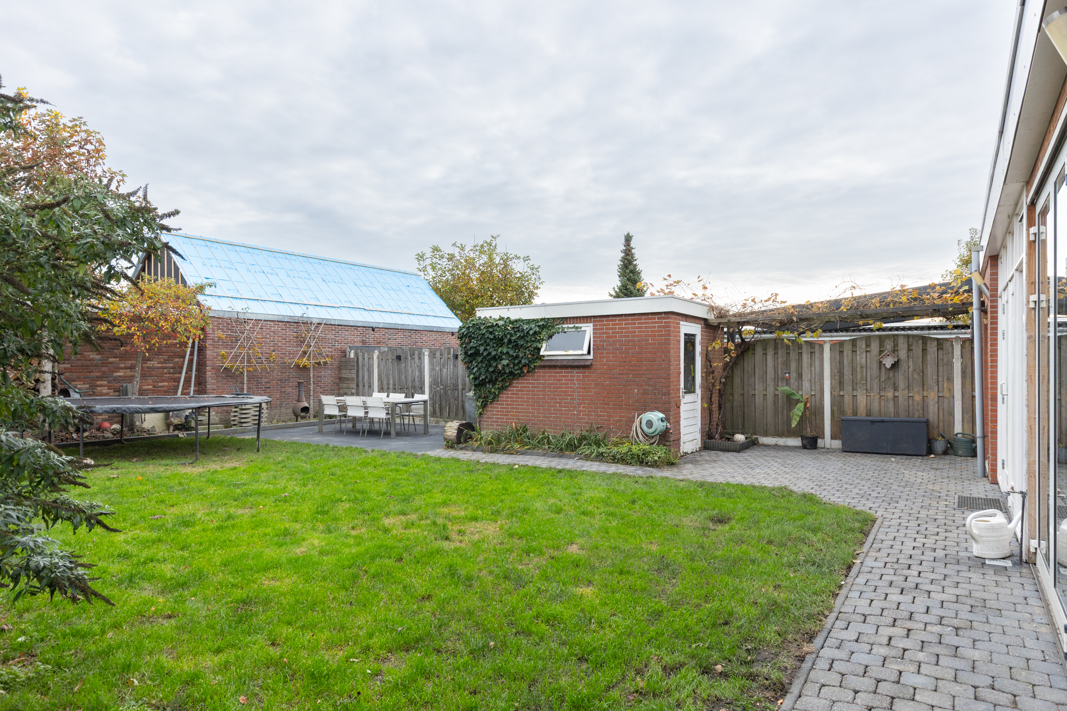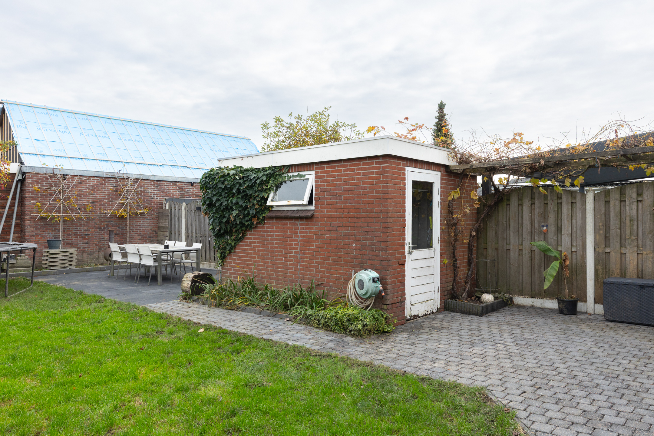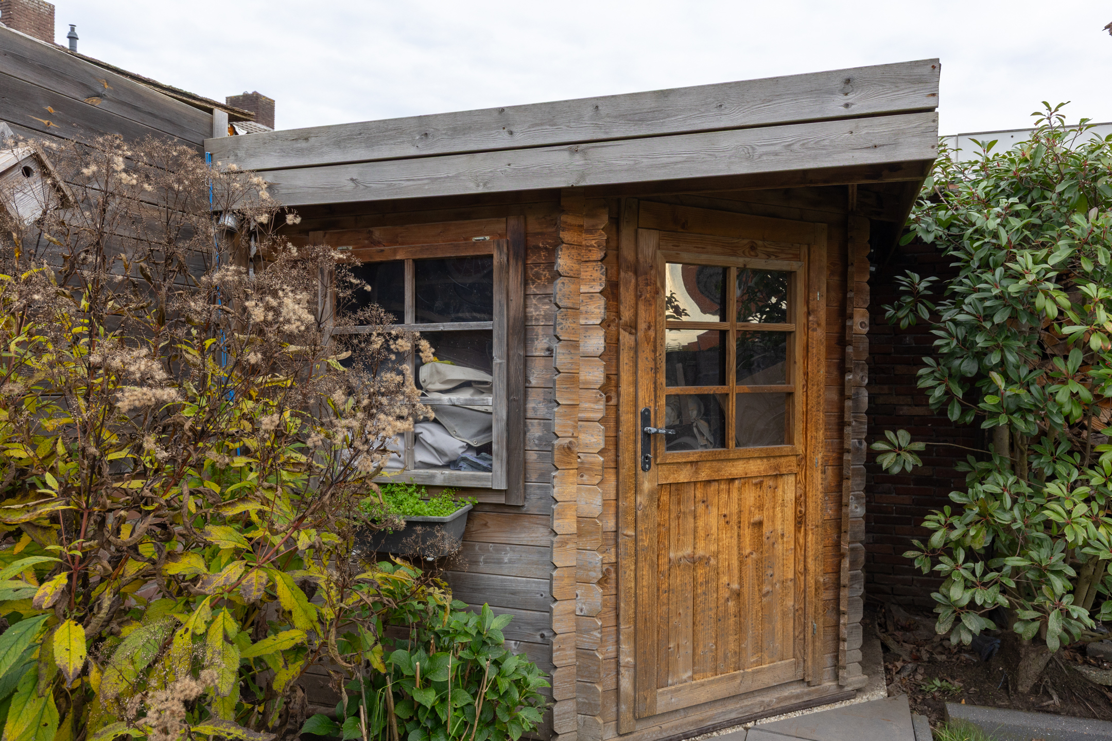 De achtertuin biedt veel privacy en beschikt over een vrijstaand stenen schuurtje en een houten berging voor tuingereedschap en een gezellig zitje.