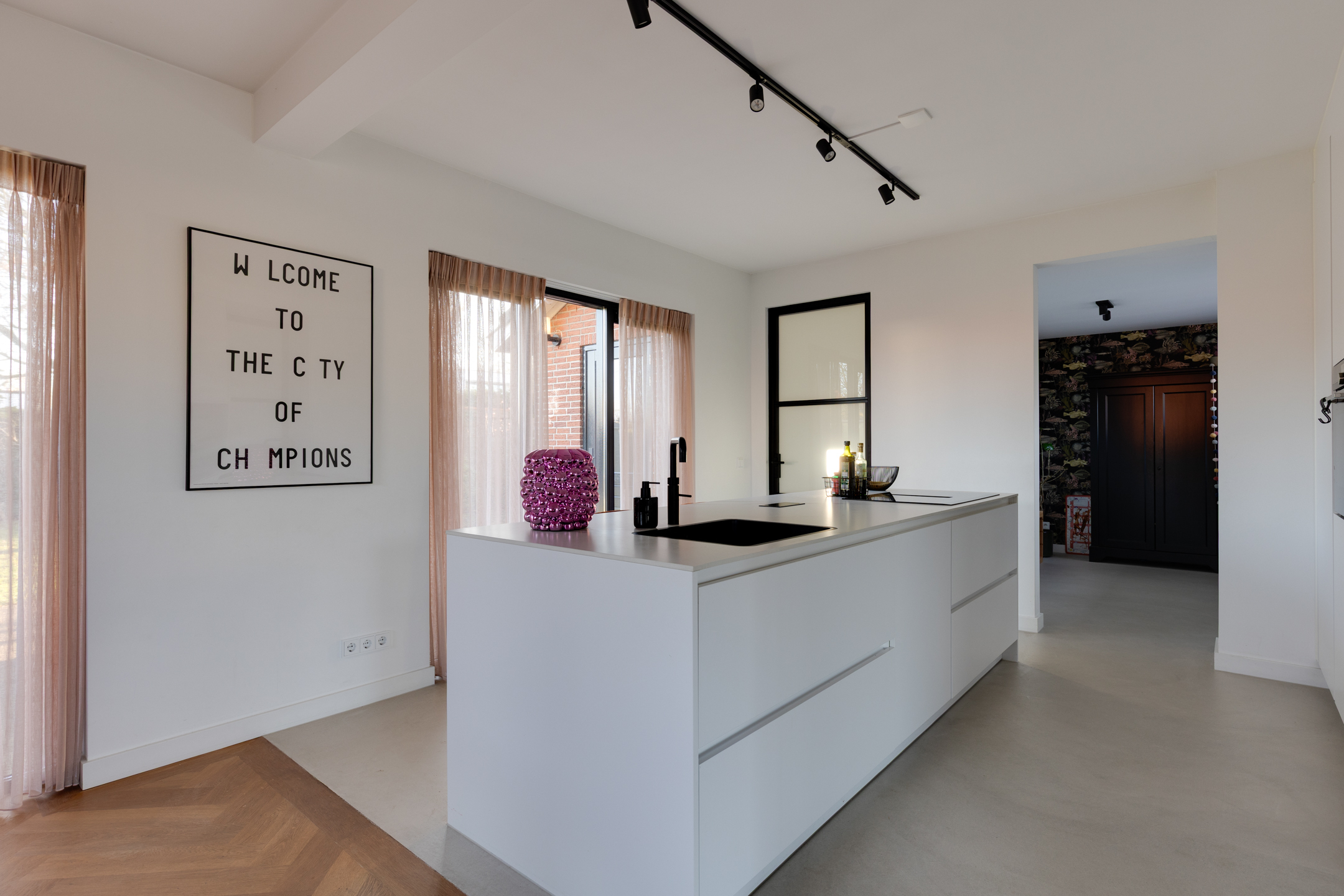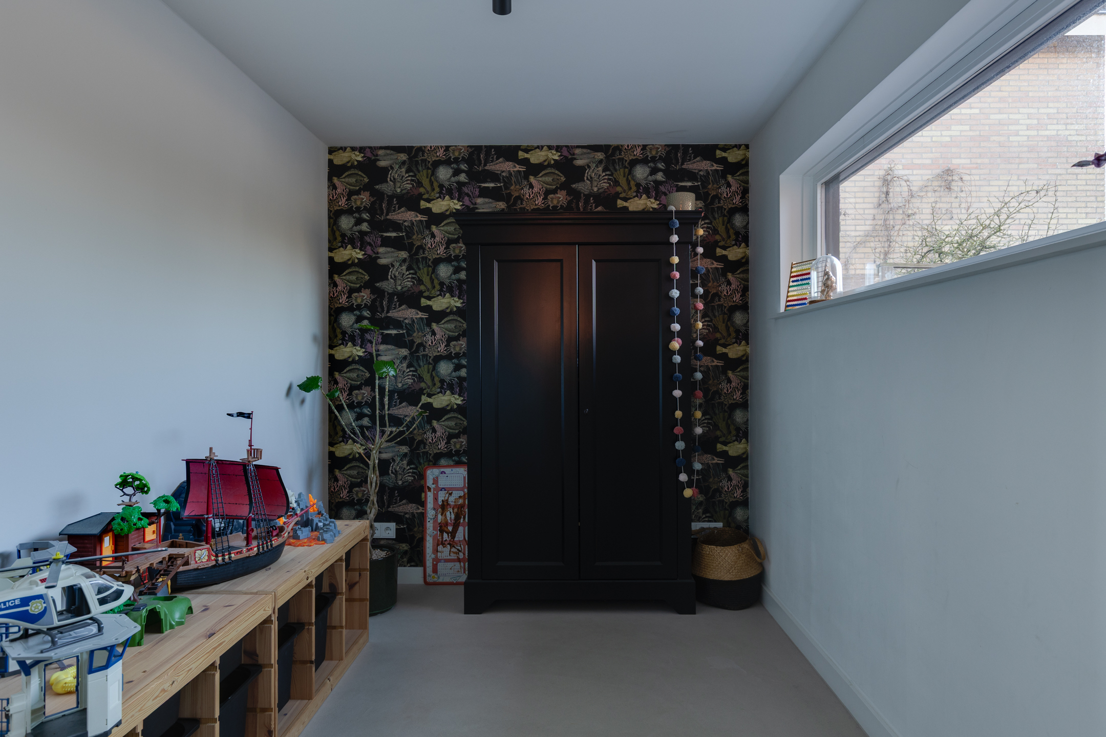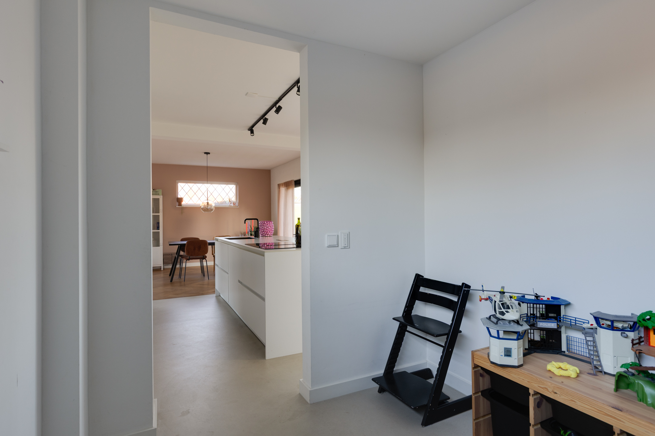 Je komt binnen in de ruime hal met kelderkast en toilet en trapopgang en loopt door naar open keuken die voorzien van een modern kookeiland met bar en een kastenwand. De keuken is voorzien van inbouwapparaten zoals een inductiekookplaat met afzuiging, Quooker kraan, grote koelkast en vaatwasser. Via de keuken bereik je de ruime en lichte woonkamer, die opgedeeld is in een zit- en eetgedeelte. Het eetgedeelte heeft zicht op de verzorgde achtertuin en beschikt over openslaande tuindeuren. Aan de andere zijde van de keuken zijn de speelkamer en de bijkeuken gesitueerd.