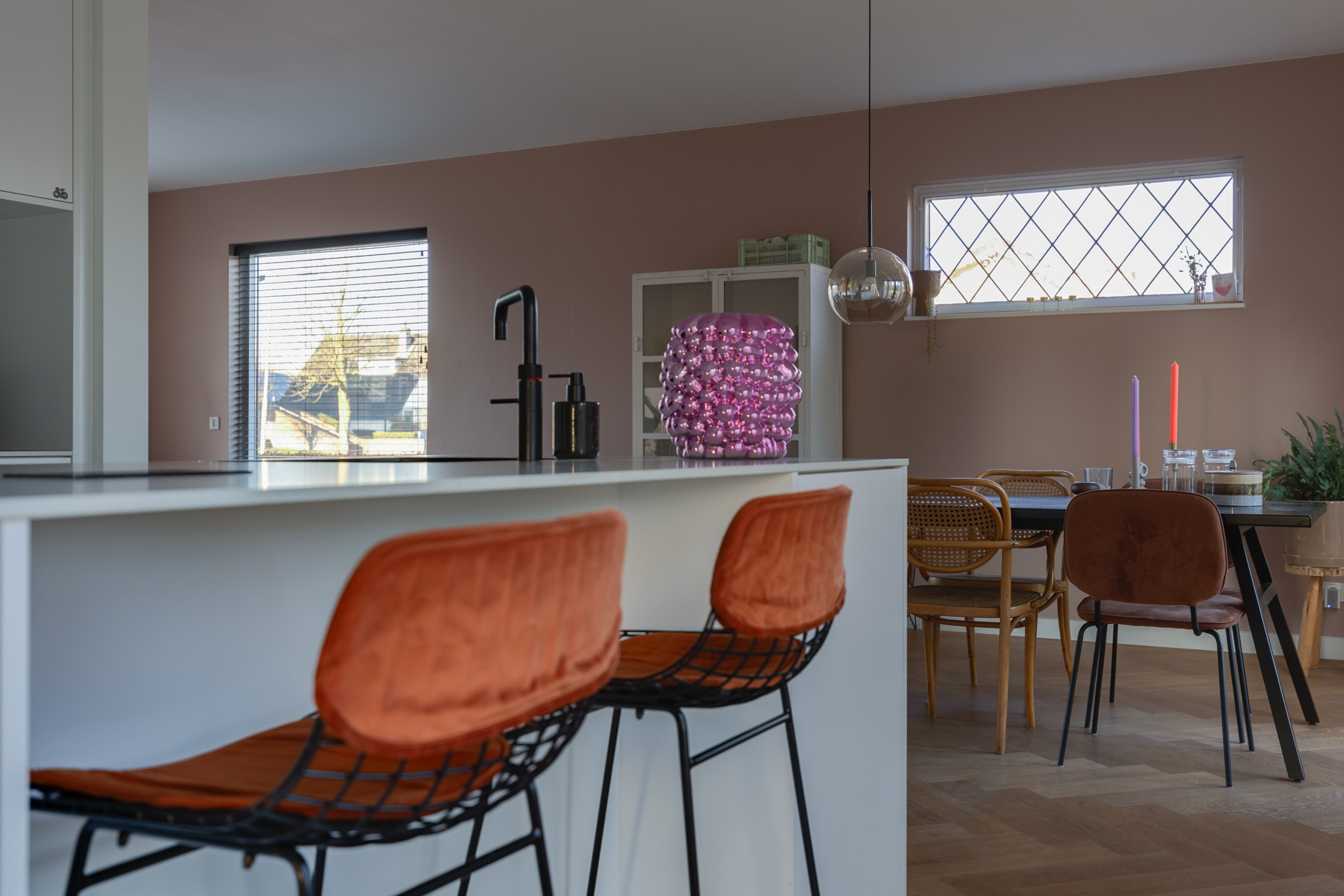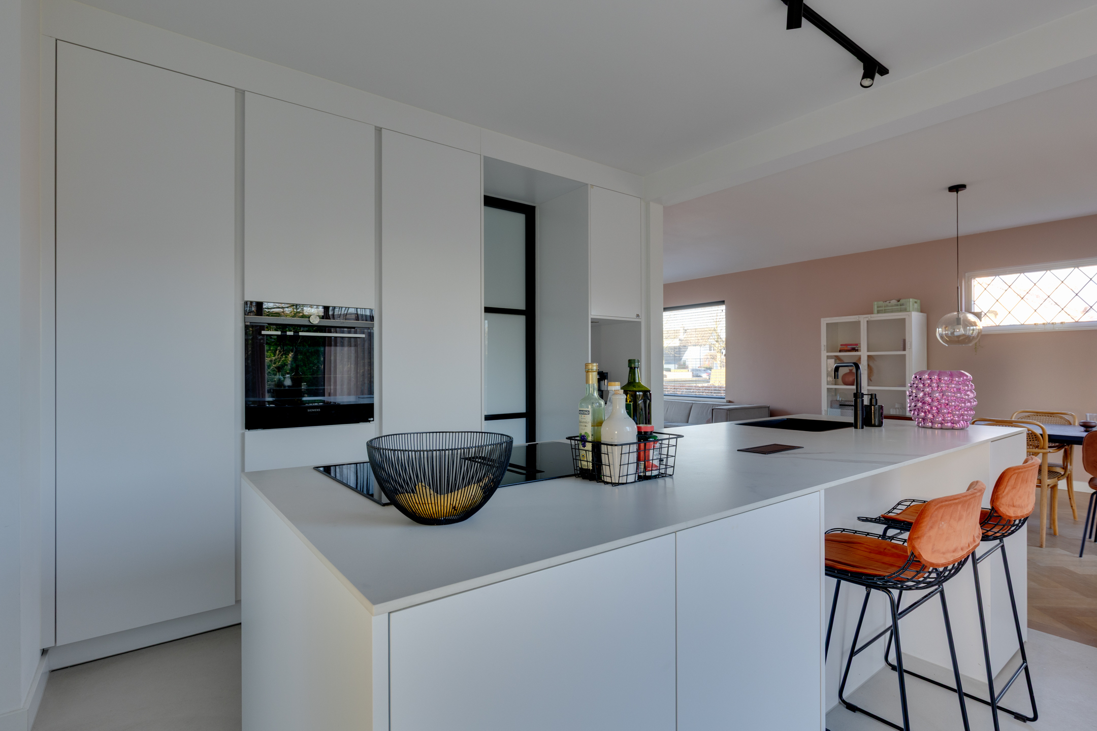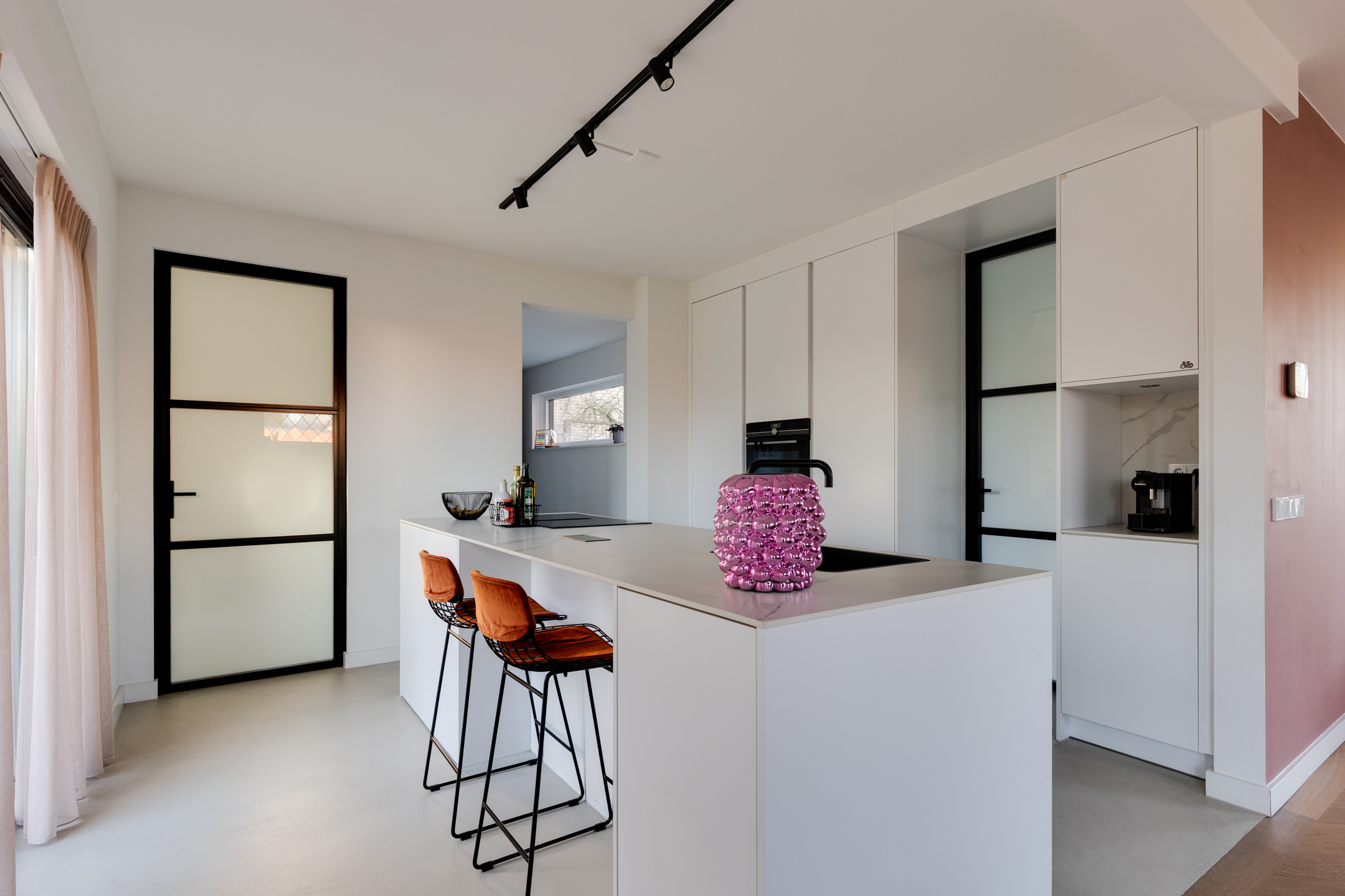 Je komt binnen in de ruime hal met kelderkast en toilet en trapopgang en loopt door naar open keuken die voorzien van een modern kookeiland met bar en een kastenwand. De keuken is voorzien van inbouwapparaten zoals een inductiekookplaat met afzuiging, Quooker kraan, grote koelkast en vaatwasser. Via de keuken bereik je de ruime en lichte woonkamer, die opgedeeld is in een zit- en eetgedeelte. Het eetgedeelte heeft zicht op de verzorgde achtertuin en beschikt over openslaande tuindeuren. Aan de andere zijde van de keuken zijn de speelkamer en de bijkeuken gesitueerd.