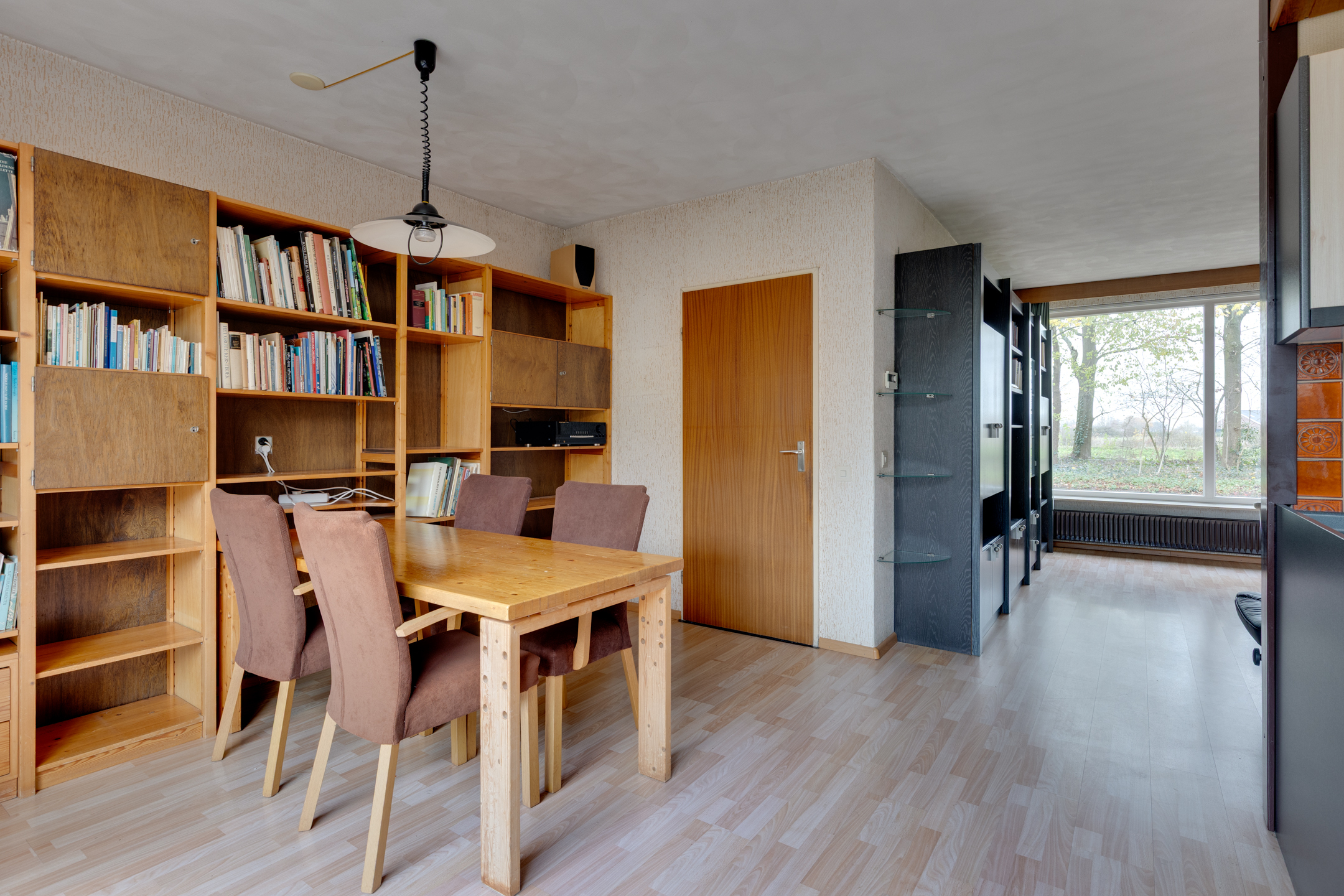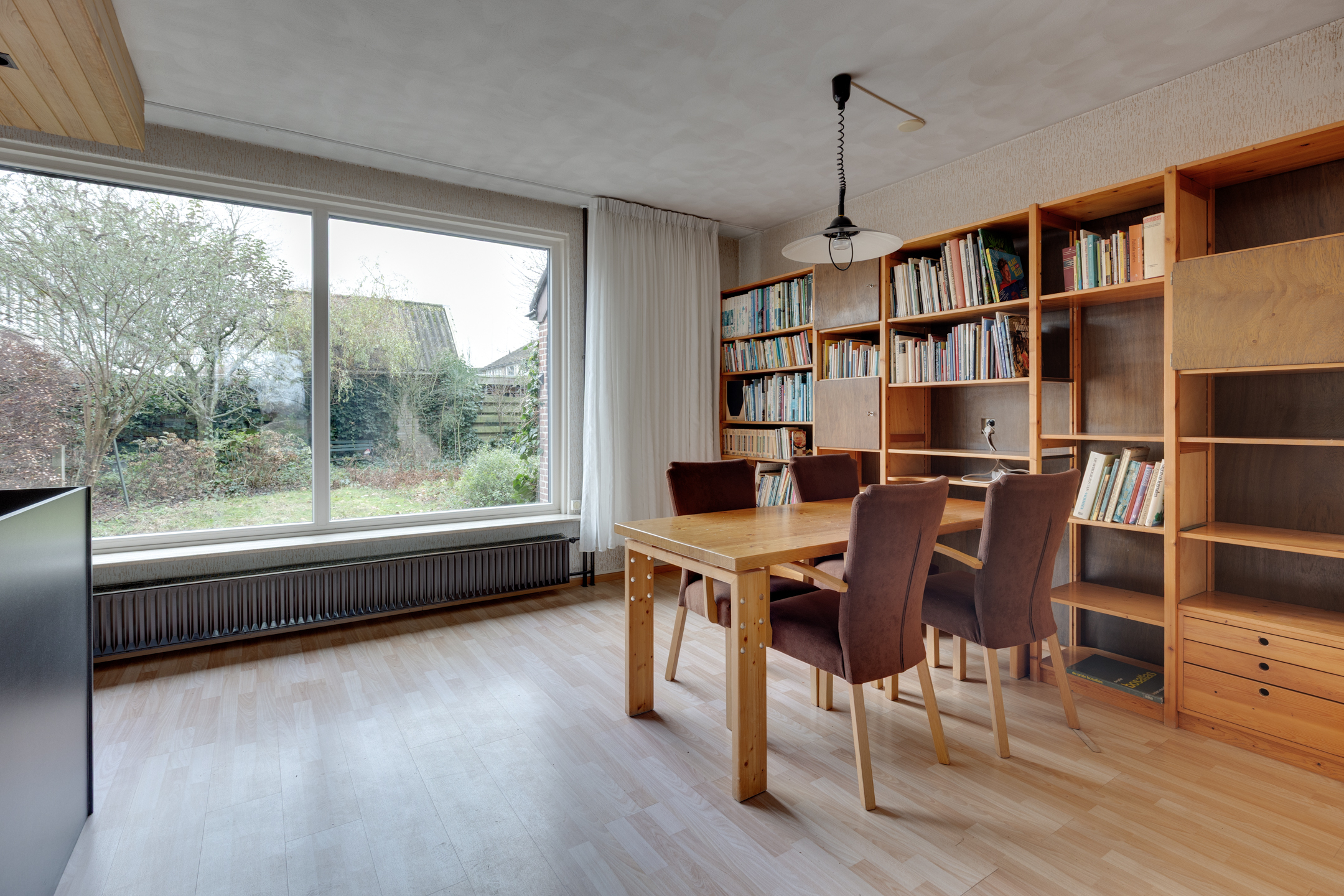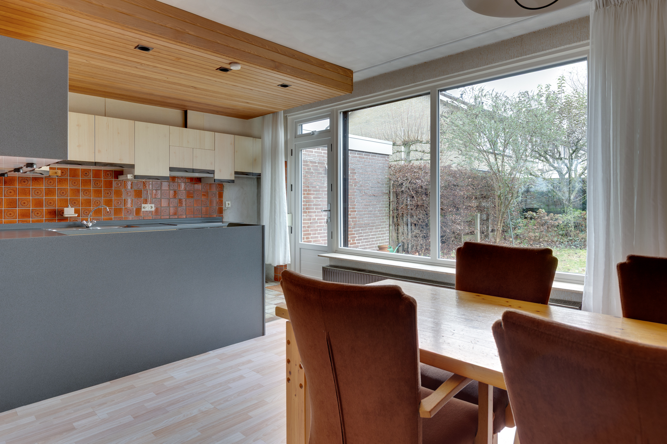 De straatgerichte woonkamer met fraai uitzicht op het omliggende groen biedt een overvloed aan daglicht door de grote raampartijen. De woonkamer loopt door naar het eetgedeelte en de open keuken. Vanuit de keuken stap je zo de achtertuin in.