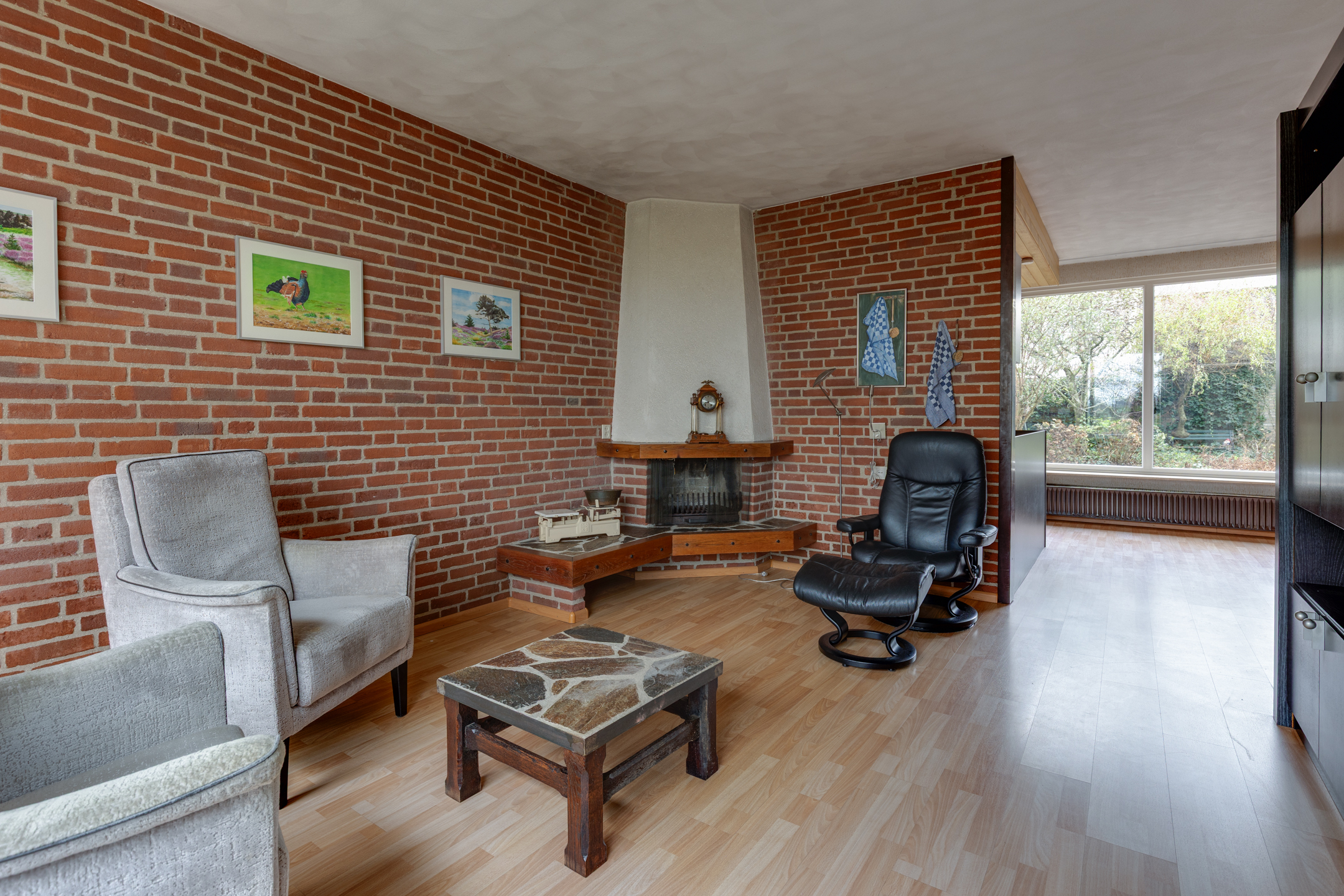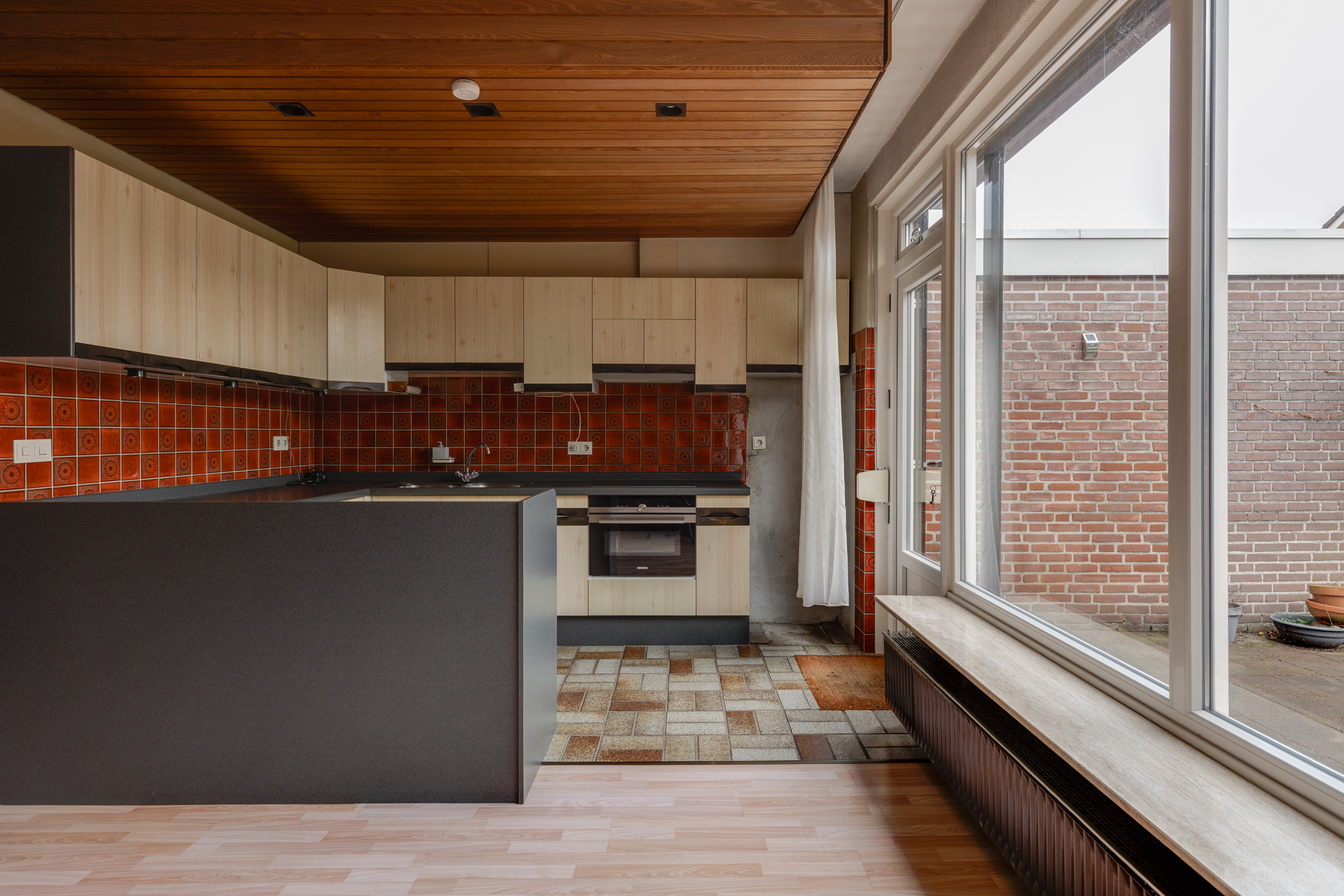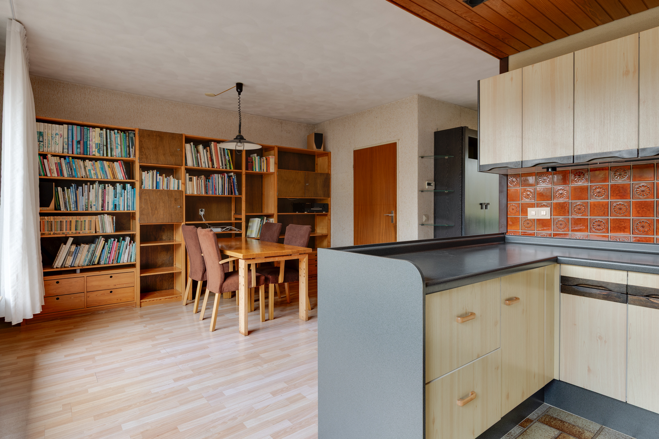 De straatgerichte woonkamer met fraai uitzicht op het omliggende groen biedt een overvloed aan daglicht door de grote raampartijen. De woonkamer loopt door naar het eetgedeelte en de open keuken. Vanuit de keuken stap je zo de achtertuin in.
