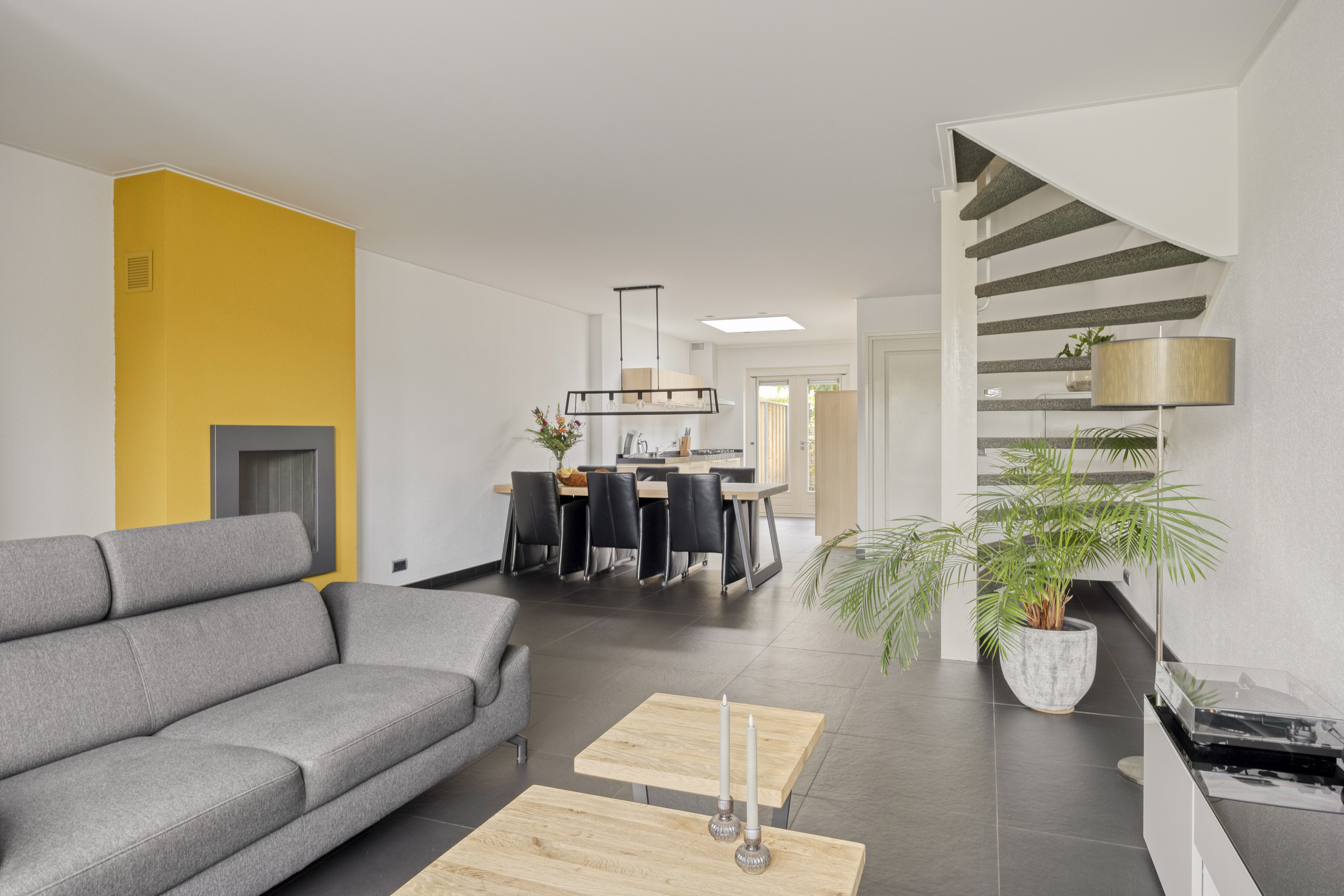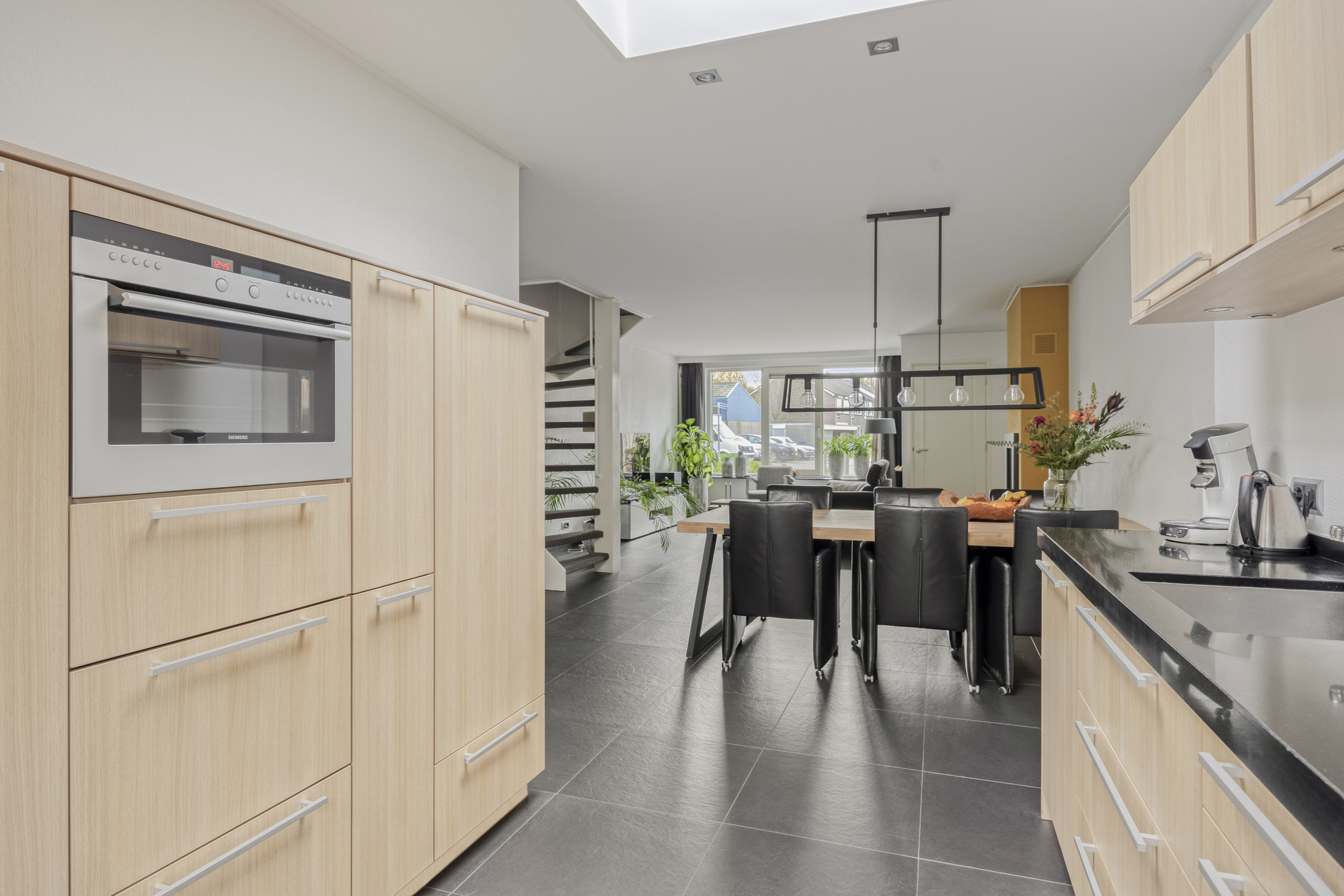 De woonkamer is straatgericht, voorzien van gashaard en heeft dankzij de grote raampartijen veel lichtinval. Naast de woonkamer bevindt zich het eetgedeelte waarna de uitbouwde open keuken is gesitueerd. Deze keuken is voorzien van moderne gemakken en via openslaande deuren biedt deze direct toegang tot de tuin. De begane grond is volledig voorzien van vloerverwarming.