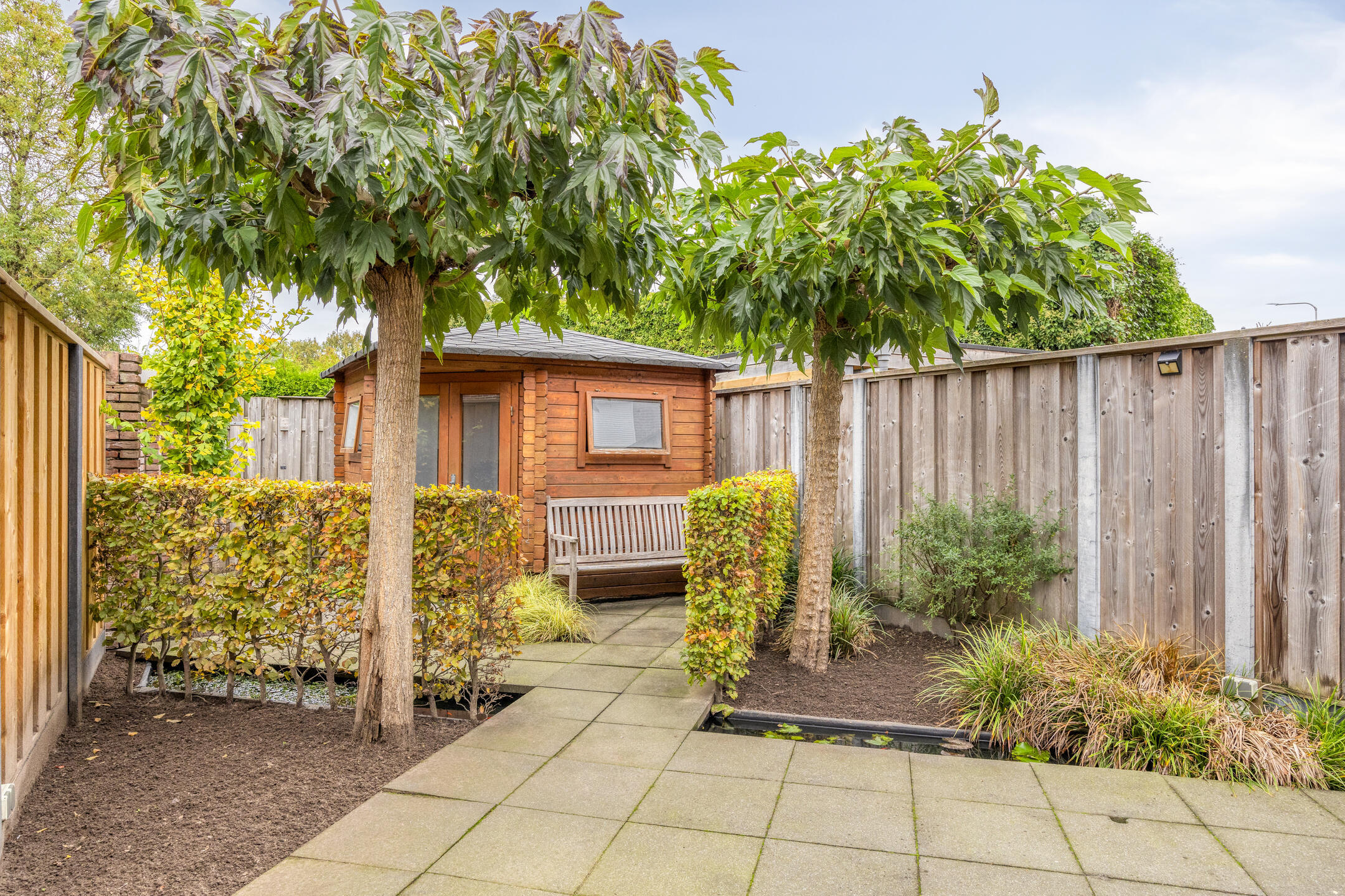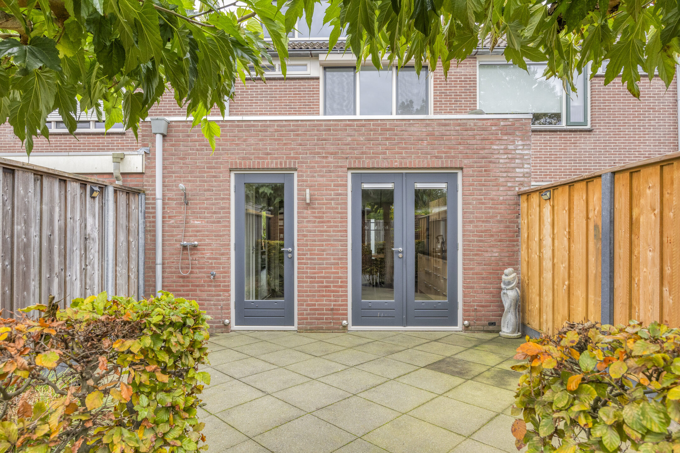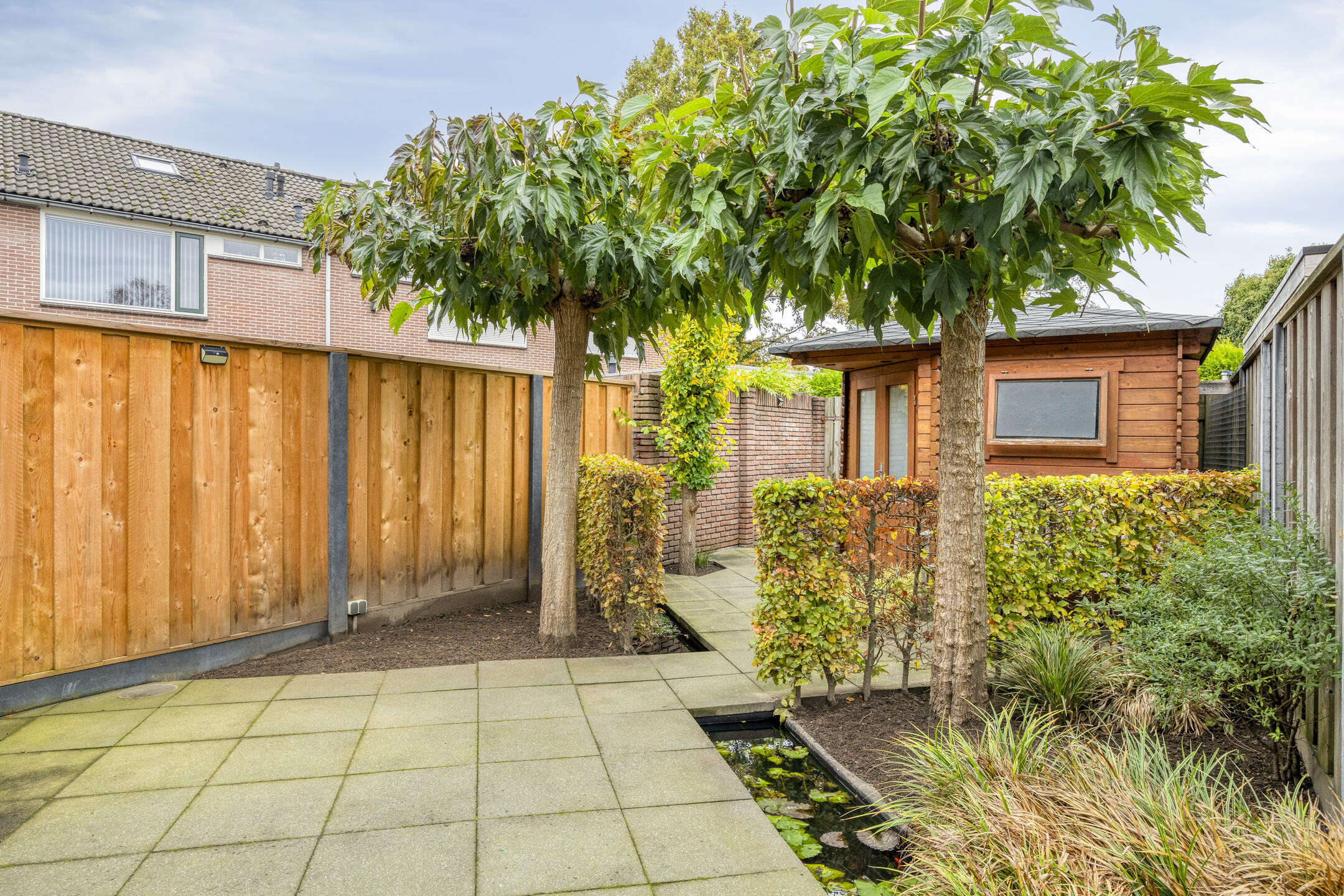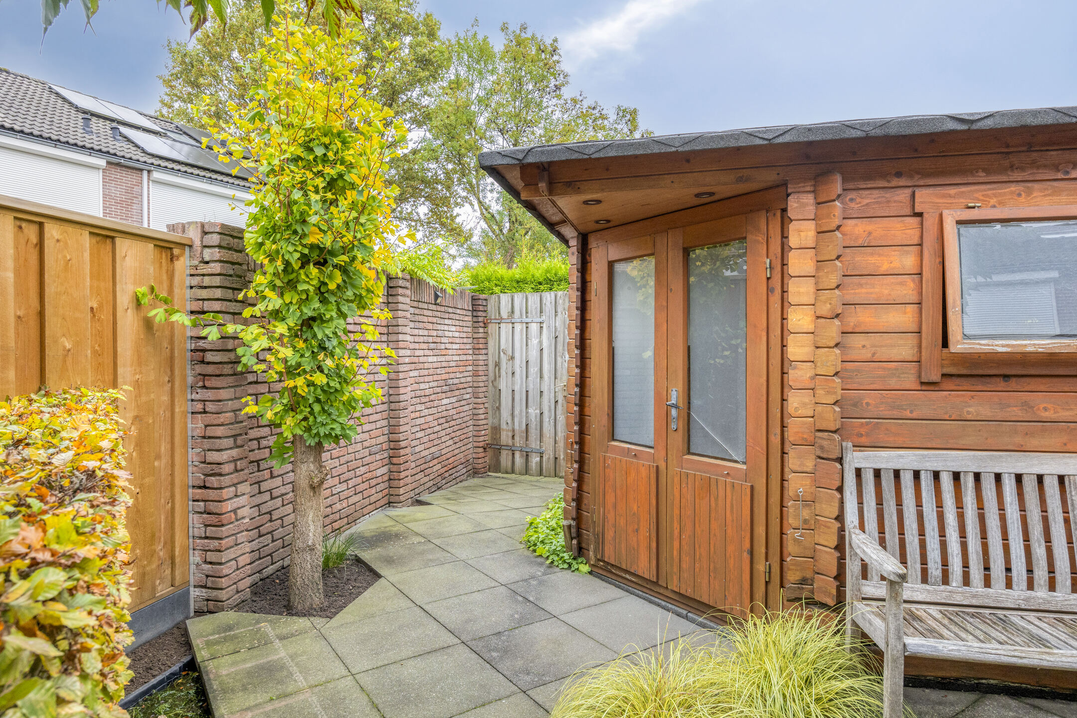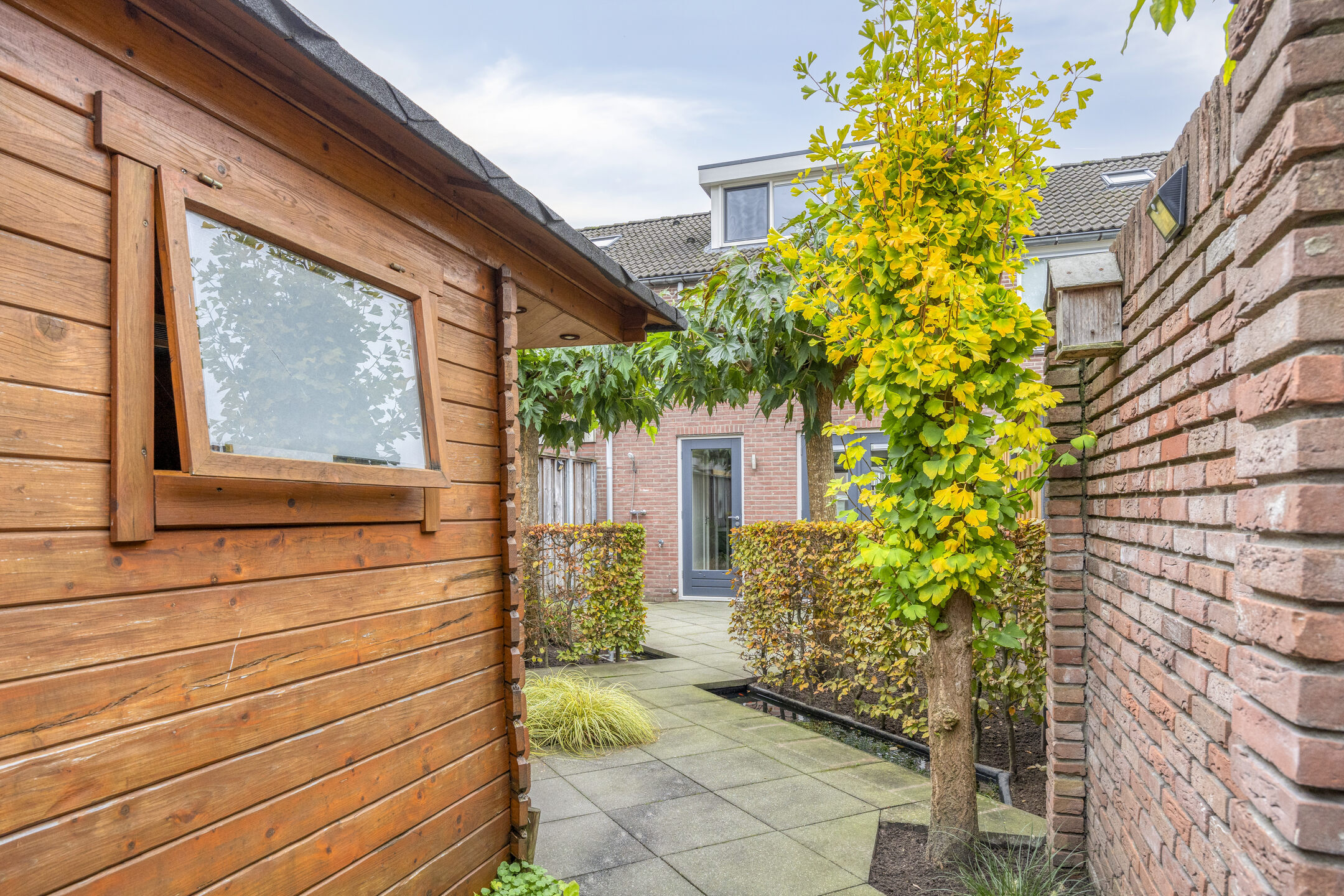 De achtertuin is via een achterom bereikbaar en beschikt over een houten berging, ideaal voor fietsen of het opbergen van tuingereedschap.