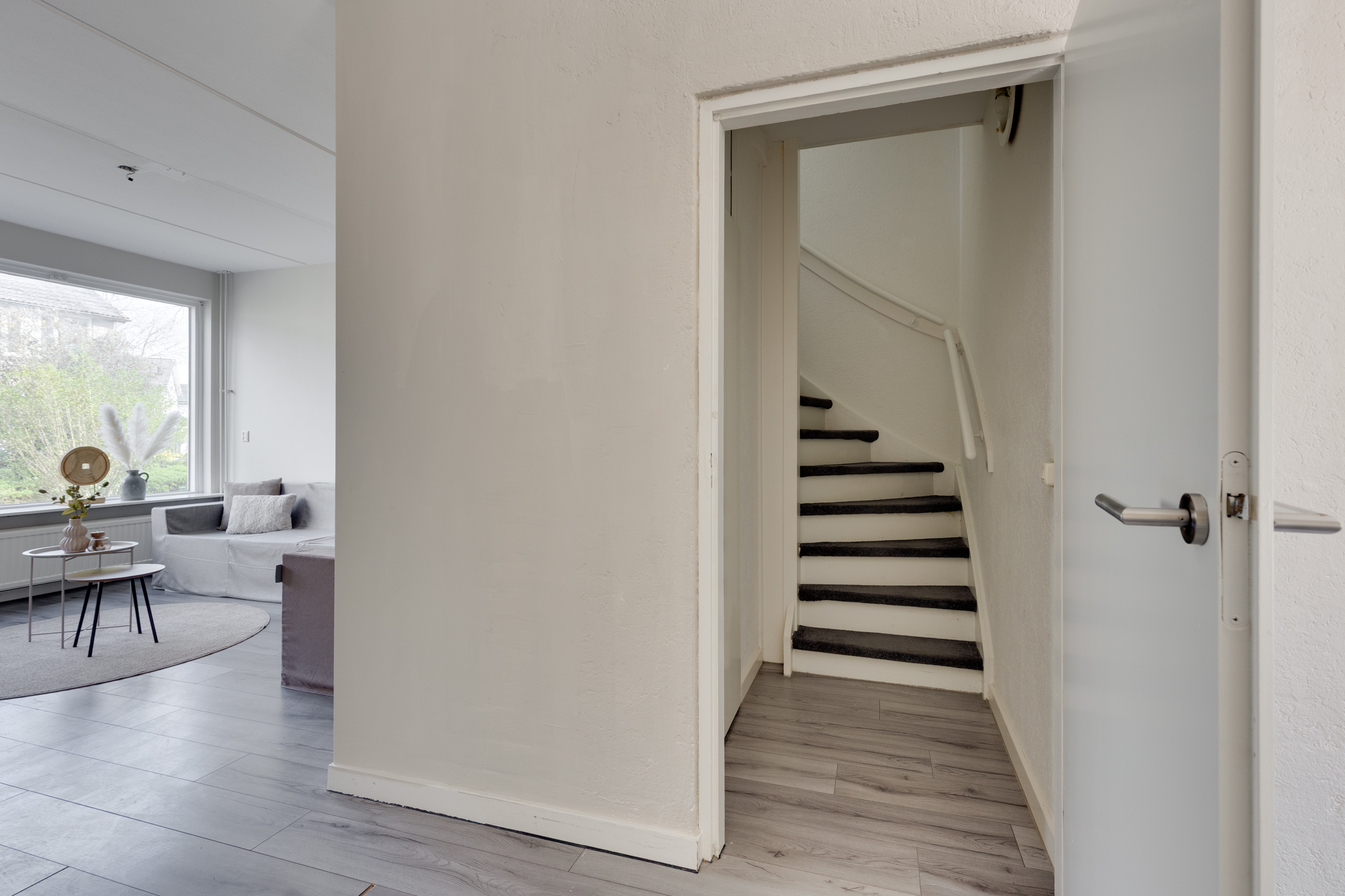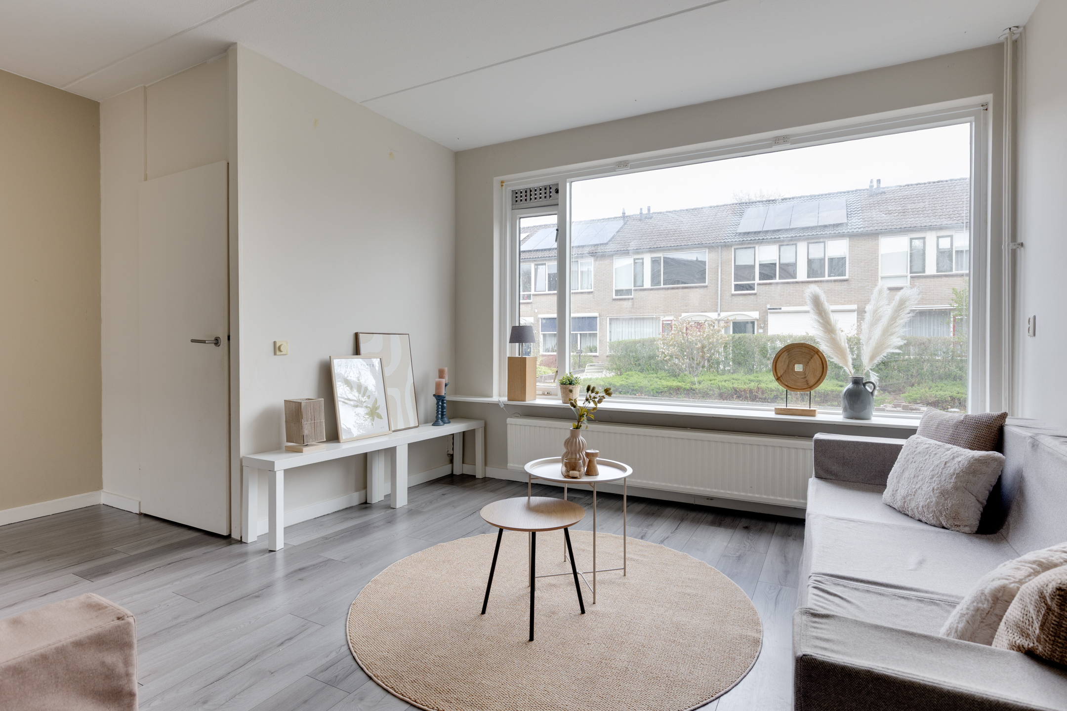Bij binnenkomst kom je in de hal met meterkast. Vanuit de hal bereik je de doorzon woonkamer, die veel daglichttoetreding heeft, en de eetkamer, die grenst aan de halfopen keuken. De keuken biedt toegang tot de bijkeuken, die is uitgerust met aansluitingen voor een wasmachine en droger. Via een klein halletje, tussen de woonkamer en het eetgedeelte, kom je bij het toilet met fonteintje en de trapopgang naar de eerste verdieping.