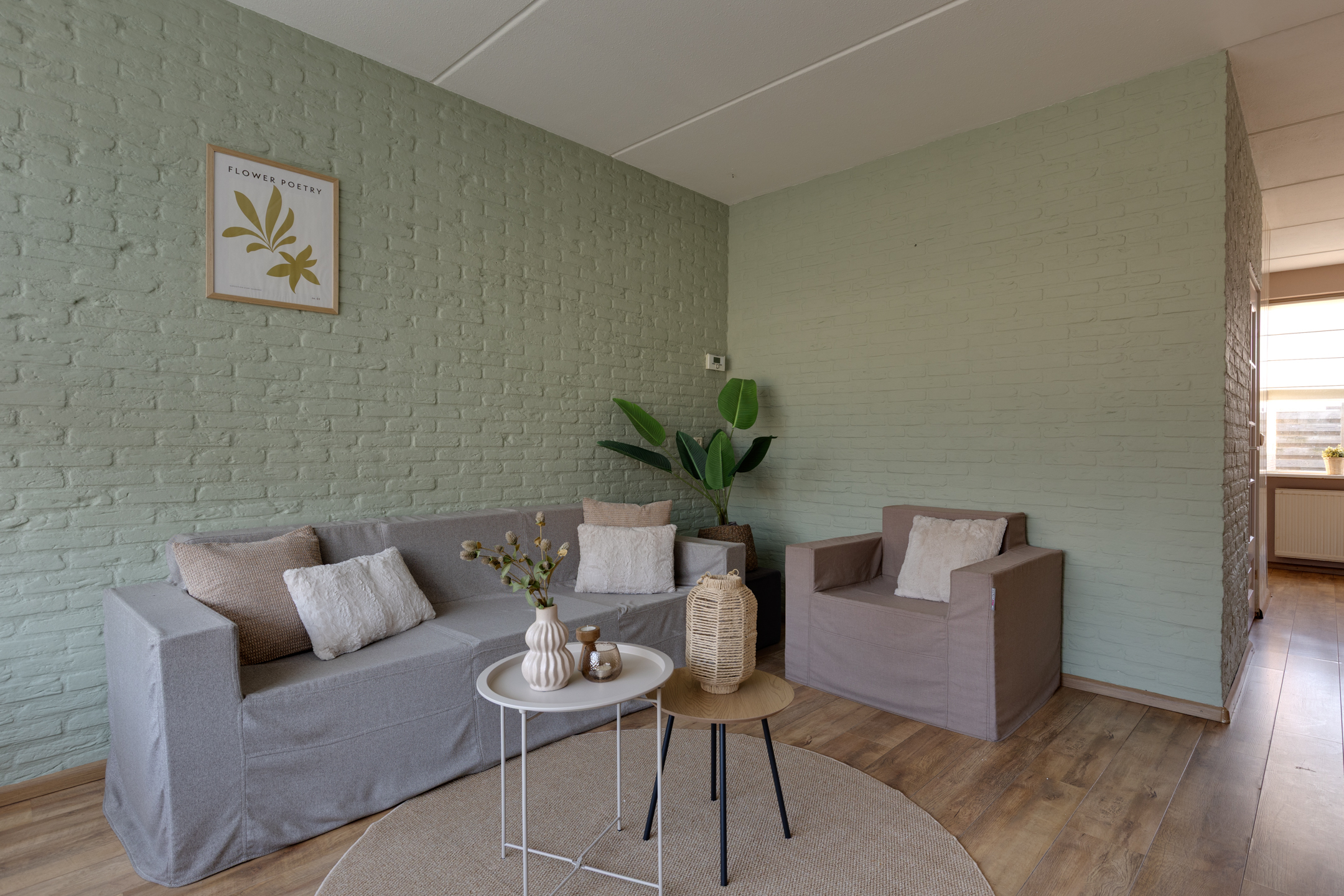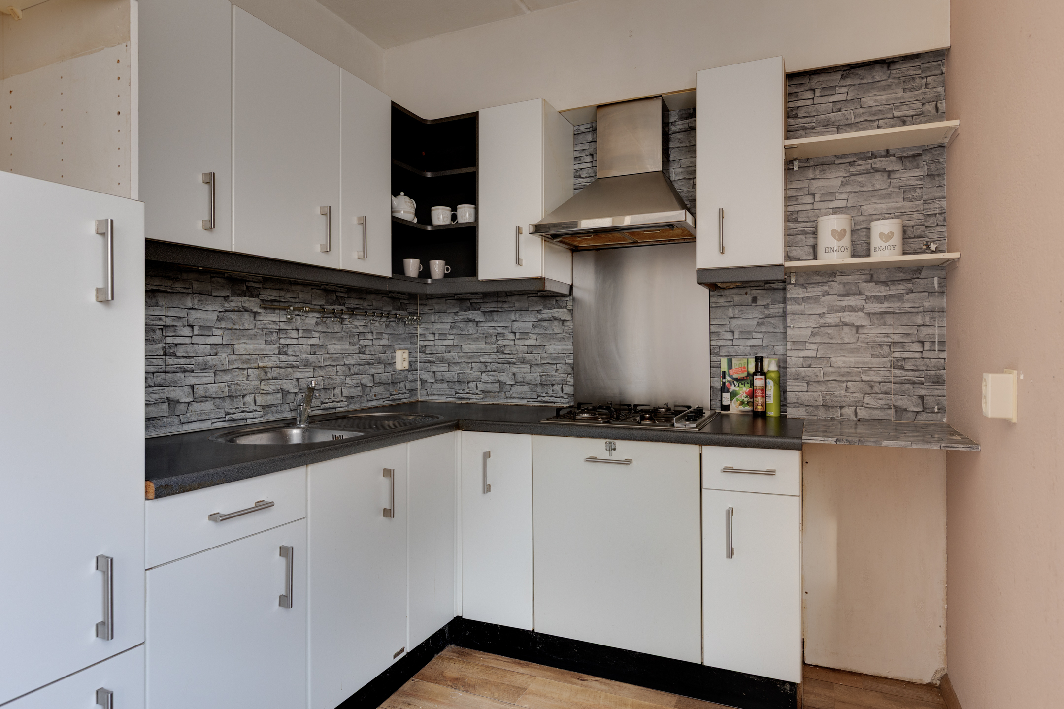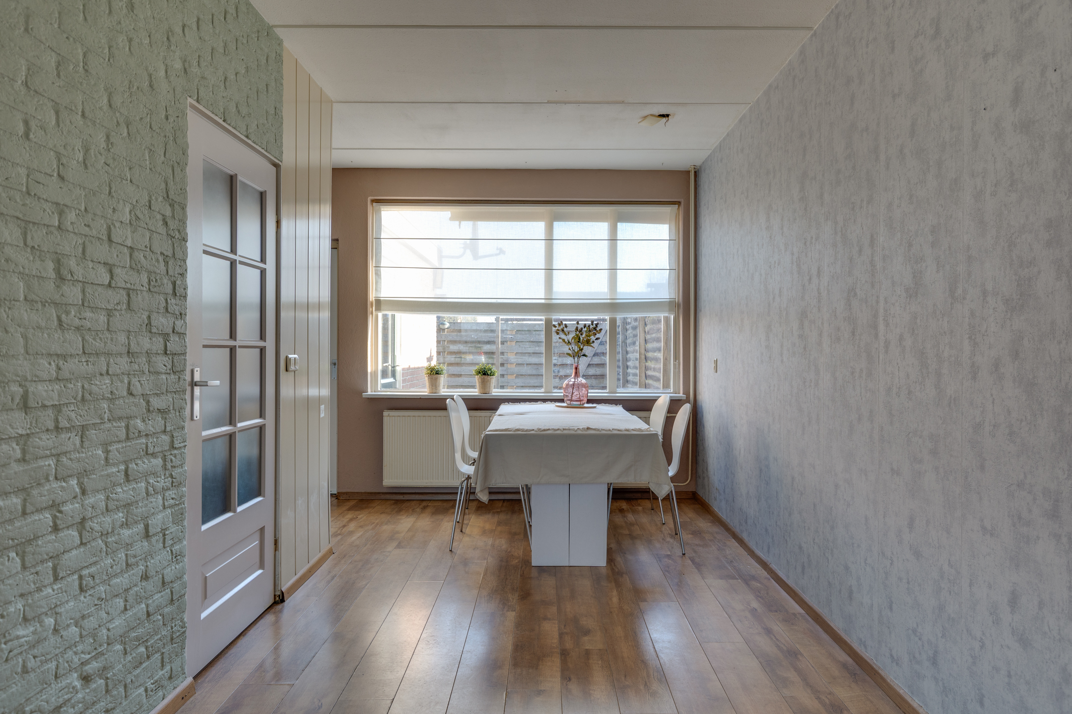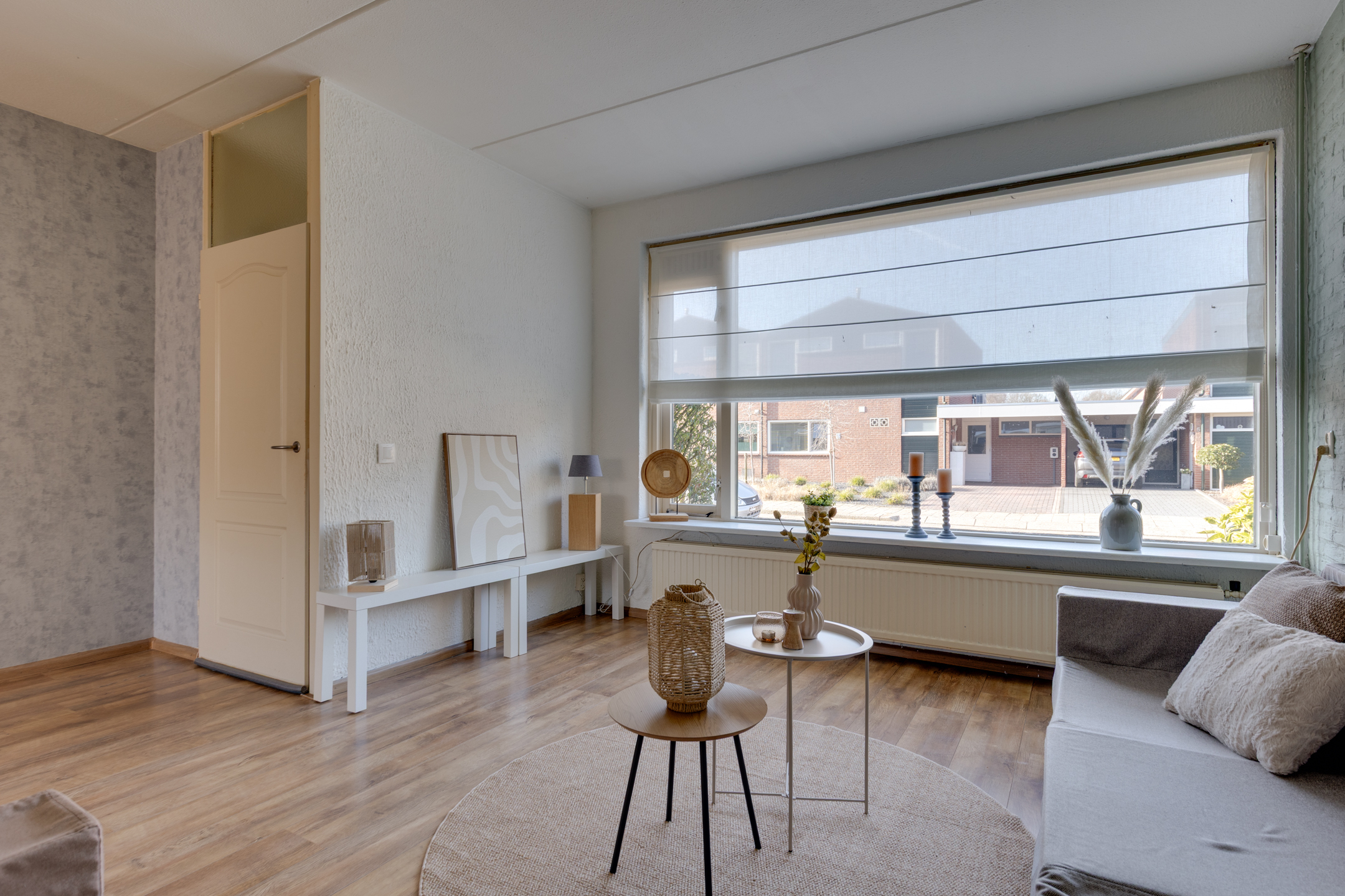 De woonkamer is aan de straatzijde gelegen en heeft door de grote raampartijen veel natuurlijke lichtinval. De keuken is voorzien van inbouwapparatuur en biedt toegang tot de bijkeuken / berging. Vanuit deze ruimte is de achtertuin te bereiken.