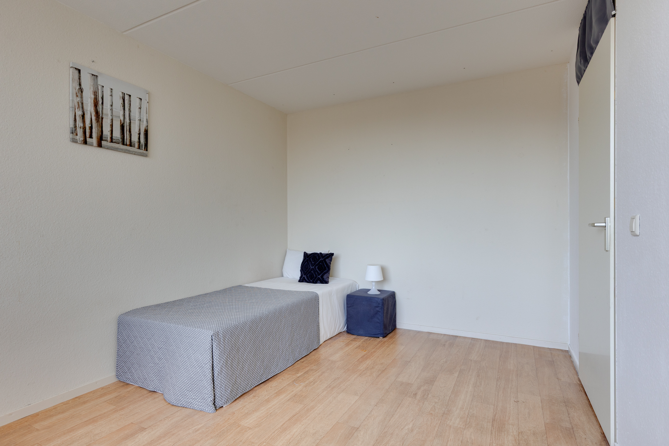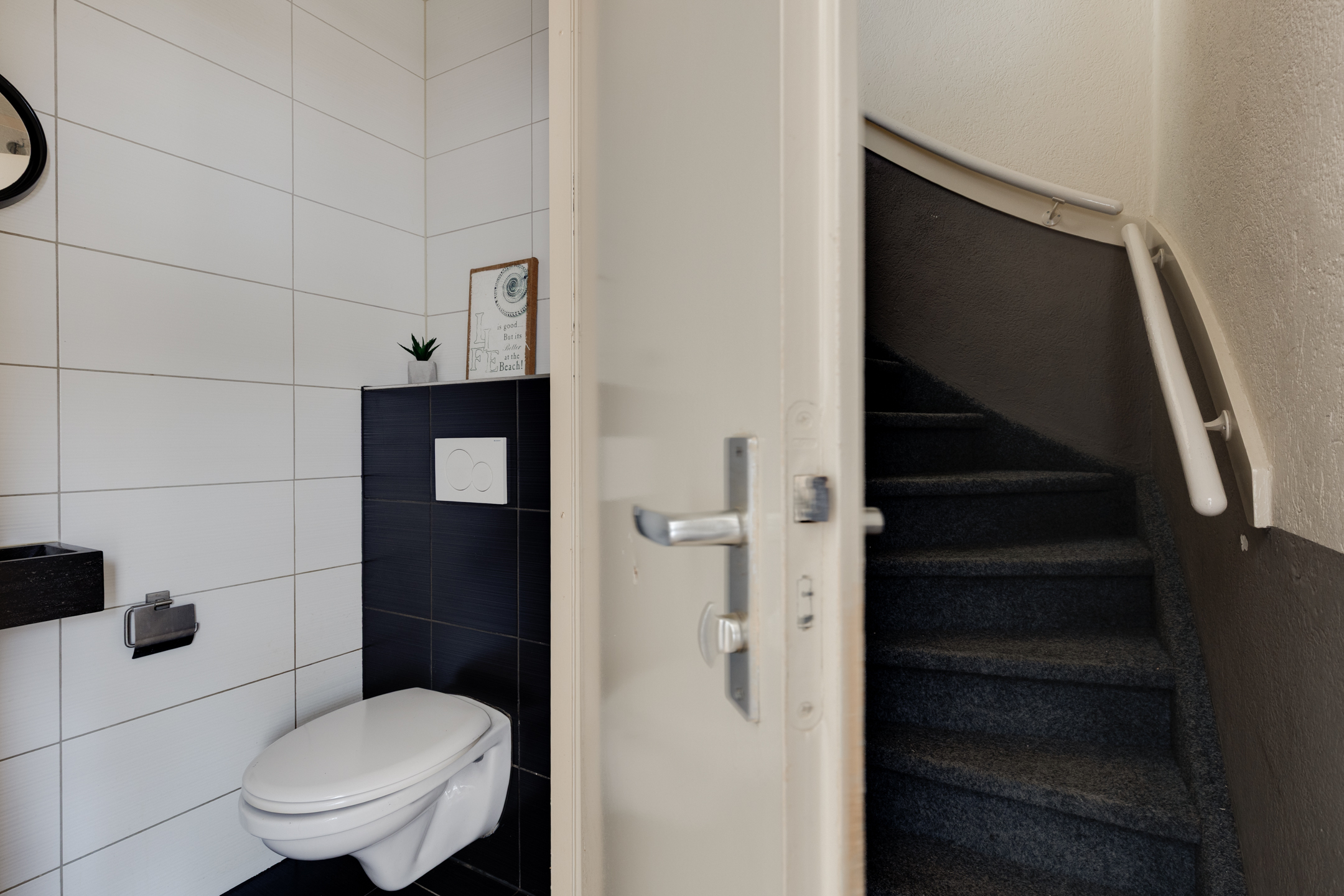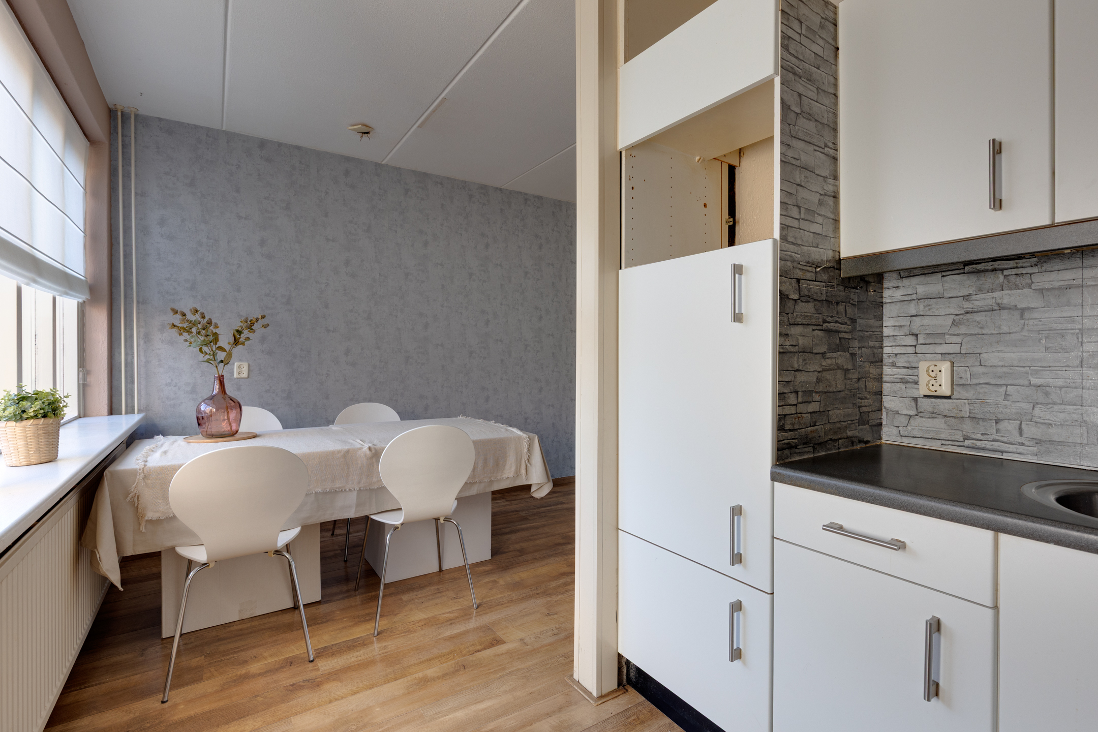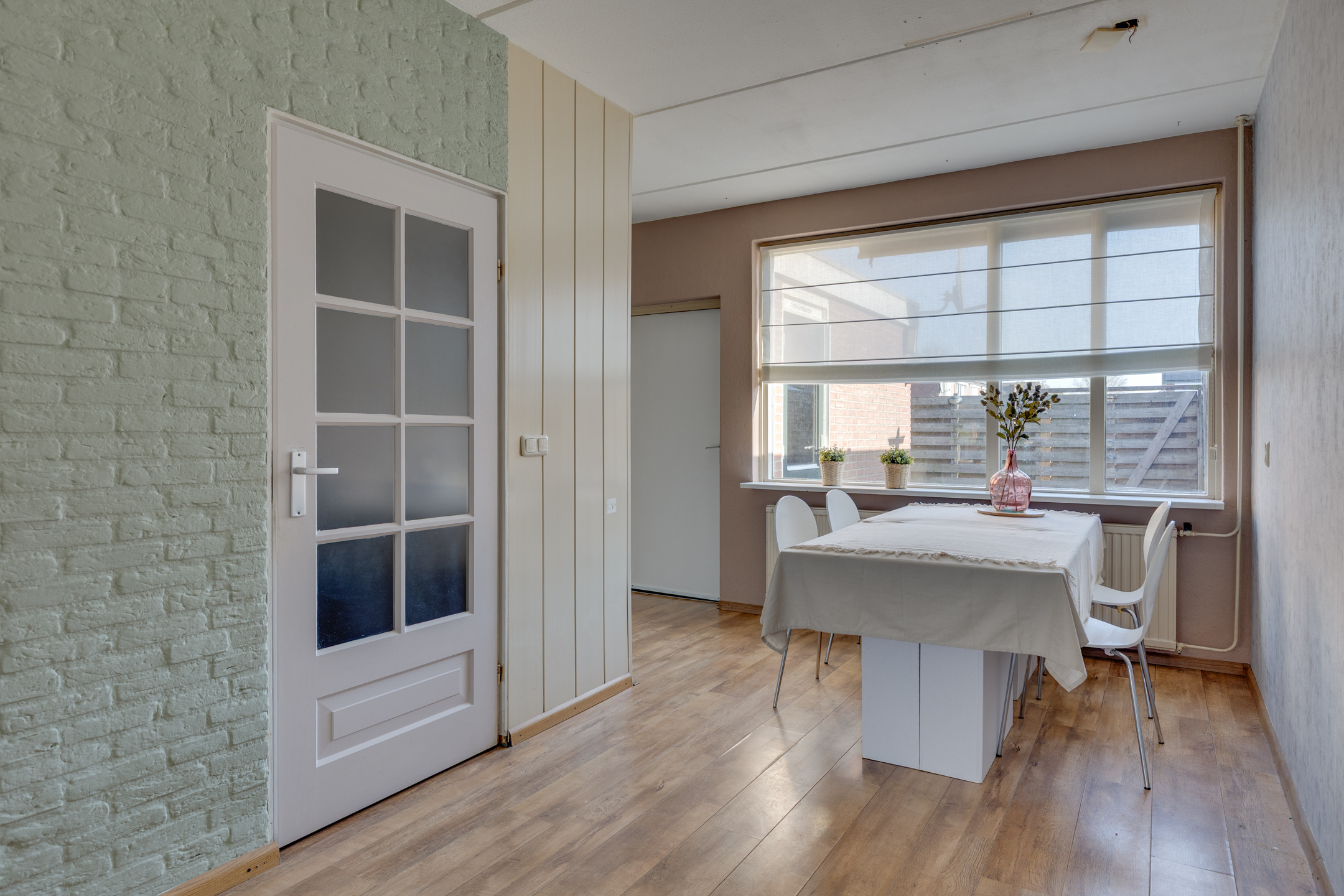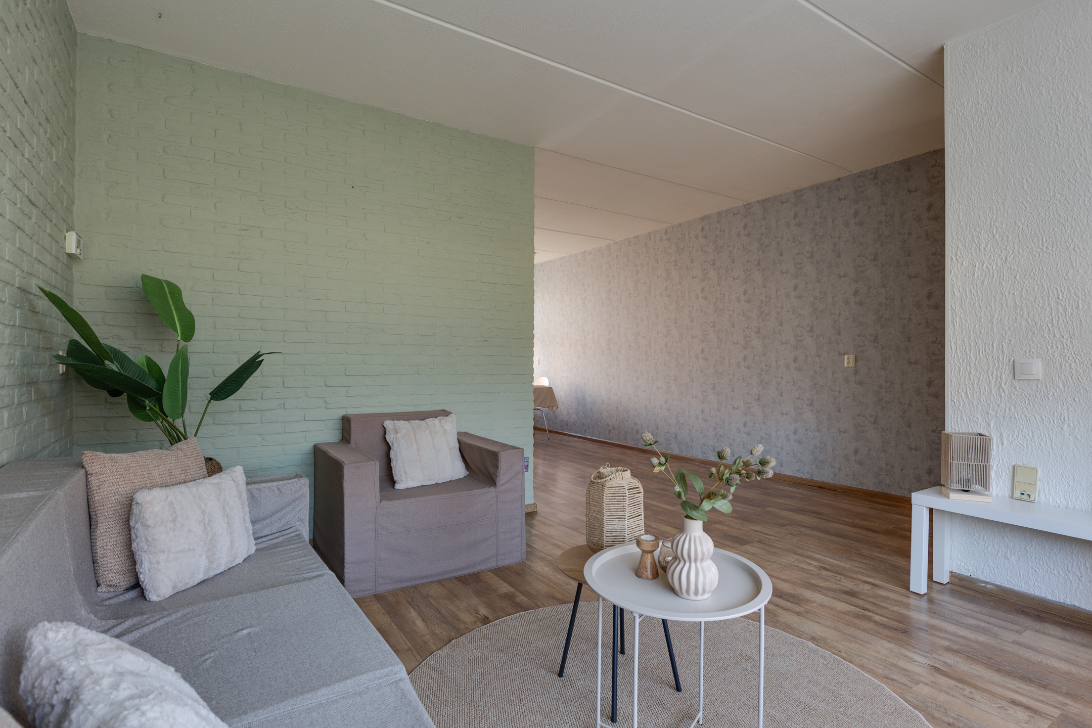De woonkamer is aan de straatzijde gelegen en heeft door de grote raampartijen veel natuurlijke lichtinval. De keuken is voorzien van inbouwapparatuur en biedt toegang tot de bijkeuken / berging. Vanuit deze ruimte is de achtertuin te bereiken.