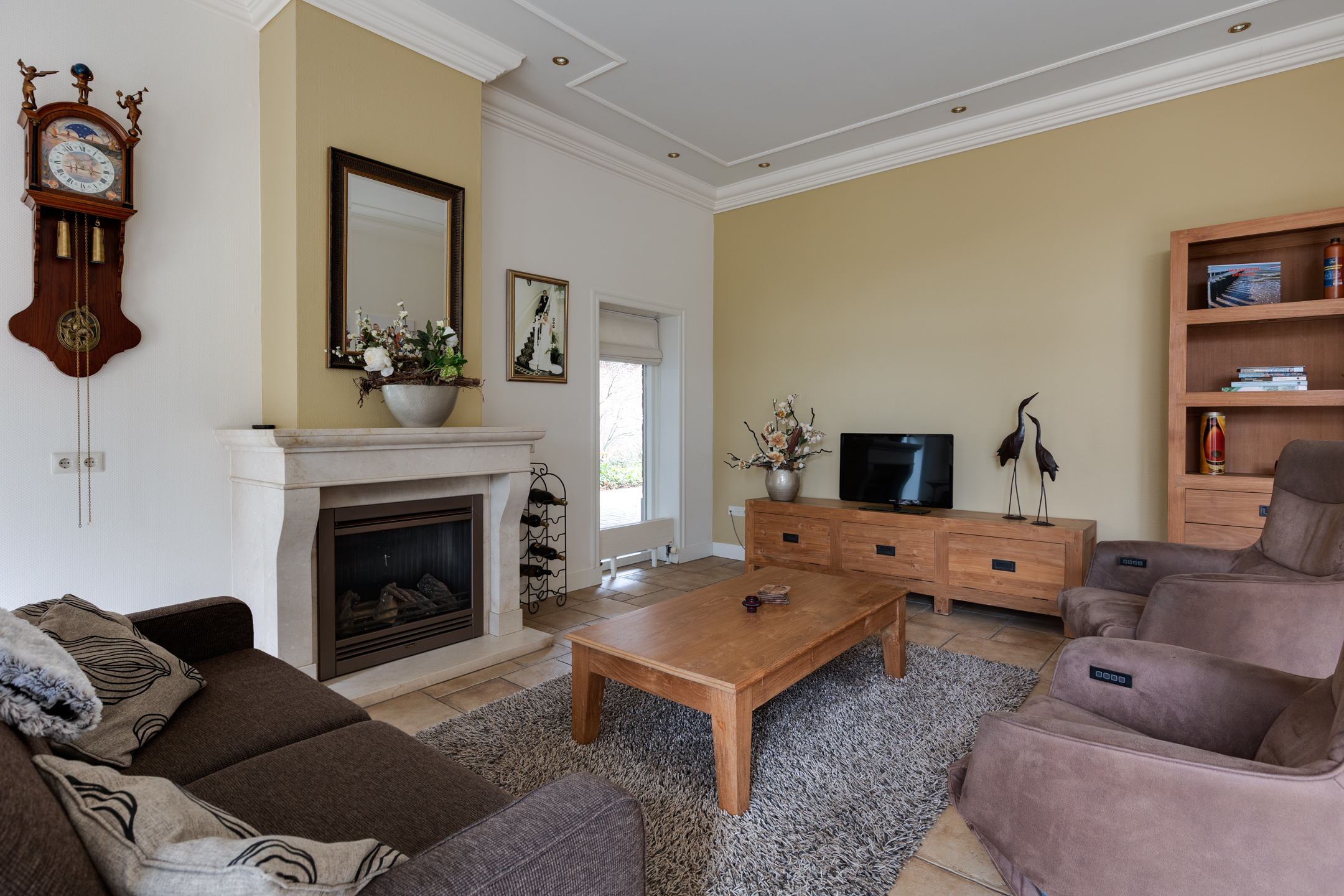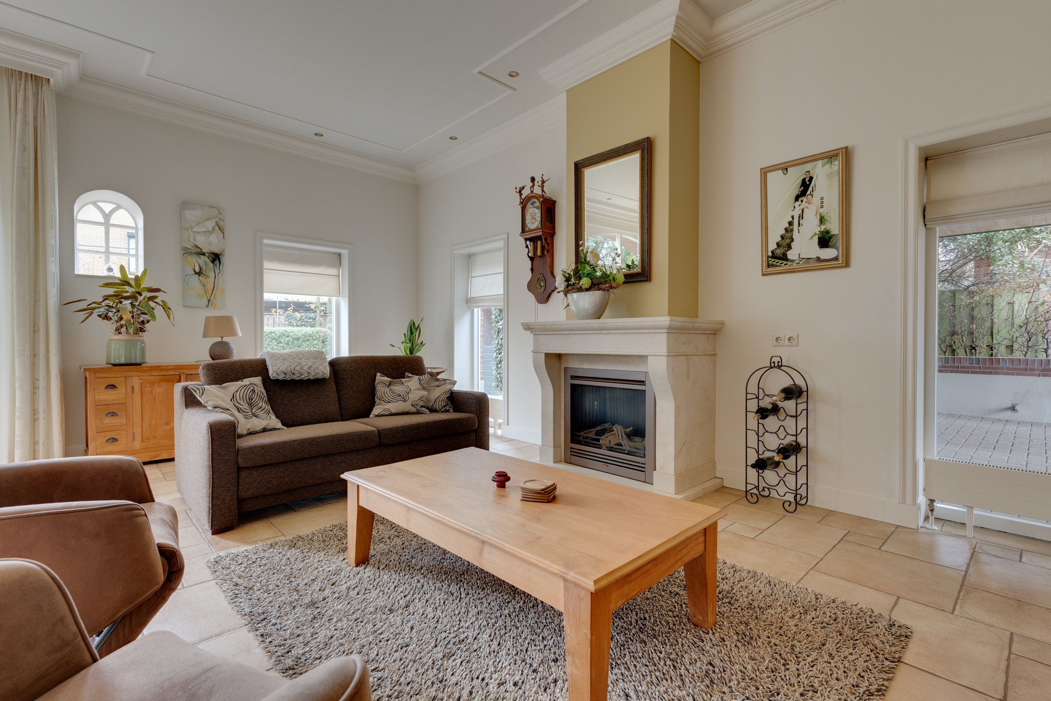 BEGANE GROND: Entree/hal, meterkast en trapopgang; slaapkamer met badkamer en suite voorzien van hoekbad, douche, hangtoilet en twee wastafels; slaapkamer met badkamer en suite voorzien van inloopdouche en wastafel; toilet; bijkeuken met groot keukenblok en aansluitingen voor wasmachine en droger; kantoorruimte; tuingerichte woonkamer met gashaard, schouw, openslaande deuren en woonkeuken met inbouwapparatuur (o.a. keramische kookplaat; schouw met afzuigkap, combi-magnetron, vaatwasser en koelkast).