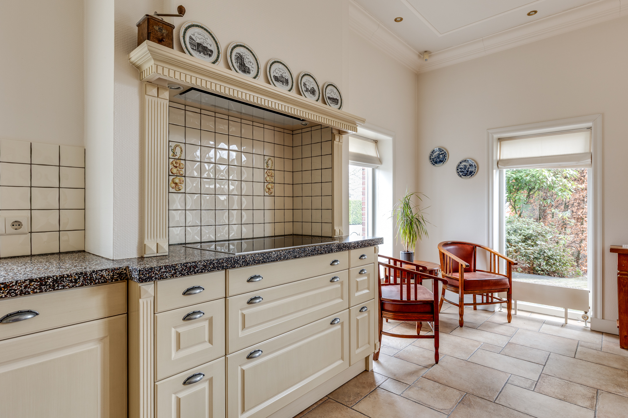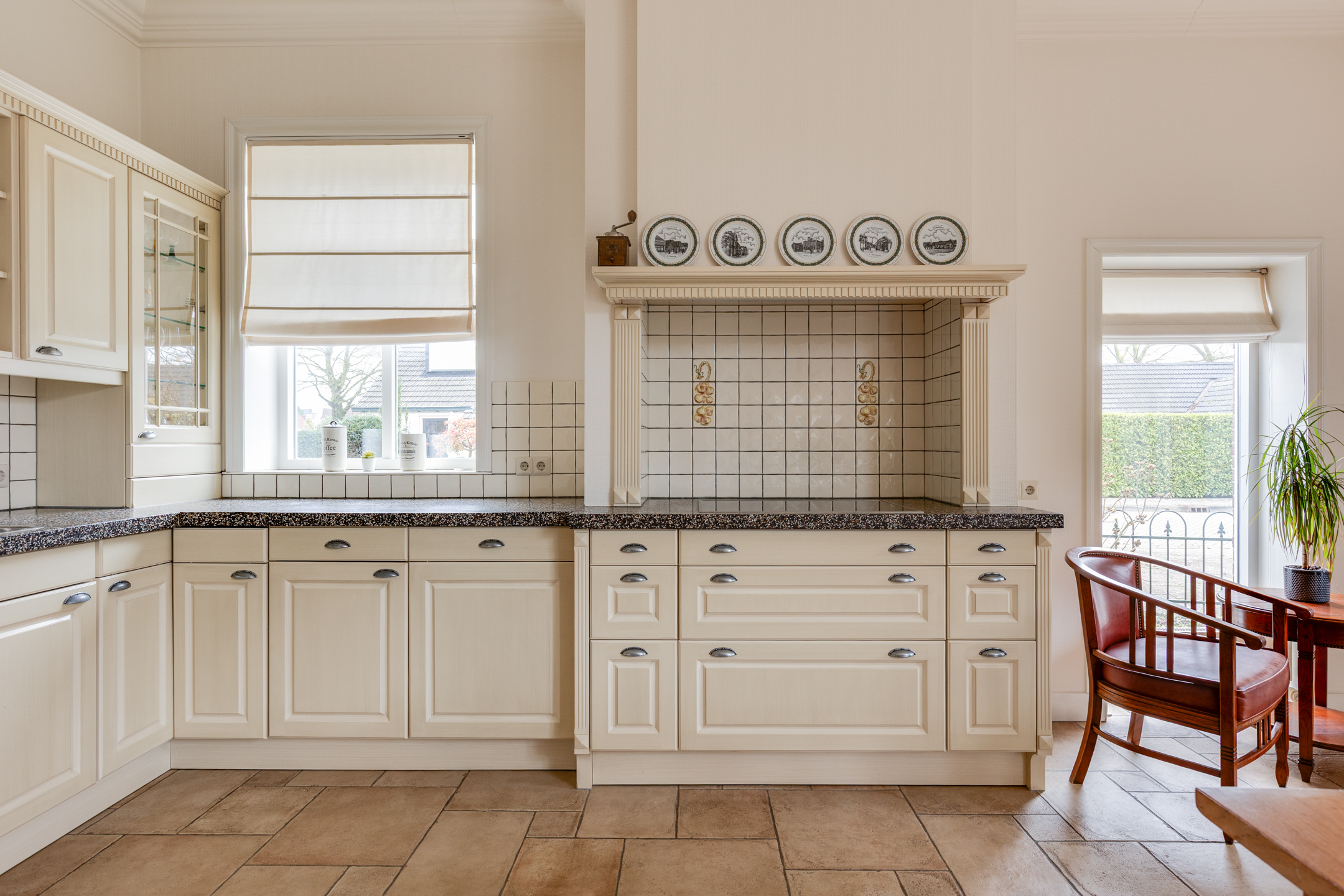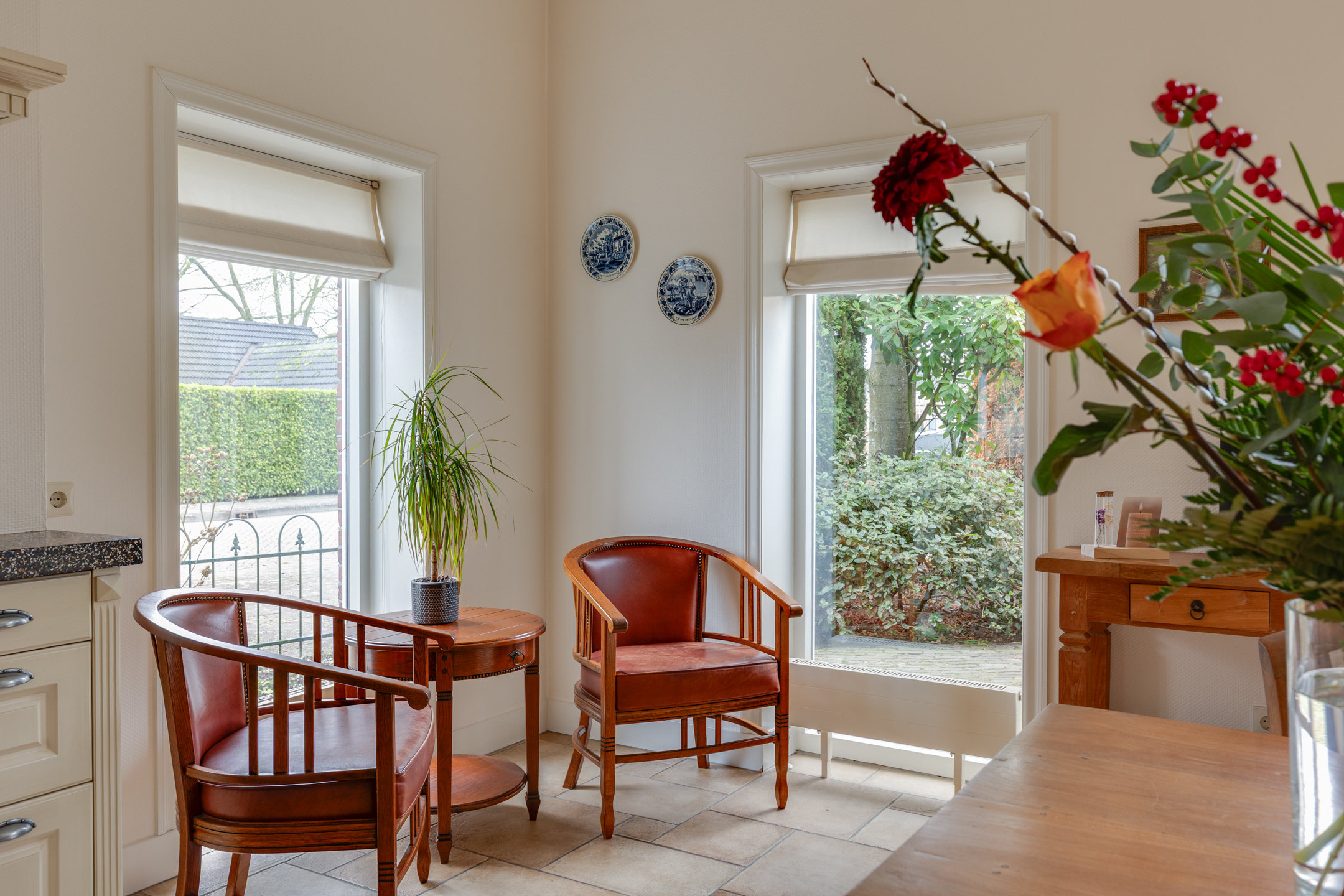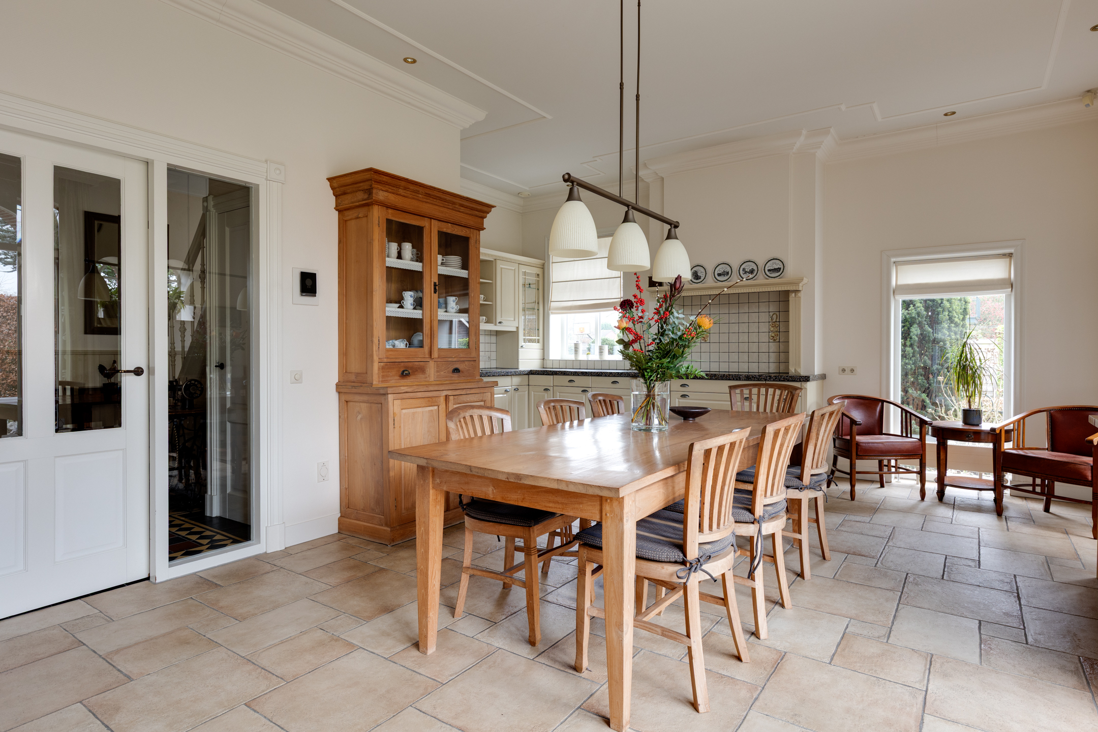 Op de begane grond bevinden zich twee slaapkamers met eigen badkamers en-suite. De ruime entree/hal met mooie tegelvloer biedt toegang naar de woonkamer met openslaande deuren naar de achtertuin en staat in verbinding met de sfeervolle open keuken met schouw en eethoek. Daarnaast bevindt zich op de begane grond de praktische bijkeuken met een groot keukenblok en achterentree en kantoorruimte.